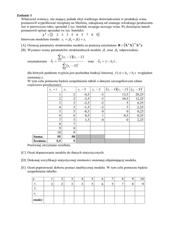 Zadanie 1 Właściciel winnicy, nie mający jednak zbyt wielkiego doświadczenia w produkcji wina, postanowił wypróbować recepturę na Merlota, zakupioną od znanego włoskiego producenta. Już w pierwszym roku, sprzedał 2 tys. butelek swojego nowego wina. Po dziesięciu latach postanowił opisać sprzedaż (w tys. butelek): y T = [2 2 3 3 5 6 5 7 8 9] liniowym modelem trendu: yt = β 0 + β 1t + ε t ( ) −1 [A] Oszacuj parametry strukturalne modelu za pomocą estymatora B = X T X X T y [B] Wyznacz oceny parametrów strukturalnych modelu β1 oraz β 0 odpowiednio n estymatorami bˆ1 = ∑ (x t =1 t − x )( y t − y ) n ∑ (x t =1 t − x) oraz bˆ0 = y − b1 x , 2 dla których punktem wyjścia jest pochodna funkcji liniowej f ( x) = b0 + b1 x względem zmiennej x. W tym celu pomocne będzie uzupełnienie tabeli z danymi szczegółowymi (dane częściowo przeliczone): xt = t yt xt − x yt − y (xt − x )( yt − y ) (xt − x )2 1 2 2 2 3 3 4 3 5 5 6 6 7 5 8 7 9 8 10 9 Suma: 55 50 Średnia: 5,5 5 Porównaj otrzymane rezultaty. -4,5 -3,5 -2,5 -1,5 -0,5 0,5 1,5 -3 -3 -2 -2 0 1 0 13,5 10,5 5 3 0 0,5 0 20,25 12,25 6,25 2,25 0,25 0,25 2,25 [C] Oceń dopasowanie modelu do danych statystycznych. [D] Dokonaj weryfikacji statystycznej istotności zmiennej objaśniającej modelu. [E] Oceń poprawność doboru postaci analitycznej modelu. W tym celu pomocne będzie uzupełnienie tabelki: t yt ŷ t et znaki: 1 2 3 4 5 6 7 8 9 10 2 2 3 3 5 6 5 7 8 9 Zadanie 2 Na podstawie 15 letnich obserwacji rocznych oszacowano estymatorem KMNK parametry strukturalne modelu popytu na herbatę, otrzymując (w nawiasach podano wartości standardowych błędów szacunku): yˆ t = 0,25 + 0,7 DR − 0,1CH + 0,04CK , gdzie: (0,28) (0,19) (1,24) (1,47) y t − sprzedaż detaliczna herbaty w danym roku w kg na mieszkańca DR − dochód realny na mieszkańca w danym roku w tys. zł CH oraz CK − cena realna odpowiednio za 1 kg herbaty oraz kawy, w danym roku [A] Dokonaj weryfikacji statystycznej istotności dochodu realnego jako zmiennej wyjaśniającej zmienność sprzedaży detalicznej herbaty. [B] Postawiono roboczą hipotezę, iż wzrost realnego dochodu na mieszkańca w ciągu najbliższego roku o tysiąc złotych, spowoduje w tym czasie wzrost sprzedaży detalicznej herbaty na mieszkańca o 1,2 kg. Dokonaj weryfikacji tej hipotezy na przyjętym poziomie istotności. Zadanie 3 Analizując związek pomiędzy miesięczną sprzedażą produkcji pewnego soku owocowego (yt, sprzedaż mierzona w tysiącach hektolitrów), a wydatkami na promocję w lokalnej prasie (x1t) oraz wydatkami na promocję radiową (x2t – wydatki mierzone w setkach tysięcy zł), zaproponowano następujący model: y t = β 0 + β 1 x1t + β 2 x 2t + ε t , który po oszacowaniu parametrów strukturalnych przyjął postać: yˆ t = −0,69 − 0,49 x1t + 2,52 x 2t . Wiedząc, iż w analizowanym okresie sprzedaż t 1 2 3 4 5 6 7 8 9 10 11 12 13 14 kształtowała się zgodnie z danymi zestawionymi w tabeli, należy ocenić yt 3 2 2 4 1 5 1 0 1 4 0 1 4 7 [A] istotność parametrów strukturalnych modelu oraz [B] dopasowanie modelu do danych empirycznych. W tym celu pomocne będą następujące informacje: 14 ∑ yˆ t =1 2 t = 115,29 , T (X X) −1 236 − 44 − 88 1 = − 44 76 − 48 400 − 88 − 48 104 Zadanie 4 Szacowano parametry strukturalne modelu spełniającego założenia KMRL: yt = β 0 + β1 x1t + β 2 x2t + ε t W wyniku podjętych prac, wykorzystując estymator dany KMNK uzyskano model regresji: yˆ t = 0,7 + 2,1x1t + 1,2 x2t . [A] Spośród przedstawionych poniżej wektorów reszt, wybierz ten, który Twoim zdaniem mógłby pełnić rolę wektora reszt zaprezentowanego modelu (uzasadnij odpowiedź): 1 2 3 4 5 6 7 8 9 10 11 12 2 3 -2 1 -4 3 -2 3 -1 2 -1 1 A e 2 1 -2 3 -4 2 3 -2 -3 4 -2 -2 B e 1 -2 3 -2 2 -1 3 -3 -1 3 -1 -2 C e [B] Dla wybranego wektora reszt dokonaj weryfikacji poprawności doboru postaci analitycznej modelu.