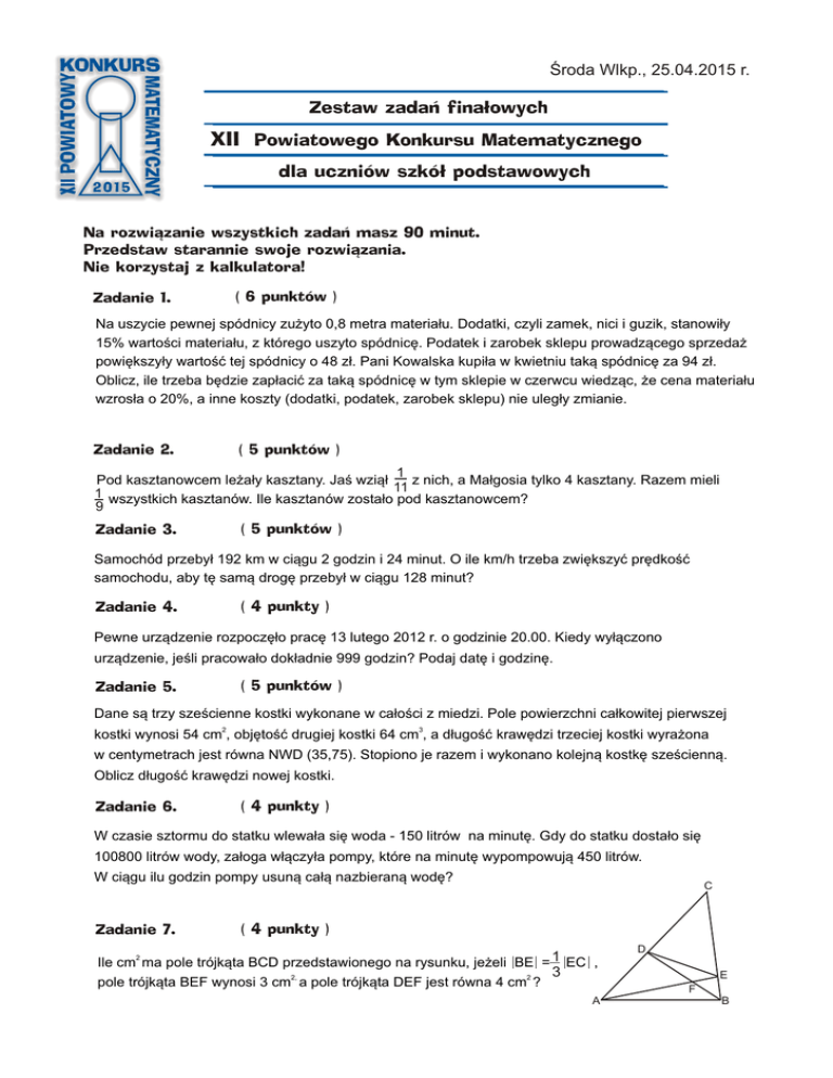 Środa Wlkp., 25.04.2015 r. Zestaw zadań finałowych XII Powiatowego Konkursu Matematycznego dla uczniów szkół podstawowych 2015 Na rozwiązanie wszystkich zadań masz 90 minut. Przedstaw starannie swoje rozwiązania. Nie korzystaj z kalkulatora! Zadanie 1. ( 6 punktów ) Na uszycie pewnej spódnicy zużyto 0,8 metra materiału. Dodatki, czyli zamek, nici i guzik, stanowiły 15% wartości materiału, z którego uszyto spódnicę. Podatek i zarobek sklepu prowadzącego sprzedaż powiększyły wartość tej spódnicy o 48 zł. Pani Kowalska kupiła w kwietniu taką spódnicę za 94 zł. Oblicz, ile trzeba będzie zapłacić za taką spódnicę w tym sklepie w czerwcu wiedząc, że cena materiału wzrosła o 20%, a inne koszty (dodatki, podatek, zarobek sklepu) nie uległy zmianie. Zadanie 2. ( 5 punktów ) 1 Pod kasztanowcem leżały kasztany. Jaś wziął z nich, a Małgosia tylko 4 kasztany. Razem mieli 11 1 wszystkich kasztanów. Ile kasztanów zostało pod kasztanowcem? 9 Zadanie 3. ( 5 punktów ) Samochód przebył 192 km w ciągu 2 godzin i 24 minut. O ile km/h trzeba zwiększyć prędkość samochodu, aby tę samą drogę przebył w ciągu 128 minut? Zadanie 4. ( 4 punkty ) Pewne urządzenie rozpoczęło pracę 13 lutego 2012 r. o godzinie 20.00. Kiedy wyłączono urządzenie, jeśli pracowało dokładnie 999 godzin? Podaj datę i godzinę. Zadanie 5. ( 5 punktów ) Dane są trzy sześcienne kostki wykonane w całości z miedzi. Pole powierzchni całkowitej pierwszej kostki wynosi 54 cm2, objętość drugiej kostki 64 cm3, a długość krawędzi trzeciej kostki wyrażona w centymetrach jest równa NWD (35,75). Stopiono je razem i wykonano kolejną kostkę sześcienną. Oblicz długość krawędzi nowej kostki. Zadanie 6. ( 4 punkty ) W czasie sztormu do statku wlewała się woda - 150 litrów na minutę. Gdy do statku dostało się 100800 litrów wody, załoga włączyła pompy, które na minutę wypompowują 450 litrów. W ciągu ilu godzin pompy usuną całą nazbieraną wodę? Zadanie 7. C ( 4 punkty ) Ile cm2 ma pole trójkąta BCD przedstawionego na rysunku, jeżeli BE = 1 EC , 3 pole trójkąta BEF wynosi 3 cm2, a pole trójkąta DEF jest równa 4 cm2 ? A D E F B