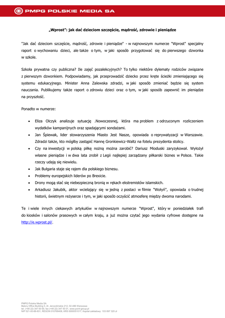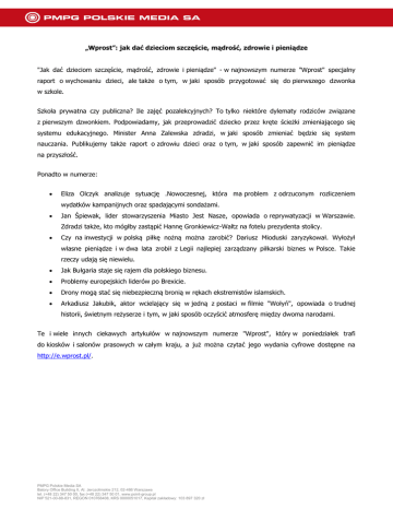 „Wprost”: jak dać dzieciom szczęście, mądrość, zdrowie i pieniądze "Jak dać dzieciom szczęście, mądrość, zdrowie i pieniądze" - w najnowszym numerze "Wprost" specjalny raport o wychowaniu dzieci, ale także o tym, w jaki sposób przygotować się do pierwszego dzwonka w szkole. Szkoła prywatna czy publiczna? Ile zajęć pozalekcyjnych? To tylko niektóre dylematy rodziców związane z pierwszym dzwonkiem. Podpowiadamy, jak przeprowadzić dziecko przez kręte ścieżki zmieniającego się systemu edukacyjnego. Minister Anna Zalewska zdradzi, w jaki sposób zmieniać będzie się system nauczania. Publikujemy także raport o zdrowiu dzieci oraz o tym, w jaki sposób zapewnić im pieniądze na przyszłość. Ponadto w numerze: Eliza Olczyk analizuje sytuację .Nowoczesnej, która ma problem z odrzuconym rozliczeniem wydatków kampanijnych oraz spadającymi sondażami. Jan Śpiewak, lider stowarzyszenia Miasto Jest Nasze, opowiada o reprywatyzacji w Warszawie. Zdradzi także, kto mógłby zastąpić Hannę Gronkiewicz-Waltz na fotelu prezydenta stolicy. Czy na inwestycji w polską piłkę nożną można zarobić? Dariusz Mioduski zaryzykował. Wyłożył własne pieniądze i w dwa lata zrobił z Legii najlepiej zarządzany piłkarski biznes w Polsce. Takie rzeczy udają się niewielu. Jak Bułgaria staje się rajem dla polskiego biznesu. Problemy europejskich liderów po Brexicie. Drony mogą stać się niebezpieczną bronią w rękach ekstremistów islamskich. Arkadiusz Jakubik, aktor wcielający się w jedną z postaci w filmie "Wołyń", opowiada o trudnej historii, świetnym reżyserze i tym, w jaki sposób oczyścić atmosferę między dwoma narodami. Te i wiele innych ciekawych artykułów w najnowszym numerze "Wprost", który w poniedziałek trafi do kiosków i salonów prasowych w całym kraju, a już można czytać jego wydania cyfrowe dostępne na http://e.wprost.pl/. PMPG Polskie Media SA Batory Office Building II, Al. Jerozolimskie 212, 02-486 Warszawa tel. (+48 22) 347 50 00, fax (+48 22) 347 50 01, www.point-group.pl NIP 521-00-88-831, REGON 010768408, KRS 0000051017, Kapitał zakładowy: 103 897 320 zł
