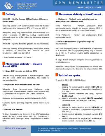 Nr 42 (102) – 2.11.2009 Debiuty Planowane debiuty – NewConnect 28.10.09 – Spółka Asseco SSE (debiut na Główny m Rynku GPW) -> Makowski - Martech może zadebiutować na NewConnect w I półroczu 2010 Kurs akcji Asseco South Eastern Europe wzrósł na otwarciu w pierwszym dniu notowań na GPW o 15 proc. do 16,1 zł. Firma Małkowski Martech, producent bram przeciwpożarowych, planuje na piewsze półrocze 2010 r. ofertę pr ywatną oraz debiut na r ynku NewConnect. Pieniądze z emisji akcji od inwestorów kwalifikowanych oraz emisji i pożyczki od EBOR-u, wedł ug wcześniejszych informacji, mają być w ykorzystane na planowane akwizycje w regionie. 30.10.09 – Spółka Serenity (debiut na NewConnect) Kurs akcji Serenity, spółki prowadzącej domy opieki, wzrósł na otwarciu w pierwszym dniu notowań na rynku NewConnect o 325 proc. do 0,17 zł. Firma Małkowski przeciwpożarowych. Martech jest producentem bram -> Dent-a-Medical chce w grudniu wejść na NewConnect Sieć klinik stomatologicznych Dent-a-Medical przeprowadzi w IV kwartale 2009 roku prywatną ofertę akcji o wartości ok. 1 mln zł. W połowie gr udnia spółka zadebiutuje na NewConnect Z emisji spół ka pozyskała 1,03 mln zł. Planowane debiuty – Główny Rynek GPW W ciągu dwóch kolejnych lat spół ka chce się przenieść na rynek regulowany. Pieniądze z emisji spółka chce przeznaczyć na rozwój sieci placówek franczyzowych. Docelowo ma ich powstać do 200. -> Grupa ZUE rozważa wejście na GPW Zakłady Usług Energetycznych i Komunikacyjnych Grupa ZUE do końca 2009 roku zdecydują, czy wejść na warszawską giełdę. -> Sophar ma może zadebiutować na GPW Bułgarska firma farmaceutyczna Sopharma może zadebiutować na warszawskiej giełdzie przed końcem 2009 r. - poinformował PAP prezes GPW Ludwik Sobolewski. Sopharma jest notowana na giełdzie bułgarskiej w Sofii. Sopharma byłaby pierwszą bułgarską spół ką notowaną na GPW. -> Debiut PDA PKO BP W dniu 3 listopada br. na Głównym Rynku GPW zadebiutują prawa do akcji nowej emisji PKO BP. Zakończona z sukcesem oferta banku jest jedną z największych w historii GPW. 2007 © GPW w Warszawie Tydzień na rynku W tygodniu 26.10-30.10.2009 indeksy: WIG20 osiągnął na koniec tygodnia poziom 2.274,72 pkt (spadek w porów naniu z poprzednim tygodniem o 5,70 proc.); średnia wartość obrotów (na sesję) wyniosła 1.186 mln zł; zawarto przeciętnie (na sesję) 21.275 transakcji - średnia wartość 1 transakcji to 27.878 zł; mWIG40 osiągnął na koniec tygodnia poziom 2.236,94 pkt (spadek w porów naniu z poprzednim tygodniem o 2,56 proc.); średnia wartość obrotów (na sesję) w yniosła 141 mln zł; zawarto przeciętnie (na sesję) 6.057 transakcji – średnia wartość 1 transakcji to 11.631 zł; Do tworzenia publikacji wykorzystano treści Serwisu Ekonomicznego Polskiej Agencji Prasowej SA 1 Nr 42 (102) – 2.11.2009 sWIG80 osiągnął na koniec tygodnia poziom 11.016,10 pkt (spadek w porów naniu z poprzednim tygodniem o 1,44 proc.); średnia wartość obrotów (na sesję) wyniosła 74 mln zł; zawarto przeciętnie (na sesję) 8.104 transakcji – średnia wartość 1 transakcji to 4.546 zł; 27.10.09 – Szkolenie nt. opcji giełdowych na GPW NC Index osiągnął na koniec tygodnia 48,17 pkt (wzrost w porównaniu z poprzednim tygodniem o 2,45 proc.) w porównaniu do wartości 47,02 pkt na zamknięcie poprzedniego tygodnia. 28.10.09 – Szkolenie nt. kontraktów walutowych w Łodzi Najwyższe tygodniowe zmiany kursów : Kurs z Kurs z Akcje 23-10-09 30-10-09 ERG 0,99 1,40 IPOPEMA 6,50 7,60 Zmiana (%) 41,41 16,92 BEEFSAN JUTRZENKA ERGIS 13,33 12,41 12,28 0,30 4,19 2,85 0,34 4,71 3,20 W ubiegłym tygodniu wszystkie spółki zanotowały ujemną stopę zwrotu. Najmniej stracił y spółki z branży informatycznej (spadek o 0,86 proc.), najwięcej zaś spółki telekomunikacyjnej (spadek o 7,96 proc.). GPW -> WSEInfoEngine S.A. przeprowadzi 1 transmisję internetową W najbliższej przyszłości WSEInfoEngine S.A. przeprowadzi 1 transmisję internetową. Informacje o transmisjach: Data transmisji Nazwa spół ki 2009.11.06 Bank Millennium Temat transmisji Prezentacja w yników finansow ych 27 października w siedzibie GPW odbyło się szkolenie nt opcji giełdow ych "Opcje - podstawy, strategie, inwestycje". Szkolenie poprowadzili specjaliści z Giełdy oraz Domu Maklerskiego BOŚ S.A. Więcej informacji na stronie www.fer k.pl. 28 października w Łodzi Giełda we współpracy z Domem Maklerskim BOŚ S.A. przeprowadziła szkolenie z cyklu „Kontrakty walutowe – jak zrozumieć rynek walutow y i wykorzystać tę wiedzę w praktyce”. Więcej informacji na stronie www.fer k.pl. 29.10.09 – SecurAsset Debiut obligacji strukturyzowanych 29 października na rynku równoległym GPW zadebiutował y obligacje str uktur yzowane WIG20 Profit 2 emitenta SecurAsset S.A. -> Road-Show w Republice Czeskiej w dniach 3- 5 listopada W dniach 3-5 listopada GPW wraz z Partnerami organizuje Road-Show w Czeskiej Republice w celu promocji polskiego rynku giełdowego oraz platformy NewConnect wśród inwestorów i potencjalnych emitentów. Więcej informacji na stronie www.newconnect.pl -> Szkolenie nt. kontraktów terminowych 5 listopada w siedzibie GPW odbędzie się szkolenie pt. „Kontrakty terminowe na GPW - czym są i jak je wykorzystywać w praktyce”. Szkolenie prowadzone będzie przez Giełdę we współpracy z Beskidzkim Domem Maklerskim S.A. Organizatorem szkolenia jest Fundacja Edukacji Rynku Kapitałowego. Informacje na temat kolejnych szkoleń można znaleźć na s tronie www.fer k.pl. 2007 © GPW w Warszawie Do tworzenia publikacji wykorzystano treści Serwisu Ekonomicznego Polskiej Agencji Prasowej SA 2 Nr 42 (102) – 2.11.2009 -> Konferencja prasowa nt. COLCA CONDOR 2009 Zarząd Giełdy Papierów War tościow ych w Warszawie oraz Pan Jerzy Majcherczyk, Kierownik Wyprawy COLCA CONDOR 2009, mają przyjemność zaprosić Państwa na fina