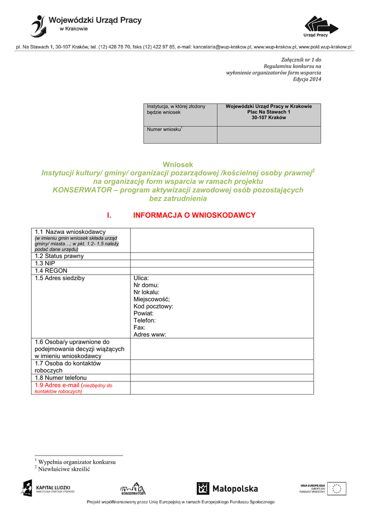 Załącznik nr 1 do Regulaminu konkursu na wyłonienie organizatorów form wsparcia Edycja 2014 Instytucja, w której złożony będzie wniosek Wojewódzki Urząd Pracy w Krakowie Plac Na Stawach 1 30-107 Kraków Numer wniosku1 Wniosek Instytucji kultury/ gminy/ organizacji pozarządowej /kościelnej osoby prawnej2 na organizację form wsparcia w ramach projektu KONSERWATOR – program aktywizacji zawodowej osób pozostających bez zatrudnienia I. INFORMACJA O WNIOSKODAWCY 1.1 Nazwa wnioskodawcy (w imieniu gmin wniosek składa urząd gminy/ miasta…; w pkt. 1.2- 1.5 należy podać dane urzędu) 1.2 Status prawny 1.3 NIP 1.4 REGON 1.5 Adres siedziby 1.6 Osoba/y uprawnione do podejmowania decyzji wiążących w imieniu wnioskodawcy 1.7 Osoba do kontaktów roboczych 1.8 Numer telefonu 1.9 Adres e-mail (niezbędny do kontaktów roboczych) 1 2 Wypełnia organizator konkursu Niewłaściwe skreślić Ulica: Nr domu: Nr lokalu: Miejscowość; Kod pocztowy: Powiat: Telefon: Fax: Adres www: II. OFERTA ZATRUDNIENIA SUBSYDIOWANEGO NA ROK 2014 Uwaga: Dla każdego przewidywanego stanowiska należy opracować odrębną charakterystykę, nadając jej kolejną literę alfabetu. Każda z ofert na dane stanowisko będzie oceniana odrębnie. W uzasadnionych przypadkach – wynikających ze specyfiki kryteriów oceny merytorycznej - wnioskodawca może stworzyć więcej niż jedną ofertę na dane stanowisko, np.: - miejsca wykonywania pracy dla danego stanowiska znajdują się na terenie więcej niż jednego powiatu (powiązanie z kryterium oceny merytorycznej „Zdobycie bądź odnowienie przez uczestników projektu umiejętności potrzebnych na lokalnym rynku pracy). - dane stanowisko powiązane jest z kilkoma aspektami działalności wnioskodawcy – część osób planowanych na dane stanowisko zajmuje się działaniami „standardowymi”, część wykonuje zadania w ramach nowych inicjatywy/ projektów wnioskodawcy (powiązanie z kryterium oceny merytorycznej „Ranga działań realizowanych na stanowisku dla strategii działania instytucji/ nowych inicjatyw”). Pracodawca3: II. A. Nazwa stanowiska: 1. Rodzaj stanowiska: - Stanowisko administracyjne (uwaga: łączna liczba osób przewidzianych na stanowiska administracyjne nie może przekraczać 20% łącznej liczby osób przewidzianych na wszystkie stanowiska w ramach zatrudnienia subsydiowanego na rok 2014) 2. Liczba osób stanowisko: 3. Miejsce wykonywania pracy: 4. Rodzaj obiektu, przy wykonywane będą prace: 5. przewidywanych którym wykonywanych Nazwa obiektu: 5 Status: Ulica: Nr domu: Nr lokalu: Kod pocztowy, Miejscowość: Powiat: - obiekt lub zespół obiektów zabytkowych - przestrzeń publiczna - miejsce wydarzeń historycznych - zabytki archeologiczne 6 - nie dotyczy Informacje o dysponencie obiektu Zakres zadań stanowisku: 4 na (wypełnić tylko w przypadku, gdy oferent nie jest dysponentem obiektu; uwaga: konieczność dołączenia jako załącznika umowy/listu intencyjnego pomiędzy oferentem a dysponentem) 6. - Stanowisko merytoryczne Nazwa dysponenta obiektu: Status prawny: na Strona Należy wpisać dane wnioskodawcy z pkt. 1.1 wniosku. W przypadku rekomendowania oferty będzie ona upubliczniona w procesie rekrutacji bez modyfikacji ze strony Organizatora konkursu. 4 Podkreślić właściwe 5 Właściciel obiektu 6 Podkreślić właściwe 2 3 7. Planowana efektywność pracy należy uzasadnić potrzebę zatrudnienia na danym stanowisku wskazanej liczby osób poprzez: - podanie wymiernych rezultatów ich pracy, które będą osiągnięte po 5 miesiącach zatrudnienia i/lub; - podanie proponowanego harmonogramu prac w podziale na miesiące7; 8. Na ile planowane stanowisko wpisuje się w strategię działania wnioskodawcy, tym w nowe projekty i inicjatywy? (strategia działania instytucji to ciąg długofalowych działań skierowanych na osiągnięcie konkretnych, wymiernych celów. Strategia ≠ statut instytucji) 8 Oczekiwania, co do wymagań kwalifikacyjnych : 9. Wykształcenie: Niezbędne: … Pożądane:… 10. Doświadczenie zawodowe: Niezbędne: … Pożądane:… 11. Umiejętności: Niezbędne: … Pożądane:… 12. Cechy osobowe: Niezbędne: … Pożądane:… 13. Oferta jest kierowana również do osób z niepełnosprawnością 14. Umiejętności, które osoba nabędzie na stanowisku: 15. Sposób wprowadzenia osoby na stanowisko - Nie 9 - Tak - Wstępne wymagania dotyczące sprawności kandydata (np. stopień sprawności fizycznej, intelektualnej, wzroku, słuchu, odporność na stres itp.) ……….. Harmonogram może być także opisany w pkt. 6 oferty „zakres zadań wykonywanych na stanowisku”. Jeśli w danej kategorii wnioskodawca nie określa wymagań minimalnych należy wpisać informację „brak wymagań”. Informacja o kwalifikacjach pożądanych nie jest wymagana. 9 Podkreślić właściwe 8 Strona 7 3 (szkolenia wewnętrzne, instruktaże, planowane szkolenia zewnętrzne, sprzęt/ wyposażenie stanowiska pracy) 16. Sposób nadzoru/ monitorowania pracy na stanowisku: (w jaki sposób pracodawca planuje śledzić postępy prac, monitorować rozwój umiejętności zawodowych uczestników, itp.) 17. Sposób organizacji pracy – czas pracy; np. Czy stanowisko wymaga dyspozycyjności w soboty/ niedzielę/ święta? 18. Czy istnieje możliwość zatrudnienia uczestnika/ów projektu przez Wnioskodawcę po zakończeniu ich udziału w projekcie? - Nie; 10 - Tak , deklarowana liczba osób: …. Wymagania odnośnie warunków zatrudnienia: minimalny czas zatrudnienia: 3 miesiące; zatrudnienie najpóźniej od kwietnia 2015 r. umowa o pracę/umowa zlecenie (brak wymogów odnośnie wymiaru etatu) 19. Dodatkowe informacje, które mogą być istotne przy ocenie oferty: Pracodawca11: II. B. Nazwa stanowiska: 1. Rodzaj stanowiska: - Stanowisko administracyjne (uwaga: łączna liczba osób przewidzianych na stanowiska administracyjne nie może przekraczać 20% łącznej liczby osób przewidzianych na wszystkie stanowiska w rama