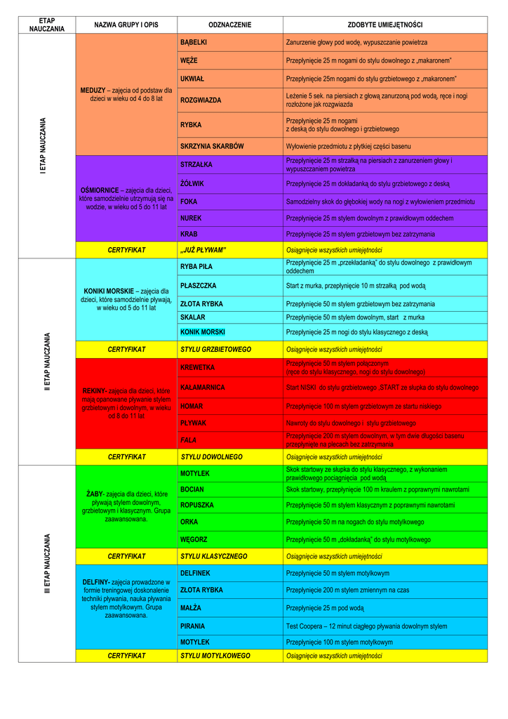 ETAP NAUCZANIA NAZWA GRUPY I OPIS I ETAP NAUCZANIA MEDUZY – zajęcia od podstaw dla dzieci w wieku od 4 do 8 lat ODZNACZENIE BĄBELKI Zanurzenie głowy pod wodę, wypuszczanie powietrza WĘŻE Przepłynięcie 25 m nogami do stylu dowolnego z „makaronem” UKWIAŁ Przepłynięcie 25m nogami do stylu grzbietowego z „makaronem” ROZGWIAZDA Leżenie 5 sek. na piersiach z głową zanurzoną pod wodą, ręce i nogi rozłożone jak rozgwiazda RYBKA Przepłynięcie 25 m nogami z deską do stylu dowolnego i grzbietowego SKRZYNIA SKARBÓW Wyłowienie przedmiotu z płytkiej części basenu STRZAŁKA Przepłynięcie 25 m strzałką na piersiach z zanurzeniem głowy i wypuszczaniem powietrza ŻÓŁWIK OŚMIORNICE – zajęcia dla dzieci, które samodzielnie utrzymują się na FOKA wodzie, w wieku od 5 do 11 lat CERTYFIKAT II ETAP NAUCZANIA KONIKI MORSKIE – zajęcia dla dzieci, które samodzielnie pływają, w wieku od 5 do 11 lat CERTYFIKAT REKINY- zajęcia dla dzieci, które mają opanowane pływanie stylem grzbietowym i dowolnym, w wieku od 8 do 11 lat CERTYFIKAT III ETAP NAUCZANIA ŻABY- zajęcia dla dzieci, które pływają stylem dowolnym, grzbietowym i klasycznym. Grupa zaawansowana. CERTYFIKAT DELFINY- zajęcia prowadzone w formie treningowej doskonalenie techniki pływania, nauka pływania stylem motylkowym. Grupa zaawansowana. CERTYFIKAT ZDOBYTE UMIEJĘTNOŚCI Przepłynięcie 25 m dokładanką do stylu grzbietowego z deską Samodzielny skok do głębokiej wody na nogi z wyłowieniem przedmiotu NUREK Przepłynięcie 25 m stylem dowolnym z prawidłowym oddechem KRAB Przepłynięcie 25 m stylem grzbietowym bez zatrzymania „JUŻ PŁYWAM” Osiągnięcie wszystkich umiejętności RYBA PIŁA Przepłynięcie 25 m „przekładanką” do stylu dowolnego z prawidłowym oddechem PŁASZCZKA Start z murka, przepłynięcie 10 m strzałką pod wodą ZŁOTA RYBKA Przepłynięcie 50 m stylem grzbietowym bez zatrzymania SKALAR Przepłynięcie 50 m stylem dowolnym, start z murka KONIK MORSKI Przepłynięcie 25 m nogi do stylu klasycznego z deską STYLU GRZBIETOWEGO Osiągnięcie wszystkich umiejętności KREWETKA Przepłynięcie 50 m stylem połączonym (ręce do stylu klasycznego, nogi do stylu dowolnego) KAŁAMARNICA Start NISKI do stylu grzbietowego ,START ze słupka do stylu dowolnego HOMAR Przepłynięcie 100 m stylem grzbietowym ze startu niskiego PŁYWAK Nawroty do stylu dowolnego i stylu grzbietowego FALA Przepłynięcie 200 m stylem dowolnym, w tym dwie długości basenu przepłynięte na plecach bez zatrzymania STYLU DOWOLNEGO Osiągnięcie wszystkich umiejętności MOTYLEK Skok startowy ze słupka do stylu klasycznego, z wykonaniem prawidłowego pociągnięcia pod wodą BOCIAN Skok startowy, przepłynięcie 100 m kraulem z poprawnymi nawrotami ROPUSZKA Przepłynięcie 50 m stylem klasycznym z poprawnymi nawrotami ORKA Przepłynięcie 50 m na nogach do stylu motylkowego WĘGORZ Przepłynięcie 50 m „dokładanką” do stylu motylkowego STYLU KLASYCZNEGO Osiągnięcie wszystkich umiejętności DELFINEK Przepłynięcie 50 m stylem motylkowym ZŁOTA RYBKA Przepłynięcie 200 m stylem zmiennym na czas MAŁŻA Przepłynięcie 25 m pod wodą PIRANIA Test Coopera – 12 minut ciągłego pływania dowolnym stylem MOTYLEK Przepłynięcie 100 m stylem motylkowym STYLU MOTYLKOWEGO Osiągnięcie wszystkich umiejętności