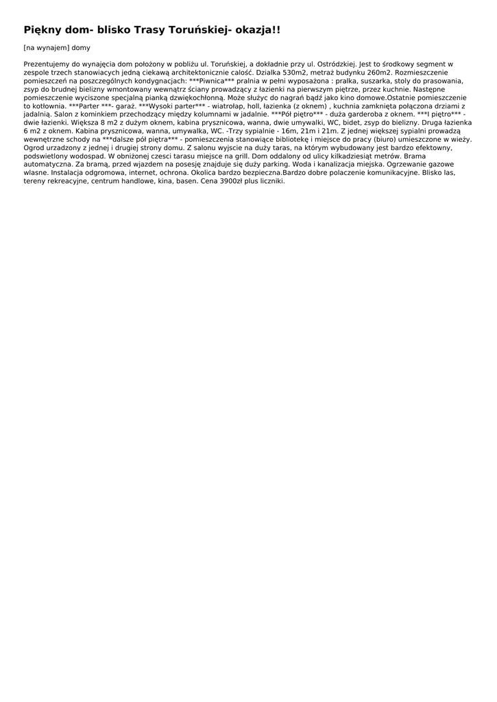 Piękny dom- blisko Trasy Toruńskiej- okazja!! [na wynajem] domy Prezentujemy do wynajęcia dom położony w pobliżu ul. Toruńskiej, a dokładnie przy ul. Ostródzkiej. Jest to środkowy segment w zespole trzech stanowiacych jedną ciekawą architektonicznie calość. Dzialka 530m2, metraż budynku 260m2. Rozmieszczenie pomieszczeń na poszczególnych kondygnacjach: ***Piwnica*** pralnia w pełni wyposażona : pralka, suszarka, stoly do prasowania, zsyp do brudnej bielizny wmontowany wewnątrz ściany prowadzący z łazienki na pierwszym piętrze, przez kuchnie. Następne pomieszczenie wyciszone specjalną pianką dzwiękochłonną. Może służyc do nagrań bądź jako kino domowe.Ostatnie pomieszczenie to kotłownia. ***Parter ***- garaż. ***Wysoki parter*** - wiatrołap, holl, łazienka (z oknem) , kuchnia zamknięta połączona drziami z jadalnią. Salon z kominkiem przechodzący między kolumnami w jadalnie. ***Pół piętro*** - duża garderoba z oknem. ***I piętro*** dwie łazienki. Większa 8 m2 z dużym oknem, kabina prysznicowa, wanna, dwie umywalki, WC, bidet, zsyp do bielizny. Druga łazienka 6 m2 z oknem. Kabina prysznicowa, wanna, umywalka, WC. -Trzy sypialnie - 16m, 21m i 21m. Z jednej większej sypialni prowadzą wewnętrzne schody na ***dalsze pół piętra*** - pomieszczenia stanowiące bibliotekę i miejsce do pracy (biuro) umieszczone w wieży. Ogrod urzadzony z jednej i drugiej strony domu. Z salonu wyjscie na duży taras, na którym wybudowany jest bardzo efektowny, podswietlony wodospad. W obniżonej czesci tarasu miejsce na grill. Dom oddalony od ulicy kilkadziesiąt metrów. Brama automatyczna. Za bramą, przed wjazdem na posesję znajduje się duży parking. Woda i kanalizacja miejska. Ogrzewanie gazowe wlasne. Instalacja odgromowa, internet, ochrona. Okolica bardzo bezpieczna.Bardzo dobre polaczenie komunikacyjne. Blisko las, tereny rekreacyjne, centrum handlowe, kina, basen. Cena 3900zł plus liczniki. Informacje dodatkowe Rodzaj domy Powierzchnia 260 Powierzchnia działki 530 Liczba pięter 1 Pokoje 3 Adres ogłoszenia http://sprzedam-mieszkanie.com/piekny-dom-blisko-trasy-torunskiej-okazja,o460 Kontakt Mail: Telefon: 513 022 310 Lokalizacja , Warszawa - () Ogłoszenie dodano: 2016-10-06 15:54:12 Ogłoszenie wygasa: 2016-12-06 15:54:12 Powered by TCPDF (www.tcpdf.org)
