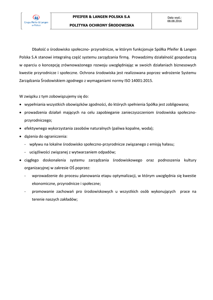 PFEIFER & LANGEN POLSKA S.A Data wyd.: 08.08.2016 POLITYKA OCHRONY ŚRODOWISKA Dbałość o środowisko społeczno- przyrodnicze, w którym funkcjonuje Spółka Pfeifer & Langen Polska S.A stanowi integralną część systemu zarządzania firmą. Prowadzimy działalność gospodarczą w oparciu o koncepcję zrównoważonego rozwoju uwzględniając w swoich działaniach biznesowych kwestie przyrodnicze i społeczne. Ochrona środowiska jest realizowana poprzez wdrożenie Systemu Zarządzania Środowiskiem zgodnego z wymaganiami normy ISO 14001:2015. W związku z tym zobowiązujemy się do: wypełniania wszystkich obowiązków zgodności, do których spełnienia Spółka jest zobligowana; prowadzenia działań mających na celu zapobieganie zanieczyszczeniom środowiska społecznoprzyrodniczego; efektywnego wykorzystania zasobów naturalnych (paliwa kopalne, woda); dążenia do ograniczenia: - wpływu na lokalne środowisko społeczno-przyrodnicze związanego z emisją hałasu; - uciążliwości związanej z wytwarzaniem odpadów; ciągłego doskonalenia systemu zarządzania środowiskowego oraz podnoszenia kultury organizacyjnej w zakresie OŚ poprzez: - wprowadzenie do procesu planowania etapu optymalizacji, w którym uwzględnia się kwestie ekonomiczne, przyrodnicze i społeczne; - promowanie zachowań pro środowiskowych u wszystkich osób wykonujących terenie naszych zakładów; prace na