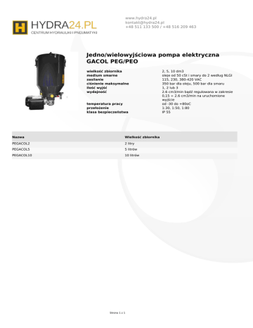 www.hydra24.pl [email protected] +48 511 133 500 / +48 516 209 463 Jedno/wielowyjściowa pompa elektryczna GACOL PEG/PEO wielkość zbiornika medium smarne zasilanie ciśnienie maksymalne ilość wyjść wydajność temperatura pracy przełożenie klasa bezpieczeństwa Nazwa Wielkość zbiornika PEGACOL2 2 litry PEGACOL5 5 litrów PEGACOL10 10 litrów Strona 1 z 1 2, 5, 10 dm3 oleje od 50 cSt i smary do 2 według NLGI 115, 230, 380-420 VAC 350 bar dla oleju, 500 bar dla smaru 1, 2 lub 3 2.6 cm3/min bądź regulowana w zakresie 0,15 ÷ 2.6 cm3/min na uruchomione wyjście od -30 do +80oC 1:30, 1:50, 1:80 IP 55