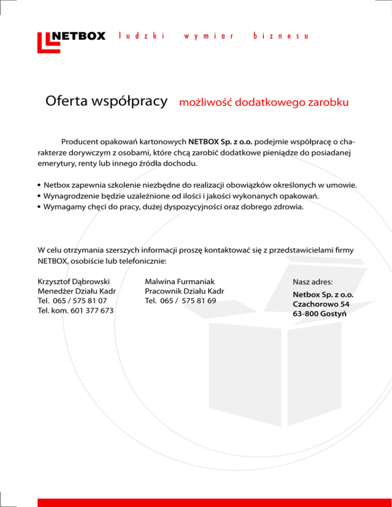 Oferta współpracy możliwość dodatkowego zarobku Producent opakowań kartonowych NETBOX Sp. z o.o. podejmie współpracę o charakterze dorywczym z osobami, które chcą zarobić dodatkowe pieniądze do posiadanej emerytury, renty lub innego źródła dochodu. • Netbox zapewnia szkolenie niezbędne do realizacji obowiązków określonych w umowie. • Wynagrodzenie będzie uzależnione od ilości i jakości wykonanych opakowań. • Wymagamy chęci do pracy, dużej dyspozycyjności oraz dobrego zdrowia. W celu otrzymania szerszych informacji proszę kontaktować się z przedstawicielami firmy NETBOX, osobiście lub telefonicznie: Krzysztof Dąbrowski Menedżer Działu Kadr Tel. 065 / 575 81 07 Tel. kom. 601 377 673 Malwina Furmaniak Pracownik Działu Kadr Tel. 065 / 575 81 69 Nasz adres: Netbox Sp. z o.o. Czachorowo 54 63-800 Gostyń