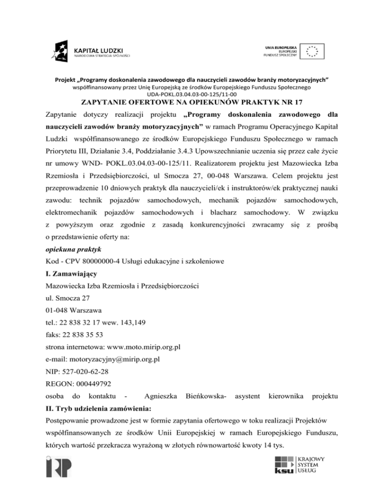 Projekt „Programy doskonalenia zawodowego dla nauczycieli zawodów branży motoryzacyjnych” współfinansowany przez Unię Europejską ze środków Europejskiego Funduszu Społecznego UDA-POKL.03.04.03-00-125/11-00 ZAPYTANIE OFERTOWE NA OPIEKUNÓW PRAKTYK NR 17 Zapytanie dotyczy realizacji projektu „Programy doskonalenia zawodowego dla nauczycieli zawodów branży motoryzacyjnych” w ramach Programu Operacyjnego Kapitał Ludzki współfinansowanego ze środków Europejskiego Funduszu Społecznego w ramach Priorytetu III, Działanie 3.4, Poddziałanie 3.4.3 Upowszechnianie uczenia się przez całe życie nr umowy WND- POKL.03.04.03-00-125/11. Realizatorem projektu jest Mazowiecka Izba Rzemiosła i Przedsiębiorczości, ul Smocza 27, 00-048 Warszawa. Celem projektu jest przeprowadzenie 10 dniowych praktyk dla nauczycieli/ek i instruktorów/ek praktycznej nauki zawodu: technik pojazdów samochodowych, mechanik pojazdów samochodowych, elektromechanik pojazdów samochodowych i blacharz samochodowy. W związku z powyższym oraz zgodnie z zasadą konkurencyjności zwracamy się z prośbą o przedstawienie oferty na: opiekuna praktyk Kod - CPV 80000000-4 Usługi edukacyjne i szkoleniowe I. Zamawiający Mazowiecka Izba Rzemiosła i Przedsiębiorczości ul. Smocza 27 01-048 Warszawa tel.: 22 838 32 17 wew. 143,149 faks: 22 838 35 53 strona internetowa: www.moto.mirip.org.pl e-mail: [email protected] NIP: 527-020-62-28 REGON: 000449792 osoba do kontaktu - Agnieszka Bieńkowska- asystent kierownika projektu II. Tryb udzielenia zamówienia: Postępowanie prowadzone jest w formie zapytania ofertowego w toku realizacji Projektów współfinansowanych ze środków Unii Europejskiej w ramach Europejskiego Funduszu, których wartość przekracza wyrażoną w złotych równowartość kwoty 14 tys. Projekt „Programy doskonalenia zawodowego dla nauczycieli zawodów branży motoryzacyjnych” współfinansowany przez Unię Europejską ze środków Europejskiego Funduszu Społecznego UDA-POKL.03.04.03-00-125/11-00 euro zgodnie z zasadą konkurencyjności określoną w wytycznych w zakresie kwalifikowania wydatków w ramach Programu Operacyjnego Kapitał Ludzki. III. Opis przedmiotu zamówienia: Przedmiotem zamówienia jest usługa polegająca na wykonywaniu obowiązków Opiekuna praktyk w przedsiębiorstwie AUTO - CENTRUM GOLEMO Nowy Targ ul. Podtatrzańska 3 dla uczestników projektu „Programy doskonalenia zawodowego dla nauczycieli zawodów branży motoryzacyjnych” współfinansowanego przez Unię Europejską ze środków Europejskiego Funduszu Społecznego w ramach Poddziałania 3.4.3 Programu Operacyjnego Kapitał Ludzki. Uczestnikami projektu są nauczyciele i instruktorzy praktycznej nauki zawodu z branży motoryzacyjnej. Praktyka będzie zrealizowana w wymiarze 80 godzin przez okres 10 dni (po 8 godzin dziennie) w zawodach elektromechanik pojazdów samochodowych, mechanik pojazdów samochodowych lub technik pojazdów samochodowych dla trzech Uczestników projektu. Jeden opiekun zajmuje się 1-3 praktykantami. Do obowiązków opiekuna praktyk będzie należało: 1. zapoznanie uczestników z funkcjonowaniem przedsiębiorstwa oraz poszczególnych działów, 2. przeszkolenie uczestników praktyk w zakresie bezpieczeństwa i higieny pracy; przepisów przeciwpożarowych, 3. realizacja programu doskonalenia zawodowego w zawodach (załącznik nr.2) oraz jego dopasowanie do indywidualnych potrzeb każdego z uczestników projektu, oraz przedsiębiorstwa, 4. zapewnienie uczestnikowi praktyk wszelkich warunków i środków do prawidłowego odbycia praktyki zawodowej, 5. monitorowanie i ocena praktyki oraz postępów praktykanta, 6. uzupełnianie dzienniczków praktyk według instrukcji Zamawiającego, 7. umieszczenie w miejscu odbywania praktyki plakatu zawierającego informacji o projekcie, 8. pozostawanie w stałym kontakcie z zespołem projektu oraz zgłaszanie mu wszystkich pojawiających się utrudnień w realizacji praktyk. IV. Termin wykonania zamówienia Projekt „Programy doskonalenia zawodowego dla nauczycieli zawodów branży motoryzacyjnych” współfinansowany przez Unię Europejską ze środków Europejskiego Funduszu Społecznego UDA-POKL.03.04.03-00-125/11-00 Jedna osoba obiady w dniach: 29.01.2013 r., 30.01.2013 r., 31.01.2013 r., 02.02.2013 r., 05.02.2013 r., 06.02.2013 r., 09.02.2013 r., 12.02.2013 r., 13.02.2013 r., 14.02.2013 r. Druga osoba obiady w dniach 28.01.2013 r., 30.01.2013 r., 31.01.2013 r., 02.02.2013 r., 04.02.2013 r., 06.02.2013 r., 09.02.2013 r., 11.02.2013 r., 12.02.2013 r., 13.02.2013 r., V. Lokalizacja AUTO - CENTRUM GOLEMO Nowy Targ ul. Podtatrzańska 3 VI. Warunki składania ofert: Oferta musi zawierać CV lub opis doświadczenia i kwalifikacji osoby ubiegającej się stanowisko opiekuna praktyk z podpisaną klauzulą: „Wyrażam zgodę na przetwarzanie moich danych osobowych dla potrzeb projektu zgodnie z Ustawą o ochronie danych osobowych z 29.08.1997r.(Dz. Nr. 133 poz.833), ofertę należy: wysłać za pomocą poczty elektronicznej na adres mailowy: [email protected], lub wysłać pocztą tradycyjną na adres: Mazowiecka Izba Rzemiosła i Przedsiębiorczości, ul. Smocza 27, 01048 Warszawa z dopiskiem: „Programy doskonalenia zawodowego dla nauczycieli zawodów branży motoryzacyjnych” lub dostarczyć osobiście do siedziby MIRiP. Termin składania oferty do 24.01.2013 r. do godziny 16:00 (data wpłynięcia do biura). Oferta musi zawierać pisemną zgodę właściciela przedsiębiorstwa i/lub reprezentanta przedsiębiorstwa AUTO - CENTRUM GOLEMO Nowy Targ ul. Podtatrzańska 3 na realizację praktyk przez opiekuna w jego przedsiębiorstwie. O ewentualnym wyborze Wykonawca zostanie poinformowany pocztą elektroniczną lub listownie. VII. Kryteria oceny ofert Przy dokonywaniu wyboru najkorzystniejszej oferty Zamawiający stosować będzie następujące kryteria: 1. Osoba składająca ofertę musi posiadać pisemną zgodę właściciela/ reprezentanta przed