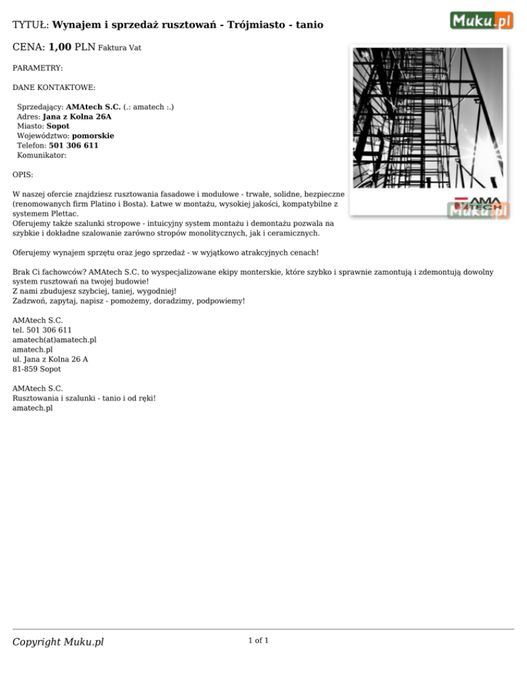 TYTUŁ: Wynajem i sprzedaż rusztowań - Trójmiasto - tanio CENA: 1,00 PLN Faktura Vat PARAMETRY: DANE KONTAKTOWE: Sprzedający: AMAtech S.C. (.: amatech :.) Adres: Jana z Kolna 26A Miasto: Sopot Województwo: pomorskie Telefon: 501 306 611 Komunikator: OPIS: W naszej ofercie znajdziesz rusztowania fasadowe i modułowe - trwałe, solidne, bezpieczne (renomowanych firm Platino i Bosta). Łatwe w montażu, wysokiej jakości, kompatybilne z systemem Plettac. Oferujemy także szalunki stropowe - intuicyjny system montażu i demontażu pozwala na szybkie i dokładne szalowanie zarówno stropów monolitycznych, jak i ceramicznych. Oferujemy wynajem sprzętu oraz jego sprzedaż - w wyjątkowo atrakcyjnych cenach! Brak Ci fachowców? AMAtech S.C. to wyspecjalizowane ekipy monterskie, które szybko i sprawnie zamontują i zdemontują dowolny system rusztowań na twojej budowie! Z nami zbudujesz szybciej, taniej, wygodniej! Zadzwoń, zapytaj, napisz - pomożemy, doradzimy, podpowiemy! AMAtech S.C. tel. 501 306 611 amatech(at)amatech.pl amatech.pl ul. Jana z Kolna 26 A 81-859 Sopot AMAtech S.C. Rusztowania i szalunki - tanio i od ręki! amatech.pl Copyright Muku.pl 1 of 1