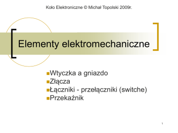 Koło Elektroniczne © Michał Topolski 2009r. Elementy elektromechaniczne Wtyczka a gniazdo Złącza Łączniki - przełączniki (switche) Przekaźnik 1 Złącza ARK Listy goldpinów Inne 2 Koło Elektroniczne © Michał Topolski 2009r. Złącza typu ARK ARK110/2RT ARK110/3RT 3 Koło Elektroniczne © Michał Topolski 2009r. Listwy goldpinów 4 Koło Elektroniczne © Michał Topolski 2009r. RS-232 – wtyk męski i żeński 5 Koło Elektroniczne © Michał Topolski 2009r. Łączniki (switches) Przyciski (push-buttons) Micro-switche Przełącznik hebelkowy i suwakowy Przełacznik on/off (toggle switch) Dip-switch Jumper (zwora) Kontaktron (reed switch) Przełącznik rtęciowy (mercury tilt switch) 6 Koło Elektroniczne © Michał Topolski 2009r. Organizacja połączeń (1) SPST SPDT Single Pole, Single Throw Single Pole, Double Throw 7 Koło Elektroniczne © Michał Topolski 2009r. Organizacja połączeń (2) DPST DPDT Double Pole, Single Throw Double Pole, Double Throw 8 Koło Elektroniczne © Michał Topolski 2009r. Przyciski 9 Koło Elektroniczne © Michał Topolski 2009r. Micro-switch 10 Koło Elektroniczne © Michał Topolski 2009r. Przełącznik hebelkowy i suwakowy 11 Koło Elektroniczne © Michał Topolski 2009r. Przełącznik on/off (toggle) 12 Koło Elektroniczne © Michał Topolski 2009r. Dip-switch + jumper 13 Koło Elektroniczne © Michał Topolski 2009r. Kontaktron 14 Koło Elektroniczne © Michał Topolski 2009r. Przełącznik rtęciowy 15 Koło Elektroniczne © Michał Topolski 2009r. Przekaźnik Oznaczenie Wygląd Budowa Zasada działania Zastosowanie w układzie Dioda przeciwosobna (zabezpieczająca) 16 Koło Elektroniczne © Michał Topolski 2009r. Oznaczenie 17 Koło Elektroniczne © Michał Topolski 2009r. Wygląd 18 Koło Elektroniczne © Michał Topolski 2009r. Budowa 19 Koło Elektroniczne © Michał Topolski 2009r. Zasada działania 20 Koło Elektroniczne © Michał Topolski 2009r. Zastosowanie w układzie 21 Koło Elektroniczne © Michał Topolski 2009r. Zagrożenia dla styków Iskrzenie przy przełączaniu Wypalanie styków Oscylacje przełączeniowe, okres stabilizacji 22 Koło Elektroniczne © Michał Topolski 2009r.