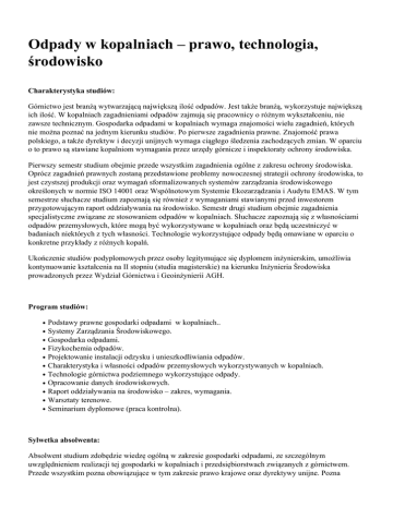 Odpady w kopalniach – prawo, technologia, środowisko Charakterystyka studiów: Górnictwo jest branżą wytwarzającą największą ilość odpadów. Jest także branżą, wykorzystuje największą ich ilość. W kopalniach zagadnieniami odpadów zajmują się pracownicy o różnym wykształceniu, nie zawsze technicznym. Gospodarka odpadami w kopalniach wymaga znajomości wielu zagadnień, których nie można poznać na jednym kierunku studiów. Po pierwsze zagadnienia prawne. Znajomość prawa polskiego, a także dyrektyw i decyzji unijnych wymaga ciągłego śledzenia zachodzących zmian. W oparciu o to prawo są stawiane kopalniom wymagania przez urzędy górnicze i inspektoraty ochrony środowiska. Pierwszy semestr studium obejmie przede wszystkim zagadnienia ogólne z zakresu ochrony środowiska. Oprócz zagadnień prawnych zostaną przedstawione problemy nowoczesnej strategii ochrony środowiska, to jest czystszej produkcji oraz wymagań sformalizowanych systemów zarządzania środowiskowego określonych w normie ISO 14001 oraz Wspólnotowym Systemie Ekozarządzania i Audytu EMAS. W tym semestrze słuchacze studium zapoznają się również z wymaganiami stawianymi przed inwestorem przygotowującym raport oddziaływania na środowisko. Semestr drugi studium obejmie zagadnienia specjalistyczne związane ze stosowaniem odpadów w kopalniach. Słuchacze zapoznają się z własnościami odpadów przemysłowych, które mogą być wykorzystywane w kopalniach oraz będą uczestniczyć w badaniach niektórych z tych własności. Technologie wykorzystujące odpady będą omawiane w oparciu o konkretne przykłady z różnych kopalń. Ukończenie studiów podyplomowych przez osoby legitymujące się dyplomem inżynierskim, umożliwia kontynuowanie kształcenia na II stopniu (studia magisterskie) na kierunku Inżynieria Środowiska prowadzonych przez Wydział Górnictwa i Geoinżynierii AGH. Program studiów: Podstawy prawne gospodarki odpadami w kopalniach.. Systemy Zarządzania Środowiskowego. Gospodarka odpadami. Fizykochemia odpadów. Projektowanie instalacji odzysku i unieszkodliwiania odpadów. Charakterystyka i własności odpadów przemysłowych wykorzystywanych w kopalniach. Technologie górnictwa podziemnego wykorzystujące odpady. Opracowanie danych środowiskowych. Raport oddziaływania na środowisko – zakres, wymagania. Warsztaty terenowe. Seminarium dyplomowe (praca kontrolna). Sylwetka absolwenta: Absolwent studium zdobędzie wiedzę ogólną w zakresie gospodarki odpadami, ze szczególnym uwzględnieniem realizacji tej gospodarki w kopalniach i przedsiębiorstwach związanych z górnictwem. Przede wszystkim pozna obowiązujące w tym zakresie prawo krajowe oraz dyrektywy unijne. Pozna Absolwent studium zdobędzie wiedzę ogólną w zakresie gospodarki odpadami, ze szczególnym uwzględnieniem realizacji tej gospodarki w kopalniach i przedsiębiorstwach związanych z górnictwem. Przede wszystkim pozna obowiązujące w tym zakresie prawo krajowe oraz dyrektywy unijne. Pozna wymagania stawiane przez normy środowiskowe oraz zakres zagadnień koniecznych do sporządzenia raportu oddziaływania na środowisko. Drugi blok programowy obejmuje zdobycie wiedzy w zakresie gospodarki odpadami, a w szczególności wykorzystywania odpadów górniczych i innych przemysłowych w różnych technologiach, głównie górniczych. Uzyska również wiedzę z zakresu technik odzysku surowców, jak i unieszkodliwiania odpadów. Studium pozwoli na zdobycie umiejętności przygotowania dokumentacji potrzebnych do spełnienia wymagań środowiskowych (ISO 14001, EMAS) oraz raportu oddziaływania na środowisko. Absolwent będzie umiał sporządzić projekt na podstawie, którego będą stosowane odpady w kopalni. Absolwenci studiów otrzymują świadectwo ukończenia studiów podyplomowych wystawione przez Akademię Górniczo-Hutniczą im. Stanisława Staszica w Krakowie zgodnie z wymogami Ministerstwa Nauki i Szkolnictwa Wyższego. Czas trwania: 2 semestry (od X 2016 r. do VI 2017 r.) Termin zgłoszeń: Od VI do IX 2016 r. Wymagane dokumenty odpis lub poświadczona kserokopia dyplomu ukończenia studiów inżynierskich, podanie o przyjęcie, kwestionariusz osobowy, karta zgłoszenia Formularze do pobrania w Sekretariacie KIŚiPS pawilon . A-1, pok. 15a lub na stronie http://www.kisips.agh.edu.pl/ Dokumenty należy złożyć osobiście lub przesłać przesyłką poleconą. Tryb zgłoszeń: O przyjęciu decyduje kolejność zgłoszeń. W przypadku wyczerpania limitu miejsc na daną edycję kolejność zgłoszeń kandydatów nieprzyjętych zostaje zachowana przy rekrutacji na następne edycje studiów. Liczba miejsc: 30 Miejsce zgłoszeń: AGH, Wydział Górnictwa i Geoinżynierii al. Mickiewicza 30, 30-059 Kraków Sekretariat KIŚiPS, pawilon A-1, pokój 15a Osoba przyjmująca zgłoszenia: Małgorzata Weklicz (tel. 12 617 27 59, e-mail: [email protected]) Opłaty: 3 400 zł Informacje dodatkowe: Zajęcia na studiach odbywają się co dwa tygodnie: w piątki (po południu od godz. 16.30) i w soboty. Organizator studiów podyplomowych: Wydział Górnictwa i Geoinżynierii Katedra Inżynierii Środowiska i Przeróbki Surowców Adres organizatora: al. Mickiewicza 30 30-059 Kraków pawilon A-1 , pokój 15a tel.: 12 617 27 59 fax: 12 617 27 59 e-mail: [email protected] Kierownik: prof. dr hab. inż. Alicja Uliasz-Bocheńczyk Osoby do kontaktu: prof. dr hab. inż. Alicja Uliasz-Bocheńczyk tel. 12 617 20 67 Małgorzata Weklicz tel.: 12 617 27 59 e-mail: [email protected]