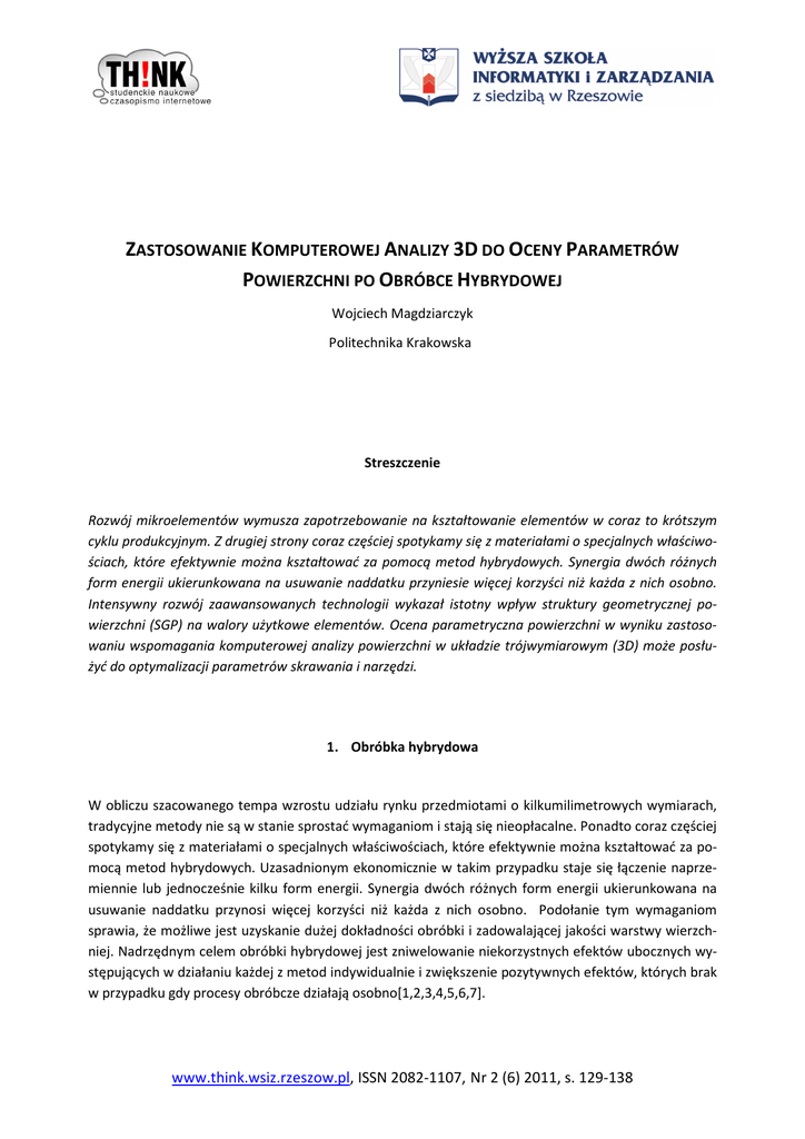 ZASTOSOWANIE KOMPUTEROWEJ ANALIZY 3D DO OCENY PARAMETRÓW POWIERZCHNI PO OBRÓBCE HYBRYDOWEJ Wojciech Magdziarczyk Politechnika Krakowska Streszczenie Rozwój mikroelementów wymusza zapotrzebowanie na kształtowanie elementów w coraz to krótszym cyklu produkcyjnym. Z drugiej strony coraz częściej spotykamy się z materiałami o specjalnych właściwościach, które efektywnie można kształtować za pomocą metod hybrydowych. Synergia dwóch różnych form energii ukierunkowana na usuwanie naddatku przyniesie więcej korzyści niż każda z nich osobno. Intensywny rozwój zaawansowanych technologii wykazał istotny wpływ struktury geometrycznej powierzchni (SGP) na walory użytkowe elementów. Ocena parametryczna powierzchni w wyniku zastosowaniu wspomagania komputerowej analizy powierzchni w układzie trójwymiarowym (3D) może posłużyć do optymalizacji parametrów skrawania i narzędzi. 1. Obróbka hybrydowa W obliczu szacowanego tempa wzrostu udziału rynku przedmiotami o kilkumilimetrowych wymiarach, tradycyjne metody nie są w stanie sprostać wymaganiom i stają się nieopłacalne. Ponadto coraz częściej spotykamy się z materiałami o specjalnych właściwościach, które efektywnie można kształtować za pomocą metod hybrydowych. Uzasadnionym ekonomicznie w takim przypadku staje się łączenie naprzemiennie lub jednocześnie kilku form energii. Synergia dwóch różnych form energii ukierunkowana na usuwanie naddatku przynosi więcej korzyści niż każda z nich osobno. Podołanie tym wymaganiom sprawia, że możliwe jest uzyskanie dużej dokładności obróbki i zadowalającej jakości warstwy wierzchniej. Nadrzędnym celem obróbki hybrydowej jest zniwelowanie niekorzystnych efektów ubocznych występujących w działaniu każdej z metod indywidualnie i zwiększenie pozytywnych efektów, których brak w przypadku gdy procesy obróbcze działają osobno[1,2,3,4,5,6,7]. www.think.wsiz.rzeszow.pl, ISSN 2082-1107, Nr 2 (6) 2011, s. 129-138 Zastosowanie komputerowej analizy 3D do oceny parametrów powierzchni po obróbce hybrydowej 1.1. Stan powierzchni po obróbce EDM Powierzchnia po obróbce EDM (ang. EDM – Electrical Discharge Machining) jest odwzorowaniem procesu wyładowań, jak również dokładności pozycjonowania mechanicznego układu. Błędy wg [1,4,5] wynikające z procesu obróbki można zniwelować, poprzez wzrost intensywności płukania szczeliny międzyelektrodowej. Można to uzyskać poprzez wymuszony przepływ dielektryka, zmniejszenie posuwu roboczego lub ruch drgającego elektrody. Struktura stereometryczna po obróbce przyjmuje matowy wygląd i tworzą ja kratery powstałe w zależności od prądu wyładowań wytworzonych przez generator (rys.1)1 Rys. 1 Struktura matowa z powstałymi kraterami, w wyniku wyładowań prądu. 1.2. Technika kształtowania SGP W następstwie oddziaływania energii zewnętrznej na powierzchnie wywoływane są zmiany struktury geometrycznej na wytworzonej powierzchni. Energia użyta do kształtowania SGP (Struktury Geometrycznej Powierzchni) może przybierać różne formy: strumieniowej (obróbka elektroerozyjna), chemicznej (roztwarzanie) lub o charakterze hybrydowym (synergia dwóch rodzajów energii). Powstająca w taki 1. 2. 3. 4. 5. 6. 7. 8. 9. K. E. Oczoś, Hybrydowe procesy obróbki ubytkowej- istota, przykładowe procesy, wyzwania rozwojowe, „Mechanik” 5-6/2000, s. 315÷324. K. E. Oczoś, Kształtowanie materiałów skoncentrowanymi strumieniami energii. Redakcja Wydawnictw Uczelnianych Politechniki Rzeszowskiej, Rzeszów 1988. K. E. Oczoś, Sposób kształtowania ubytkowego. Klasyfikacja i terminologia. „Mechanik”, 2/2005, s. 57÷59. A. Ruszaj, M. Chuchro, M. Zybura- Skrabalak, Niekonwencjonalne hybrydowe procesy wytwarzania elementów maszyn i narzędzi. Obróbka Ścierna Podstawy i Technika, Materiały XXIII Naukowej Szkoły Obróbki Ściernej, Rzeszów- Myczkowce, wrzesień 2000. A. Ruszaj, Procesy obróbek elektrochemicznej i elektroerozyjnej w różnych odmianach kinematycznych, „Zeszyty Naukowe IOS”, 76/1989. A. Ruszaj, Wybrane zagadnienia mikroobróbki elektrochemicznej i elektroerozyjnej, „Inż. Maszyn”, t.10, 3/2005. S. Skoczypiec, A. Ruszaj, Tendencje rozwojowe mikrotechnologii wytwarzania. Niekonwencjonalne metody wytwarzania, „Mechanik” 11/2009, s. 947. V. Liubimov, K.E. Oczoś, Wybrane zagadnienia kształtowania nierówności powierzchni w procesach obróbkowych, „Mechanik”, 3/1997, s. 81÷84. K.E. Oczoś, V. Liubimov Rozważania nad istotnością parametrów struktury geometrycznej powierzchni w układzie 3D, „Mechanik” 3/2008, s. 129÷137. 130 Zastosowanie komputerowej analizy 3D do oceny parametrów powierzchni po obróbce hybrydowej sposób struktura geometryczna powierzchni zależy od wiązki energii, którą cechuje niezdeterminowana geometria oraz procesu roztwarzania na granicy ziaren [1,8]. 2. Analiza SGP Struktura geometryczna powierzchni według normy [N1] to zbiór wszystkich nierówności powierzchni rzeczywistej, tj. odchyłek kształtu i położenia, wad powierzchni, falistości i chropowatości. Chcąc dokonać oceny struktury geometrycznej powierzchni pod kątem analizy morfologicznej, topografii, stereometrii czy parametrów 3D, istotnym jest zrozumienie w jakim celu pomiary te zostaną wykorzystane w praktycznych zastosowaniach. Rys.2 Związek między walorami użytkowymi, parametrami i ukształtowaniem geometrycznym oraz techniką kształtowania [4]. Charakterystyczny łańcuch jaki łączy walory użytkowe SGP jest ściśle powiązany z ukształtowaniem geometrycznym i parametrami geometrycznymi, które to są zależne od technik kształtowania SGP (rys.2). Odpowiednio dobrany proces technologiczny wpływa na najważniejsze ogniwo łańcucha jakim są walory użytkowe powierzchni, które zależą od warunków eksploatacji i przeznaczenia [4]. W celu przedstawienia jedynie parametrów chropowatości nie ma potrzeby sięgać po parametry 3D. Z tego p