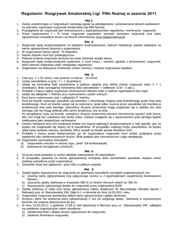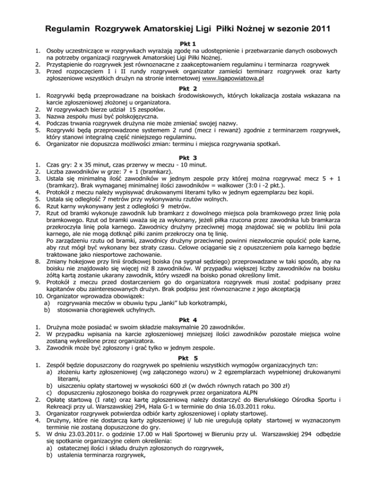 Regulamin Rozgrywek Amatorskiej Ligi Piłki Nożnej w sezonie 2011 Pkt 1 1. Osoby uczestniczące w rozgrywkach wyrażają zgodę na udostępnienie i przetwarzanie danych osobowych na potrzeby organizacji rozgrywek Amatorskiej Ligi Piłki Nożnej. 2. Przystąpienie do rozgrywek jest równoznaczne z zaakceptowaniem regulaminu i terminarza rozgrywek 3. Przed rozpoczęciem I i II rundy rozgrywek organizator zamieści terminarz rozgrywek oraz karty zgłoszeniowe wszystkich drużyn na stronie internetowej www.ligapowiatowa.pl Pkt 2 1. Rozgrywki będą przeprowadzane na boiskach środowiskowych, których lokalizacja została wskazana na karcie zgłoszeniowej złożonej u organizatora. 2. W rozgrywkach bierze udział 15 zespołów. 3. Nazwa zespołu musi być polskojęzyczna. 4. Podczas trwania rozgrywek drużyna nie może zmieniać swojej nazwy. 5. Rozgrywki będą przeprowadzone systemem 2 rund (mecz i rewanż) zgodnie z terminarzem rozgrywek, który stanowi integralną część niniejszego regulaminu. 6. Organizator nie dopuszcza możliwości zmian: terminu i miejsca rozgrywania spotkań. Pkt 3 1. Czas gry: 2 x 35 minut, czas przerwy w meczu - 10 minut. 2. Liczba zawodników w grze: 7 + 1 (bramkarz). 3. Ustala się minimalną ilość zawodników w jednym zespole przy której można rozgrywać mecz 5 + 1 (bramkarz). Brak wymaganej minimalnej ilości zawodników = walkower (3:0 i -2 pkt.). 4. Protokół z meczu należy wypisywać drukowanymi literami tylko w jednym egzemplarzu bez kopii. 5. Ustala się odległość 7 metrów przy wykonywaniu rzutów wolnych. 6. Rzut karny wykonywany jest z odległości 9 metrów. 7. Rzut od bramki wykonuje zawodnik lub bramkarz z dowolnego miejsca pola bramkowego przez linię pola bramkowego. Rzut od bramki uważa się za wykonany, jeżeli piłka rzucona przez zawodnika lub bramkarza przekroczyła linię pola karnego. Zawodnicy drużyny przeciwnej mogą znajdować się w pobliżu linii pola karnego, ale nie mogą dotknąć piłki zanim przekroczy ona tę linię. Po zarządzeniu rzutu od bramki, zawodnicy drużyny przeciwnej powinni niezwłocznie opuścić pole karne, aby rzut mógł być wykonany bez straty czasu. Celowe ociąganie się z opuszczeniem pola karnego będzie traktowane jako niesportowe zachowanie. 8. Zmiany hokejowe przy linii środkowej boiska (na sygnał sędziego) przeprowadzane w taki sposób, aby na boisku nie znajdowało się więcej niż 8 zawodników. W przypadku większej liczby zawodników na boisku żółtą kartą zostanie ukarany zawodnik, który wszedł na boisko ponad określony limit. 9. Protokół z meczu przed dostarczeniem go do organizatora rozgrywek musi zostać podpisany przez kapitanów obu zainteresowanych drużyn. Brak podpisu jest równoznaczne z jego akceptacją 10. Organizator wprowadza obowiązek: a) rozgrywania meczów w obuwiu typu „lanki” lub korkotrampki, b) stosowania chorągiewek uchylnych. Pkt 4 1. Drużyna może posiadać w swoim składzie maksymalnie 20 zawodników. 2. W przypadku wpisania na karcie zgłoszeniowej mniejszej ilości zawodników pozostałe miejsca wolne zostaną wykreślone przez organizatora. 3. Zawodnik może być zgłoszony i grać tylko w jednym zespole. Pkt 5 1. Zespół będzie dopuszczony do rozgrywek po spełnieniu wszystkich wymogów organizacyjnych tzn: a) złożeniu karty zgłoszeniowej (wg załączonego wzoru) w 2 egzemplarzach wypełnionej drukowanymi literami, b) uiszczeniu opłaty startowej w wysokości 600 zł (w dwóch równych ratach po 300 zł) c) dopuszczeniu zgłoszonego boiska do rozgrywek przez organizatora ALPN 2. Opłatę startową (I ratę) oraz kartę zgłoszeniową należy dostarczyć do Bieruńskiego Ośrodka Sportu i Rekreacji przy ul. Warszawskiej 294, Hala G-1 w terminie do dnia 16.03.2011 roku. 3. Organizator rozgrywek potwierdza odbiór karty zgłoszeniowej i opłaty startowej. 4. Drużyny, które nie dostarczą karty zgłoszeniowej i/ lub nie uregulują opłaty startowej w wyznaczonym terminie nie zostaną dopuszczone do gry. 5. W dniu 23.03.2011r. o godzinie 17.00 w Hali Sportowej w Bieruniu przy ul. Warszawskiej 294 odbędzie się spotkanie organizacyjne celem określenia: a) ostatecznej ilości i składu drużyn zgłoszonych do rozgrywek, b) ustalenia terminarza rozgrywek, c) ustalenia terminu: wpłacania II raty opłaty startowej i wprowadzenia zmian w karcie zgłoszeniowej na drugą rundę. Pkt 6 1. Organizatorzy informują, że zawodnicy występujący w rozgrywkach są ubezpieczeni w InterRisk Towarzystwo Ubezpieczeń S.A. Vienna Insurance, nr polisy: NWG-B 007467. 2. Grouppolisą od NNW . Suma ubezpieczenia - 4 000 zł (słownie: cztery tysiące złotych). 3. Wszelkie ewentualne kontuzje zawodników należy potwierdzić stosownym wpisem w protokole z meczu. 4. Osoba, która doznała uszczerbku na zdrowiu zobowiązana jest zgłosić się do zakładu opieki medycznej w dniu w którym uległa kontuzji. 5. Zastosowanie się do pkt.6.2 i 6.3 niniejszego regulaminu jest warunkiem dalszego roszczenia odszkodowania od Ubezpieczyciela z tytułu poniesionego uszczerbku na zdrowiu. 6. Organizatorzy rozgrywek nie ponoszą żadnej odpowiedzialności z tytułu uszczerbku na zdrowiu i mienia osób uczestniczących w rozgrywkach. 7. Organizatorzy rozgrywek informują o możliwości dodatkowego ubezpieczenia się od NNW w dowolnym zakładzie ubezpieczeń. Pkt 7 1. Nie dopuszczalny jest udział w rozgrywkach zawodników zrzeszonych w klubach PZPN. 2. Dla osób uczestniczących w rozgrywkach obowiązuje okres 6 miesięcy karencji od daty otrzymania przez zawodnika jego karty zawodniczej. 3. Warunkiem dopuszczenia zawodnika do rozgrywek ALPN jest otrzymanie z klubu w którym zawodnik był uprzednio zrzeszony własnej karty zawodnika lub pisemne oświadczenie klubu, że zawodnik sam zrezygnował lub został przez klub skreślony (data wykreślenia) i nie uczestniczy w rozgrywkach organizowanych przez PZPN. Od ostatniego meczu rozegranego przez zawodnika w drużynie w kt