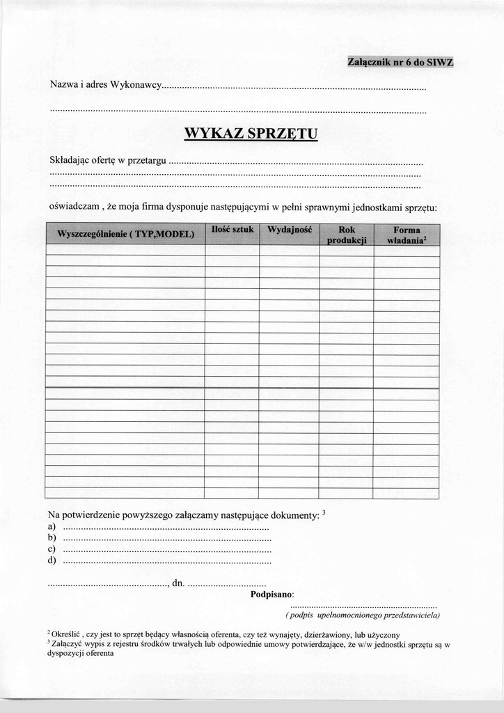 Załącznik Nazwa i adres Wykonawcy ...... „ .• ..... „ .• • •. „ .•...... . . . . .. . . • . . ••..... . . .. . . . ...... . . •••••• •.. . . . .. „ „ . . . • •••••• . . . . ....... WYKAZ Składając ofertę oświadczam nr 6 do SIWZ w przetargu ......... ..... „ SPRZĘTU ••••••• • • ••• ••• . ••• ......... . . . „ . •..••• • • • • • • •••. • ••.•... . . . . . .. • . . . • •• •• • •••. . . . •. , że moja firma dysponuje następującymi w pełni sprawnymi jednostkami Wyszczególnienie (TYP,MODEL) Ilość sztuk Wydajność Rok produkcji sprzętu : Forma władania 2 Na potwierdzenie powyższego załączamy następujące dokumenty: 3 a) ......... ... ............... ............ „ ....•....••......... . ... . .. . .. ••.. • • . . . . b) .......... „ . .... . .•.. „ „ „ ••... . . . . „ . . . . . ...... . . . . . .. . . . . . . . .... . . ... . . . . . . . . . c) ........ „ . . . •.... . ......... • ••. • • • . • • •• • ••••••• „ •••••••• . ••..•••.• „ ..•.. . ••. . . . d) .............. ... . „ ..•. „ . . . ... . . . .. „ ....... „ „ .... . ...... . . . . ......... .... ..•• „ „ „ ..... „ . „ „ „ „ „ . „ „ „ „ „ „ . „ „ „ „ „ dn. „ „ „ ... „ . .. „ . „ ... „ „ . „ .• Podpisano : (podpis upełnomocnionego przedstawiciela) 2 Określić , czy jest to sprzęt będący własnością oferenta, czy też wynajęty, dzierżawiony, lub użyczony wypis z rejestru środków trwałych lub odpowiednie umowy potwierdzające, że w/w jednostki dyspozycji oferenta 3 Załączyć sprzętu są w