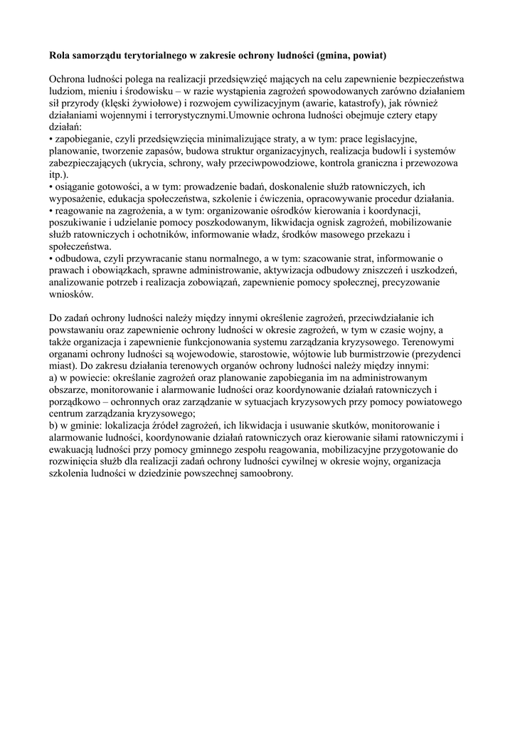 Rola samorządu terytorialnego w zakresie ochrony ludności (gmina, powiat) Ochrona ludności polega na realizacji przedsięwzięć mających na celu zapewnienie bezpieczeństwa ludziom, mieniu i środowisku – w razie wystąpienia zagrożeń spowodowanych zarówno działaniem sił przyrody (klęski żywiołowe) i rozwojem cywilizacyjnym (awarie, katastrofy), jak również działaniami wojennymi i terrorystycznymi.Umownie ochrona ludności obejmuje cztery etapy działań: • zapobieganie, czyli przedsięwzięcia minimalizujące straty, a w tym: prace legislacyjne, planowanie, tworzenie zapasów, budowa struktur organizacyjnych, realizacja budowli i systemów zabezpieczających (ukrycia, schrony, wały przeciwpowodziowe, kontrola graniczna i przewozowa itp.). • osiąganie gotowości, a w tym: prowadzenie badań, doskonalenie służb ratowniczych, ich wyposażenie, edukacja społeczeństwa, szkolenie i ćwiczenia, opracowywanie procedur działania. • reagowanie na zagrożenia, a w tym: organizowanie ośrodków kierowania i koordynacji, poszukiwanie i udzielanie pomocy poszkodowanym, likwidacja ognisk zagrożeń, mobilizowanie służb ratowniczych i ochotników, informowanie władz, środków masowego przekazu i społeczeństwa. • odbudowa, czyli przywracanie stanu normalnego, a w tym: szacowanie strat, informowanie o prawach i obowiązkach, sprawne administrowanie, aktywizacja odbudowy zniszczeń i uszkodzeń, analizowanie potrzeb i realizacja zobowiązań, zapewnienie pomocy społecznej, precyzowanie wniosków. Do zadań ochrony ludności należy między innymi określenie zagrożeń, przeciwdziałanie ich powstawaniu oraz zapewnienie ochrony ludności w okresie zagrożeń, w tym w czasie wojny, a także organizacja i zapewnienie funkcjonowania systemu zarządzania kryzysowego. Terenowymi organami ochrony ludności są wojewodowie, starostowie, wójtowie lub burmistrzowie (prezydenci miast). Do zakresu działania terenowych organów ochrony ludności należy między innymi: a) w powiecie: określanie zagrożeń oraz planowanie zapobiegania im na administrowanym obszarze, monitorowanie i alarmowanie ludności oraz koordynowanie działań ratowniczych i porządkowo – ochronnych oraz zarządzanie w sytuacjach kryzysowych przy pomocy powiatowego centrum zarządzania kryzysowego; b) w gminie: lokalizacja źródeł zagrożeń, ich likwidacja i usuwanie skutków, monitorowanie i alarmowanie ludności, koordynowanie działań ratowniczych oraz kierowanie siłami ratowniczymi i ewakuacją ludności przy pomocy gminnego zespołu reagowania, mobilizacyjne przygotowanie do rozwinięcia służb dla realizacji zadań ochrony ludności cywilnej w okresie wojny, organizacja szkolenia ludności w dziedzinie powszechnej samoobrony.