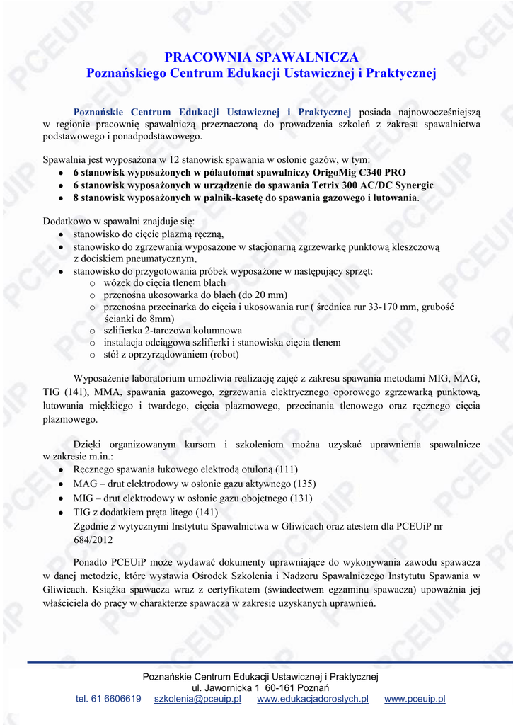 PRACOWNIA SPAWALNICZA Poznańskiego Centrum Edukacji Ustawicznej i Praktycznej Poznańskie Centrum Edukacji Ustawicznej i Praktycznej posiada najnowocześniejszą w regionie pracownię spawalniczą przeznaczoną do prowadzenia szkoleń z zakresu spawalnictwa podstawowego i ponadpodstawowego. Spawalnia jest wyposażona w 12 stanowisk spawania w osłonie gazów, w tym: 6 stanowisk wyposażonych w półautomat spawalniczy OrigoMig C340 PRO 6 stanowisk wyposażonych w urządzenie do spawania Tetrix 300 AC/DC Synergic 8 stanowisk wyposażonych w palnik-kasetę do spawania gazowego i lutowania. Dodatkowo w spawalni znajduje się: stanowisko do cięcie plazmą ręczną, stanowisko do zgrzewania wyposażone w stacjonarną zgrzewarkę punktową kleszczową z dociskiem pneumatycznym, stanowisko do przygotowania próbek wyposażone w następujący sprzęt: o wózek do cięcia tlenem blach o przenośna ukosowarka do blach (do 20 mm) o przenośna przecinarka do cięcia i ukosowania rur ( średnica rur 33-170 mm, grubość ścianki do 8mm) o szlifierka 2-tarczowa kolumnowa o instalacja odciągowa szlifierki i stanowiska cięcia tlenem o stół z oprzyrządowaniem (robot) Wyposażenie laboratorium umożliwia realizację zajęć z zakresu spawania metodami MIG, MAG, TIG (141), MMA, spawania gazowego, zgrzewania elektrycznego oporowego zgrzewarką punktową, lutowania miękkiego i twardego, cięcia plazmowego, przecinania tlenowego oraz ręcznego cięcia plazmowego. Dzięki organizowanym kursom i szkoleniom można uzyskać uprawnienia spawalnicze w zakresie m.in.: Ręcznego spawania łukowego elektrodą otuloną (111) MAG – drut elektrodowy w osłonie gazu aktywnego (135) MIG – drut elektrodowy w osłonie gazu obojętnego (131) TIG z dodatkiem pręta litego (141) Zgodnie z wytycznymi Instytutu Spawalnictwa w Gliwicach oraz atestem dla PCEUiP nr 684/2012 Ponadto PCEUiP może wydawać dokumenty uprawniające do wykonywania zawodu spawacza w danej metodzie, które wystawia Ośrodek Szkolenia i Nadzoru Spawalniczego Instytutu Spawania w Gliwicach. Książka spawacza wraz z certyfikatem (świadectwem egzaminu spawacza) upoważnia jej właściciela do pracy w charakterze spawacza w zakresie uzyskanych uprawnień. Poznańskie Centrum Edukacji Ustawicznej i Praktycznej ul. Jawornicka 1 60-161 Poznań tel. 61 6606619 [email protected] www.edukacjadoroslych.pl www.pceuip.pl Pracownia spawalnicza Spawanie metodami TIG, MIG i MAG Poznańskie Centrum Edukacji Ustawicznej i Praktycznej ul. Jawornicka 1 60-161 Poznań tel. 61 6606619 [email protected] www.edukacjadoroslych.pl www.pceuip.pl Dział przygotowania próbek spawalniczych Poznańskie Centrum Edukacji Ustawicznej i Praktycznej ul. Jawornicka 1 60-161 Poznań tel. 61 6606619 [email protected] www.edukacjadoroslych.pl www.pceuip.pl