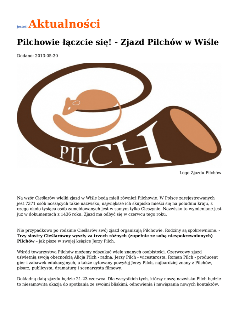 jesteś: Aktualności Pilchowie łączcie się! - Zjazd Pilchów w Wiśle Dodano: 2013-05-20 Logo Zjazdu Pilchów Na wzór Cieślarów wielki zjazd w Wiśle będą mieli również Pilchowie. W Polsce zarejestrowanych jest 7371 osób noszących takie nazwisko, największe ich skupisko mieści się na południu kraju, z czego około tysiąca osób zameldowanych jest w samym tylko Cieszynie. Nazwisko to wymieniane jest już w dokumentach z 1436 roku. Zjazd ma odbyć się w czerwcu tego roku. Nie przypadkowo po rodzinie Cieślarów swój zjazd organizują Pilchowie. Rodziny są spokrewnione. Trzy siostry Cieślarówny wyszły za trzech różnych (zupełnie ze sobą niespokrewnionych) Pilchów – jak pisze w swojej książce Jerzy Pilch. Wśród towarzystwa Pilchów możemy odszukać wiele znanych osobistości. Czerwcowy zjazd uświetnią swoją obecnością Alicja Pilch - radna, Jerzy Pilch - wicestarosta, Roman Pilch - producent gier i zabawek edukacyjnych, a także cytowany powyżej Jerzy Pilch, najbardziej znany z Pilchów, pisarz, publicysta, dramaturg i scenarzysta filmowy. Dokładną datą zjazdu będzie 21-23 czerwca. Dla wszystkich tych, którzy noszą nazwisko Pilch będzie to niesamowita okazja do spotkania ze swoimi bliskimi, odnowienia i nawiązania nowych kontaktów. - Bardzo podobał mi się ubiegłoroczny pomysł ze zjazdem Cieślarów. Cieszę się, że ród Pilchów również będzie miał swoje spotkanie w 2013 roku. Program imprezy zapowiada się bardzo interesująco, ale dla mnie będzie to przede wszystkim okazja do spotkania z ludźmi noszącymi to samo nazwisko co ja, jestem ciekawa ich historii tego, czym zajmują się na co dzień. Podoba mi się także, że wydarzenie ma swoją identyfikację, logo oraz własną stronę internetową - mówi Ania Pilch ze Skoczowa. Nazwisko Pilch wiąże się wieloma nazwami własnymi w Polsce. Pilchy to wieś nad jeziorem Roś, niedaleko miasta Pisz, w województwie warmińsko-mazurskim. Nazwa miejscowości pochodzi najprawdopodobniej właśnie od nazwiska Pilch, które jest wymienione w dokumentach z XV wieku. Jezioro Pilchowickie z kolei to największy zbiornik wody w Sudetach Zachodnich. Długość jeziora 6 km, szerokość 2 km, a powierzchnia tafli wody wynosi 240 ha. 22 czerwca odbędzie się oficjalne otwarcie zjazdu w Amfiteatrze im. Stanisława Hadyny w Wiśle. Wstępny plan imprezy: Piątek (21.06) • 10.00 – Rozpoczęcie rejestracji uczestników i wydawanie identyfikatorów – Wiślański rynek • 10.00 – Rozpoczęcie rozkładania stoisk Firm – Wiślański rynek • 18.00 – Uroczysta kolacja w Hotelu Gołębiewski Sobota (22.06) • Oficjalne otwarcie Zjazdu – Amfiteatr im. Stanisława Hadyny • Wykład prof. Daniela Kadłubca – etymologia nazwiska Pilch • Wystąpienia gości honorowych • Mecz piłki nożnej – Pilchowie kontra Media (wstęp 5zł – zyski z meczu przeznaczone zostaną na rozwój młodej kadry sportowców) • Występy zespołów artystycznych (m.in. „Estrada Regionalna Równica” ) towarzyszące np. zawody sportowe, konkursy z nagrodami, imprezy rodzinne, zabawy dla dzieci itd. Niedziela (23.06) • Spotkanie na granicy Polsko-Czeskiej – polana Pilchula - darmowy posiłek dla każdego Zjazdowicza za okazaniem identyfikatora • Program kulturalny w rytmach góralskich • Wpisy do księgi pamiątkowej specjalnie przygotowanej na tę okoliczność Plan wydarzeń jest cały czas aktualizowany. Więcej na stronie www.zjazdpilchow.pl Źródło: www.ox.pl