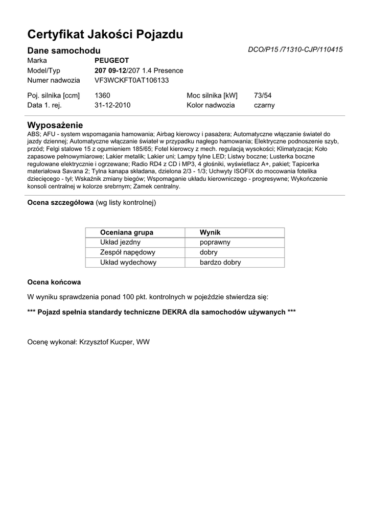 Certyfikat Jakości Pojazdu DCO/P15 /71310-CJP/110415 Dane samochodu Marka Model/Typ Numer nadwozia PEUGEOT 207 09-12/207 1.4 Presence VF3WCKFT0AT106133 Poj. silnika [ccm] Data 1. rej. 1360 31-12-2010 Moc silnika [kW] Kolor nadwozia 73/54 czarny Wyposażenie ABS; AFU - system wspomagania hamowania; Airbag kierowcy i pasażera; Automatyczne włączanie świateł do jazdy dziennej; Automatyczne włączanie świateł w przypadku nagłego hamowania; Elektryczne podnoszenie szyb, przód; Felgi stalowe 15 z ogumieniem 185/65; Fotel kierowcy z mech. regulacją wysokości; Klimatyzacja; Koło zapasowe pełnowymiarowe; Lakier metalik; Lakier uni; Lampy tylne LED; Listwy boczne; Lusterka boczne regulowane elektrycznie i ogrzewane; Radio RD4 z CD i MP3, 4 głośniki, wyświetlacz A+, pakiet; Tapicerka materiałowa Savana 2; Tylna kanapa składana, dzielona 2/3 - 1/3; Uchwyty ISOFIX do mocowania fotelika dziecięcego - tył; Wskaźnik zmiany biegów; Wspomaganie układu kierowniczego - progresywne; Wykończenie konsoli centralnej w kolorze srebrnym; Zamek centralny. Ocena szczegółowa (wg listy kontrolnej) Oceniana grupa Układ jezdny Zespół napędowy Układ wydechowy Wynik poprawny dobry bardzo dobry Ocena końcowa W wyniku sprawdzenia ponad 100 pkt. kontrolnych w pojeździe stwierdza się: *** Pojazd spełnia standardy techniczne DEKRA dla samochodów używanych *** Ocenę wykonał: Krzysztof Kucper, WW