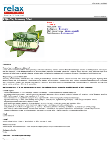 Informacje o produkcie Utworzono 07-03-2017 ETJA Olej laurowy 50ml Cena : 21.99 zł Producent : Etja Dostępność : Dostępny Stan magazynowy : bardzo wysoki Średnia ocena : brak recenzji KOSMETYK Drzewo laurowe (Wawrzyn )/Laurus/ Rodzaj drzew i krzewów z rodziny wawrzynowatych. Wawrzyn szlachetny rośnie w basenie Morza Śródziemnego. Gatunek charakteryzuje się skórzastymi, wiecznie zielonymi i silnie aromatycznymi liśćmi, które stanowią popularną przyprawę. Dodatkowo z owoców rośliny w postaci jagód tłoczy się olej (Oleum Laurinum). W skład oleju ze świeżych owoców wchodzą glicerydy kwasu laurynowego, palmitynowego, olejowego i linolowego oraz olejki eteryczne. Olej laurowy /Laurus Nobilis Oil/ Naturalny, nierafinowany, zimnotłoczony olej z wawrzynu szlachetnego. Zawiera: chlorofil, przeciwutleniacze, NNKT oraz olejki eteryczne. Wykazuje działanie antyseptyczne, przeciwzapalne i przeciwbakteryjne, odnawia ochronny płaszcz hydrolipidowy skóry. Łagodzi dolegliwości dermatologiczne, pomaga w walce z chorobami grzybiczymi, łuszczycą, czy egzemą. Skuteczny w leczeniu łupieżu, wypadaniu włosów i chorej skóry głowy. Doskonały do cery zniszczonej, suchej, wrażliwej, i skłonnej do wyprysków. Olej laurowy firmy ETJA jest wytwarzany w procesie tłoczenia na zimno z surowców wysokiej jakości, w 100% naturalny. Sposób użycia: • stosować bezpośrednio na skórę. Może być również rozcieńczany z innym olejem nośnikowym w pielęgnacji, • uzdrawiająca kąpiel przyspieszy krążenie, rozszerzy naczynia krwionośne w skórze, a także rozgrzeje i pobudzi cały organizm - dodać do wanny wypełnionej 1/3 ciepłej wody ok. 10 gram oleju, kąpać się do 15 minut, • stosować miejscowo na pojedyncze wypryski, stany zapalne i ranki - działanie antyseptyczne i przeciwbakteryjne, • regularnie stosowany na skórę głowy pomaga zwalczyć łupież, stany zapalne, łagodzi objawy łuszczycy, a także przyspiesza porost włosów, • nacieranie opuchnięć powstałych w wyniku urazów, • właściwości rozgrzewające sprawdzą się przy okładach na stopy (na noc) - zmiękczą zrogowaciałą i pękającą skórę, • Stosować na dłonie i paznokcie - silne właściwości regeneracyjne i nawilżające przywrócą urodę dłonią, • osoby dotknięte reumatyzmem mogą wcierać go w stawy - skutecznie uśmierza ból różnego pochodzenia reumatycznego i artretycznego, • może posłużyć jako dodatek do bazy przeznaczonej w masażu - podobnie jak w przypadku kąpieli działa rozgrzewająco i pobudzi cały organizm, • świetny dodatek do domowej produkcji kremów i balsamów np. w połączeniu z masłem shea BIO lub olejem kokosowym BIO. Skład: Laurus Nobilis Oil Postać: Postać stała w kolorze zielonym. W dotknięciu ze skórą zaczyna się topić. Przechowywanie: Przechowywać w chłodnym miejscu lub w temperaturze pokojowej w miejscu mało nasłonecznionym. Kraj pochodzenia: Turcja Producent / Podmiot odpowiedzialny: Wygenerowano w programie www.oscGold.com ETJA S.C. ul. Łęczycka 29 82-300 Elbląg Opakowanie: 50ml