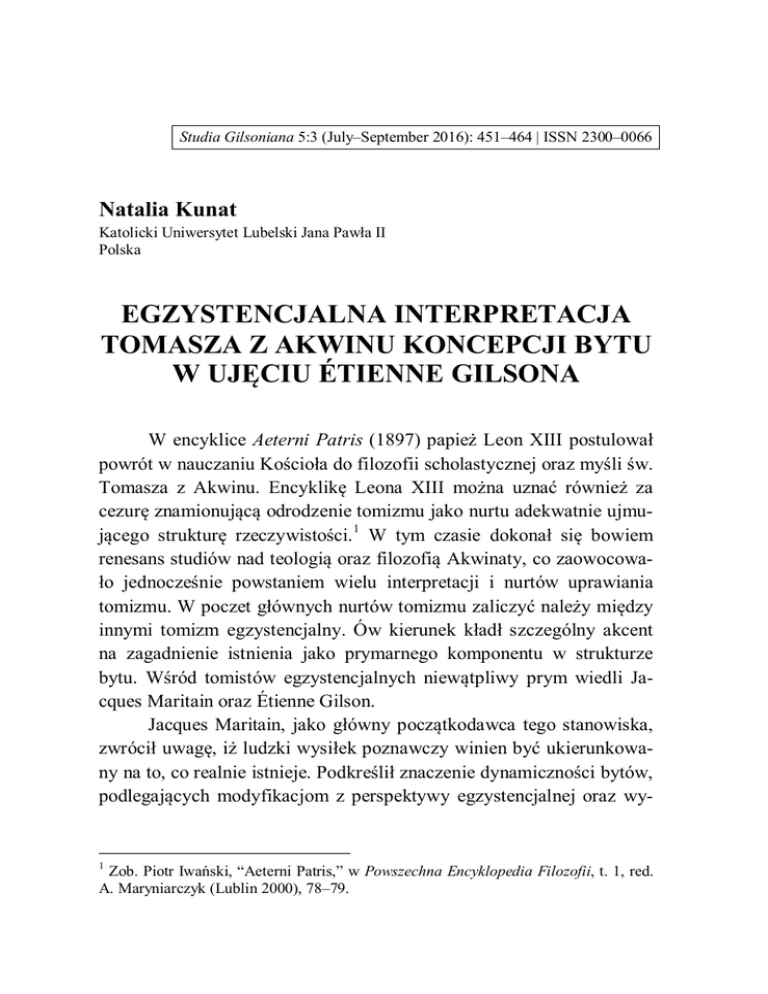 Studia Gilsoniana 5:3 (July–September 2016): 451–464 | ISSN 2300–0066 Natalia Kunat Katolicki Uniwersytet Lubelski Jana Paw a II Polska EGZYSTENCJALNA INTERPRETACJA TOMASZA Z AKWINU KONCEPCJI BYTU W UJ CIU ÉTIENNE GILSONA W encyklice Aeterni Patris (1897) papie Leon XIII postulowa powrót w nauczaniu Ko cio a do filozofii scholastycznej oraz my li w. Tomasza z Akwinu. Encyklik Leona XIII mo na uzna równie za cezur znamionuj odrodzenie tomizmu jako nurtu adekwatnie ujmucego struktur rzeczywisto ci. 1 W tym czasie dokona si bowiem renesans studiów nad teologi oraz filozofi Akwinaty, co zaowocowao jednocze nie powstaniem wielu interpretacji i nurtów uprawiania tomizmu. W poczet g ównych nurtów tomizmu zaliczy nale y mi dzy innymi tomizm egzystencjalny. Ów kierunek k ad szczególny akcent na zagadnienie istnienia jako prymarnego komponentu w strukturze bytu. W ród tomistów egzystencjalnych niew tpliwy prym wiedli Jacques Maritain oraz Étienne Gilson. Jacques Maritain, jako g ówny pocz tkodawca tego stanowiska, zwróci uwag , i ludzki wysi ek poznawczy winien by ukierunkowany na to, co realnie istnieje. Podkre li znaczenie dynamiczno ci bytów, podlegaj cych modyfikacjom z perspektywy egzystencjalnej oraz wy- 1 Zob. Piotr Iwa ski, “Aeterni Patris,” w Powszechna Encyklopedia Filozofii, t. 1, red. A. Maryniarczyk (Lublin 2000), 78–79. 452 Natalia Kunat akcentowa poznawcz rol “intuicji bytu.”2 Wed ug Maritaina, tego rodzaju intuicja stanowi fundament poznania metafizycznego. Trzeba zaznaczy , i w pocz tkowej fazie swojej filozofii sk ania si ku rozwa aniom H. Bergsona, lecz pó niej nawi zywa do pogl dów w. Tomasza z Akwinu. Uwa , e “metafizyka tomistyczna jest metafizyegzystencjaln . . . jest i pozostanie m dro ci , która kroczy drog intelektualn , zgodnie z wymaganiami rozumu i w ciwej sobie intuicyjno ci.”3 Wersja tomizmu egzystencjalnego przedstawiona przez J. Maritaina zosta a w sposób szczególny rozwini ta oraz spopularyzowana przez Étienne Gilsona. Filozof ten odcisn zasadnicze pi tno na tomizmie egzystencjalnym poprzez podkre lenie roli istnienia w metafizyce.4 Ponadto francuski my liciel, na podstawie odczytywania oryginalnych tekstów Akwinaty, próbowa genetycznie zrekonstruowa Tomaszow metafizyk istnienia. Wobec tego Gilsona niew tpliwie mo na uzna za jednego z najbardziej twórczych interpretatorów w. Tomasza z Akwinu. W tym kontek cie nale y zaznaczy , i Gilson “wyrugowa ” z dyskursu na temat Tomasza filozofii bytu te tezy g oszone przez filozofów, które by y niespójne z tym, co stanowi o nauk samego Akwinaty. W zwi zku z tym francuski my liciel na kanwie dziejów my li filozoficznej dostrzeg powtarzaj si prób wprowadzania do Tomaszowego rozumienia bytu twierdze , mi dzy innymi, kantyzmu, feno2 Szerzej na ten temat, zob. Jacques Maritain, “Intuicja bytu,” w Pisma Filozoficzne, um. J. Fenrychowa (Kraków 1988). 3 Id., 160. 4 Szerzej na ten temat Étienne Gilsona oraz jego filozofii, zob. Laurence K. Shook, Étienne Gilson (Toronto 1984); Etienne Gilson. Filozofia i mediewistyka, red. T. Klimski (Warszawa 2007); Margaret McGrath, Etienne Gilson: A Bibliography (Toronto: Pontifical Institute of Mediaeval Studies, 1982); Stefan Swie awski, “Opoka m dro ci. Pami ci Étienne Gilsona—jako wyraz czci i mi ci,” Znak 31 (1979): 922–941; Mieczys aw Gogacz, “Gilson i filozofia,” Studia Philosophiae Christianae 16:2 (1980): 134–144; Stanis aw Michalski, “Historyk filozofii i jego filozofia. W dziesi rocznic mierci Étienne Gilsona (1884–1978),” Studia Filozoficzne 32:4 (1988): 69–80; John M. Quinn, The Thomism of Étienne Gilson (Villanova 1971); Anton C. Pegis, “Gilson and Thomism,” Thought 21:3 (1946): 435–454. Egzystencjalna interpretacja Tomasza z Akwinu koncepcji bytu... 453 menologii oraz nauk szczegó owych. Dlatego Gilson prezentowa krytyczne stanowisko wobec prób czenia tomizmu z innymi nurtami filozoficznymi, twierdz c, e owe nurty intelektualne s naznaczone redukcjonistycznym rysem w opisie rzeczywisto ci, niezgodnym z tezami w. Tomasza.5 W odniesieniu do tego francuski filozof przedstawi na nowo koncepcj bytu odczytan z tekstów w. Tomasza z Akwinu. Donios a rola dorobku Gilsona w kwestii spojrzenia na filozofi Akwinaty przejawia a si w tym, e wyakcentowa on stron istnieniow bytu oraz wyeksplikowa elementy subontyczne w bycie, ród których podstawow rol pe ni z enie z istoty i istnienia. Fakt, e Gilson podj si namys u nad filozofi (metafizyk ) w. Tomasza z Akwinu sprawi o, i my l Akwinaty doczeka a si nie tylko ród owego odczytania, ale te oryginalnej interpretacji. Kanw , na której francuski my liciel prowadzi swoje badania nad egzystencjaln koncepcj bytu, stanowi y analizy historyczno-filozoficzne.6 Szczególnym uznaniem Gilson darzy filozofi redniowieczn , podkre laj c zasadnicz rol okresu scholastycznego. I w tym kontek cie podj on prób doprecyzowania systemu Akwinaty poprzez wyakcentowanie egzystencjalnej perspektywy w analizie struktury bytu. Byt jako esse w uj ciu Tomasza z Akwinu Problematyka dotycz ca rozumienia bytu stanowi a dla Akwinaty zasadnicze pole analiz filozoficznych. Fundamentem, na którym w. Tomasz z Akwinu dochodzi do pojmowania bytu, by o do wiadczenie rzeczy istniej cych jednostkowo—one w nie jawi si jako przedmiot filozoficznego namys u i probierz wiedzy o rzeczywisto ci. W kontekcie rozumienia bytu kluczow rol w filozofii Akwinaty odgrywa o poznanie zdroworozs dkowe. Za jego spraw Tomasz doszed do ro5 Zob. Mieczys aw Gogacz, “Wp yw E. Gilsona na filozofi w Polsce,” Studia Philosophiae Christianae 29:1 (1993): 22. 6 Zob. Étienne Gilson, “Existence and philosophy,” Proceedings of the American Catholic Philosophical Association 21 (1946): 4–16. 454 Natalia Kunat zumienia bytu jako czego , co istnieje.7 Zdaniem w. Tomasza, w procesie poznawczego ujmowania bytu uwyra niaj si dwa wa kie momenty: po pierwsze, to, e byt istnieje, a po drugie, to, i jest zdeterminowan w s