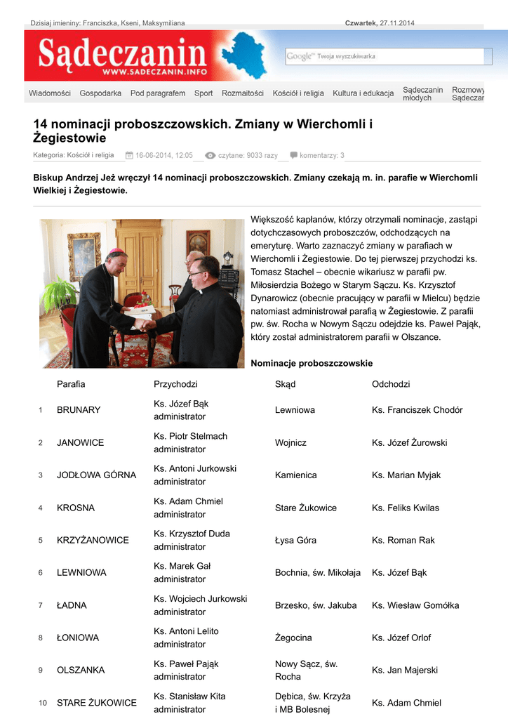 14 nominacji proboszczowskich. Zmiany w Wierchomli i
