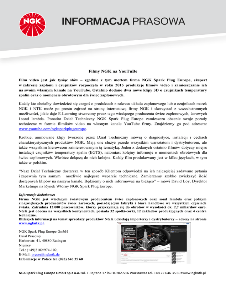 Filmy NGK na YouTuBe Film video jest jak tysiąc słów – zgodnie z tym mottem firma NGK Spark Plug Europe, ekspert w zakresie zapłonu i czujników rozpoczęła w roku 2015 produkcję filmów video i zamieszczanie ich na swoim własnym kanale na YouTube. Ostatnio dodano dwa nowe klipy 3D o czujnikach temperatury spalin oraz o momencie obrotowym dla świec zapłonowych. Każdy kto chciałby dowiedzieć się czegoś o produktach z zakresu układu zapłonowego lub o czujnikach marek NGK i NTK może po prostu zajrzeć na stronę internetową firmy NGK i skorzystać z wszechstronnych możliwości, jakie daje E-Learning stworzony przez tego wiodącego producenta świec zapłonowych, żarowych i sond lambda. Ponadto Dział Techniczny NGK Spark Plug Europe zamieszcza obecnie swoje porady techniczne w formie filmików video na własnym kanale YouTube firmy. Znajdziemy go pod adresem: www.youtube.com/ngksparkplugeurope. Krótkie, animowane klipy tworzone przez Dział Techniczny mówią o diagnostyce, instalacji i cechach charakterystycznych produktów NGK. Mają one służyć przede wszystkim warsztatom i dystrybutorom, ale także wszystkim kierowcom zainteresowanym tą tematyką. Jeden z dodanych ostatnio filmów dotyczy miejsc instalacji czujników temperatury spalin (EGTS), natomiast kolejny informuje o momentach obrotowych dla świec zapłonowych. Wkrótce dołączą do nich kolejne. Każdy film produkowany jest w kilku językach, w tym także w polskim. “Nasz Dział Techniczny dostarcza w ten sposób Klientom odpowiedzi na ich najczęściej zadawane pytania i zapewnia tym samym możliwie najlepsze wsparcie techniczne. Zamierzamy szybko zwiększyć ilość dostępnych klipów na naszym kanale. Będziemy o nich informować na bieżąco” – mówi David Loy, Dyrektor Marketingu na Rynek Wtórny NGK Spark Plug Europe. Informacje dodatkowe: Firma NGK jest wiodącym światowym producentem świec zapłonowych oraz sond lambda oraz jednym z największych producentów świec żarowych, posiadającym fabryki i biura handlowe we wszystkich częściach świata. Zatrudnia 12.000 pracowników, którzy przyczyniają się do obrotów w wysokości ok. 2,7 miliardów euro. NGK jest obecna na wszystkich kontynentach, posiada 32 spółki-córki, 12 zakładów produkcyjnych oraz 4 centra techniczne. Bliższych informacji na temat sprzedaży produktów NGK udzielają importerzy i dystrybutorzy – adresy na stronie www.ngkntk.pl. NGK Spark Plug Europe GmbH Dział Prasowy Harkortstr. 41, 40880 Ratingen Niemcy Tel.: (+49)2102/974-102, E-Mail: [email protected] Informacje w Polsce tel. (022) 646 35 60 NGK Spark Plug Europe GmbH Sp.z o.o.•ul. T.Rejtana 17 lok.10•02-516 Warszawa•Tel. +48 22 646 35 60•www.ngkntk.pl
