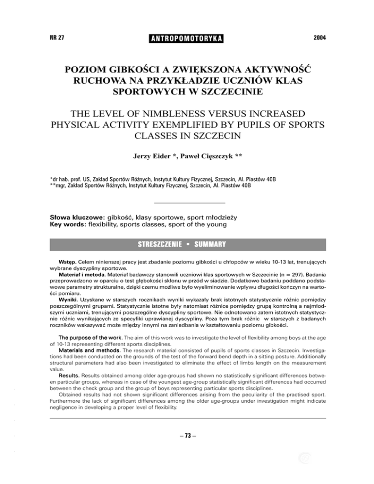 NR 27 Poziom gibkości a zwiększona aktywność ruchowa na przykładzie uczniów klas sportowych w Szczecinie ANTROPOMOTORYK A 2004 POZIOM GIBKOCI A ZWIÊKSZONA AKTYWNOÆ RUCHOWA NA PRZYK£ADZIE UCZNIÓW KLAS SPORTOWYCH W SZCZECINIE THE LEVEL OF NIMBLENESS VERSUS INCREASED PHYSICAL ACTIVITY EXEMPLIFIED BY PUPILS OF SPORTS CLASSES IN SZCZECIN Jerzy Eider *, Pawe³ Ciêszczyk ** *dr hab. prof. US, Zakład Sportów Różnych, Instytut Kultury Fizycznej, Szczecin, Al. Piastów 40B **mgr, Zakład Sportów Różnych, Instytut Kultury Fizycznej, Szczecin, Al. Piastów 40B Słowa kluczowe: gibkość, klasy sportowe, sport młodzieży Key words: flexibility, sports classes, sport of the young STRESZCZENIE • SUMMARY The purpose of the work. The aim of this work was to investigate the level of flexibility among boys at the age of 10-13 representing different sports disciplines. Materials and methods. The research material consisted of pupils of sports classes in Szczecin. Investigations had been conducted on the grounds of the test of the forward bend depth in a sitting posture. Additionally structural parameters had also been investigated to eliminate the effect of limbs length on the measurement value. Results. Results obtained among older age-groups had shown no statistically significant differences between particular groups, whereas in case of the youngest age-group statistically significant differences had occurred between the check group and the group of boys representing particular sports disciplines. Obtained results had not shown significant differences arising from the peculiarity of the practised sport. Furthermore the lack of significant differences among the older age-groups under investigation might indicate negligence in developing a proper level of flexibility. - - - - - Wstęp. Celem ninienszej pracy jest zbadanie poziomu gibkości u chłopców w wieku 10-13 lat, trenujących wybrane dyscypliny sportowe. Materiał i metoda. Materiał badawczy stanowili uczniowi klas sportowych w Szczecinie (n = 297). Badania przeprowadzono w oparciu o test głębokości skłonu w przód w siadzie. Dodatkowo badaniu poddano podstawowe parametry strukturalne, dzięki czemu możliwe było wyeliminowanie wpływu długości kończyn na wartości pomiaru. Wyniki. Uzyskane w starszych rocznikach wyniki wykazały brak istotnych statystycznie różnic pomiędzy poszczególnymi grupami. Statystycznie istotne były natomiast różnice pomiędzy grupą kontrolną a najmłodszymi uczniami, trenującymi poszczególne dyscypliny sportowe. Nie odnotowano zatem istotnych statystycznie różnic wynikających ze specyfiki uprawianej dyscypliny. Poza tym brak różnic w starszych z badanych roczników wskazywać może między innymi na zaniedbania w kształtowaniu poziomu gibkości. – 73 – Jerzy Eider, Paweł Cięszczyk Wstęp Gibkość ciała, w przeszłości często lekceważona i zaniedbywana, w ostatnich latach dość konsekwentnie jest uważana za istotny element sprawności fizycznej [1]. Najlepszym tego dowodem jest fakt, iż pomiar gibkości stał się jednym z podstawowych elementów powszechnie używanych baterii testów, np. EUROFIT czy YMCA. Jedna z definicji gibkości określa ją jako „zdolność do osiągania dużej amplitudy wykonywanych ruchów” [4]. Ulokowana na pograniczu cech strukturalnych i funkcjonalnych gibkość spełnia wiele istotnych funkcji w sporcie wyczynowym, wychowaniu fizycznym i rehabilitacji ruchowej [2]. Przykładem praktycznego wykorzystania pomiaru gibkości może być przeprowadzona na jego podstawie ocena przygotowania sportowego czy próba zidentyfikowania przyczyn urazów i kontuzji w sporcie [4]. Wiadomo przecież, iż właściwie wykonywane ćwiczenia obszerności ruchów wpływają na zwiększenie szybkości skracania się mięśnia, sprzyjają płynności i dynamice ruchów oraz wielu innym parametrom mechanicznym ruchu. W niektórych dyscyplinach sportu wysoki poziom gibkości służy rozwojowi sprawności specjalnej, co przykładowo obserwujemy w grach zespołowych podczas niekonwencjonalnych, sytuacyjnych zagrań [5]. Z drugiej jednak strony, osiągnięcie zbyt dużej gibkości w stawach może być niepożądane i pociągać za sobą bardzo poważne konsekwencje, jak chociażby nadmierną ruchomość w stawach (czyli przekroczenie norm fizjologicznych). Stan taki prowadzi do zbytniego rozluźnienia się stawów (luzów i niestabilności), co jest przyczyną zwiększonego ryzyka kontuzji mięśni i kości [6]. Zasadniczą kwestią wydaje się zatem określenie specyficznego poziomu gibkości dla każdej z dyscyplin sportowych, co znalazłoby odzwierciedlenie w zabezpieczeniu przed urazami i wydatnie wpłynęłoby na efektywność procesu szkoleniowego. Zadanie to nie wydaje się proste chociażby z uwagi na bardzo subiektywny charakter tej predyspozycji (dlatego też gibkość rzadko brana jest pod uwagę podczas tworzenia modeli mistrza). Oczywiste jest, iż zawodnicy reprezentujący określone dyscypliny sportowe (np. łyżwiarstwo figurowe, gimnastyka) muszą odznaczać się większą gibkością w porównaniu z przedstawicielami innych dyscyplin sportowych. Jak jednak określić poziom gibkości, który byłby optymalny dla rozwoju kariery zawodniczej? Cytując Osińskiego [1], za najbardziej pożądany zakres możliwości ruchów uznać możemy taki, który jest adekwatny i pozwala wykonywać ruchy bez zbędnego oporu stawu i tkanki miękkiej. Pożądana dla danego zawodnika wartość poziomu gibkości uzależniona jest więc od zakresu czynności ruchowych charakterystycznych dla uprawianej przez niego dyscypliny sportu. W jednej ze swoich prac Prus [5] wspomina, że większość autorów sugeruje rozwijanie gibkości do wartości 15-20% przekraczających zakres ruchu, występujących podczas podstawowych czynności technicznych w określonej dyscyplinie lub konkurencji sportowej. Celem niniejszej pracy jest zbadanie poziomu gibkości u chłopców w wie