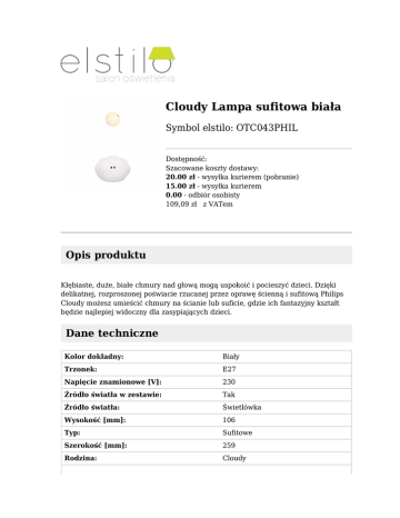 Cloudy Lampa sufitowa biała Symbol elstilo: OTC043PHIL Dostępność: Szacowane koszty dostawy: 20.00 zł - wysyłka kurierem (pobranie) 15.00 zł - wysyłka kurierem 0.00 - odbiór osobisty 109,09 zł z VATem Opis produktu Kłębiaste, duże, białe chmury nad głową mogą uspokoić i pocieszyć dzieci. Dzięki delikatnej, rozproszonej poświacie rzucanej przez oprawę ścienną i sufitową Philips Cloudy możesz umieścić chmury na ścianie lub suficie, gdzie ich fantazyjny kształt będzie najlepiej widoczny dla zasypiających dzieci. Dane techniczne Kolor dokładny: Biały Trzonek: E27 Napięcie znamionowe [V]: 230 Źródło światła w zestawie: Tak Źródło światła: Świetlówka Wysokość [mm]: 106 Typ: Sufitowe Szerokość [mm]: 259 Rodzina: Cloudy Rodzaj: Dziecięce Moc [W]: 15 Kolor: Biały Ilość źródeł światła: 1 EEL - klasa energetyczna żarówki: A Długość [mm]: 300
