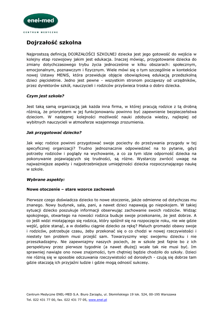 Dojrzałość szkolna Najprostszą definicją DOJRZAŁOŚCI SZKOLNEJ dziecka jest jego gotowość do wejścia w kolejny etap rozwojowy jakim jest edukacja. Inaczej mówiąc, przygotowanie dziecka do zmiany dotychczasowego trybu życia jednocześnie w kilku obszarach: społecznym, emocjonalnym, poznawczym i fizycznym. Wiele mówi się o tym szczególnie w kontekście nowej Ustawy MENiS, która przewiduje objęcie obowiązkową edukacją przedszkolną dzieci pięcioletnie. Jedno jest pewne - wszystkim stronom począwszy od urzędników, przez dyrektorów szkół, nauczycieli i rodziców przyświeca troska o dobro dziecka. Czym jest szkoła? Jest taką samą organizacją jak każda inna firma, w której pracują rodzice z tą drobną różnicą, że priorytetem w jej funkcjonowaniu powinno być zapewnienie bezpieczeństwa dzieciom. W następnej kolejności możliwość nauki zdobycia wiedzy, najlepiej od wybitnych nauczycieli w atmosferze wzajemnego zrozumienia. Jak przygotować dziecko? Jak więc rodzice powinni przygotować swoje pociechy do przeżywania przygody w tej specyficznej organizacji? Trudno jednoznacznie odpowiedzieć na to pytanie, gdyż potrzeby rodziców i poglądy na wychowanie, a co za tym idzie odporność dziecka na pokonywanie pojawiających się trudności, są różne. Wystarczy zwrócić uwagę na najważniejsze aspekty i najpotrzebniejsze umiejętności dziecka rozpoczynającego naukę w szkole. Wybrane aspekty: Nowe otoczenie – stare wzorce zachowań Pierwsze czego doświadcza dziecko to nowe otoczenie, jakże odmienne od dotychczas mu znanego. Nowy budynek, sala, pani, a nawet dzieci napawają go niepokojem. W takiej sytuacji dziecko poszukuje informacji obserwując zachowanie swoich rodziców. Widząc spokojnego, otwartego na nowości rodzica buduje swoje przekonanie, że jest dobrze. A co jeśli widzi miotającego się rodzica, który spóźnił się na rozpoczęcie roku, nie wie gdzie wejść, gdzie stanąć, a w dodatku ciągnie dziecko za rękę? Maluch gromadzi obawy swoje i rodziców, potrzebuje czasu, żeby przekonać się o co chodzi w nowej rzeczywistości i niestety ten problem musi przejść sam. Towarzyszmy więc swojemu dziecku i nie przeszkadzajmy. Nie zapewniajmy naszych pociech, że w szkole jest fajnie bo z ich perspektywy przez pierwsze tygodnie (a nawet dłużej) wcale tak nie musi być. Im sprawniej nawiąże ono nowe znajomości, tym chętniej będzie chodziło do szkoły. Dzieci nie różnią się w sposobie odczuwania rzeczywistości od dorosłych - czują się dobrze tam gdzie otaczają ich przyjaźni ludzie i gdzie mogą odnosić sukcesy. Centrum Medyczne ENEL-MED S.A. Biuro Zarządu, ul. Słomińskiego 19 lok. 524, 00-195 Warszawa Tel. 022 431 77 00, fax. 022 431 77 05, www.enel.pl Punktualność – nie narażaj dziecka na dodatkowy stres Bardzo istotna jest punktualność. To rodzice muszą zdążyć przyprowadzić dziecko na czas do szkoły, żeby nie narażać go na niepotrzebną frustrację, gdy miejsce przy ulubionym koledze lub fajnej koleżance będzie już zajęte lub 15-25 par oczu codziennie będzie spoglądać, kiedy kolejny raz samo wchodzi do klasy. „Łatka” spóźnialskiego dla dziecka to już duży problem, nie wystarczy rada „nie słuchaj ich”. Dziecko na starcie nie powinno być przegrane. Uczmy dzieci obrony siebie bez agresji Umiejętność odnalezienia się w grupie, nawiązanie kontaktu, odpowiedź tu i teraz na zadane pytanie, dopytanie co, jak i kiedy, grzeczna i kulturalna odmowa, bronienie swojego zdania z wykluczeniem agresji słownej i fizycznej, umiejętność przyjęcia odmowy i słów krytyki - to tylko niektóre umiejętności społeczne jakie dziecko będzie prezentowało w nowej grupie klasowej. Klasa jest zbiorem różnorodnych środowisk rodzinnych i wychowawczych, które umożliwiają konfrontowanie się z naturalną rzeczywistością społeczną, a nie wyselekcjonowaną grupą podobieństw. Nie zapominajmy, że przynajmniej na tym etapie rozwojowym, dziecko jest ukształtowane przez rodziców. Wszystkie dzieci muszą wiedzieć, że ich obowiązkiem jest uczyć się i bronić w chwili zagrożenia, ale nie mają prawa krzywdzić innych tylko dlatego, że tak im się chce. Dzieci poniżane poniżają, bite biją, wyśmiewane wyśmiewają, obrażane obrażają. Powtarzajmy dzieciom „bądź taki dla innych, jaki chciałbyś, żeby inni byli dla ciebie”. Sygnały od wychowawcy, że jest inaczej traktujmy poważnie. Agresywni ludzie nie biorą się znikąd. Jak uchronić dziecko przed byciem klasową „fajtłapą”? Umiejętność wykonania czynności samoobsługowych np. przebranie się w strój od w-f i ponowne samodzielne ubranie się , wiązanie butów, zapięcie guzików, czynności higieniczne w toalecie, odłożenie zabawek i pomocy szkolnych na miejsce, sprzątnięcie po sobie ławki, dosunięcie krzesła, spakowanie plecaka ale także stanie na jednej nodze czy złapanie rzuconej piłki - to tylko kilka obszarów, które mogą przyczynić się do zyskania etykietki klasowej fajtłapy. Często dorośli dla swojej, a nie dziecka wygody wyręczają, wprowadzają szereg udogodnień w jego codziennym życiu, pod pretekstem „żeby miało lepiej, lżej” ale co potem? Nie umie zjeść nie pokrojonej kanapki, podkoszulkę zakłada na sweter, szuka prawej skarpetki na prawą nogę, zrzuca na podłogę resztki po zatemperowanej kredce itp. 5-6 latek powinien samodzielnie wiązać buty nie tylko po to, by nie odstawać od rówieśników, ale także dlatego, że jest to doskonałe i naturalne ćwiczenie koordynacji wzrokowo-ruchowej i ćwiczenie drobnych ruchów dłoni niezbędnych do rozwijania zdolności pisania. Pamiętajmy, że dziecko będąc w grupie nieustannie porównuje swoje umiejętności do innych i jest porównywane przez nich. Dzięki temu może zdobywać rzeczywistą wiedzę o sobie i posiadanych umiejętnościach. Dziecko przy pomocy rodziców oraz nauczyciela powinno z każd