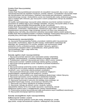 Kodeks Etyki Nauczycielskiej Preambuła Kodeks Etyki Nauczycielskiej jest wezwaniem do wszystkich nauczycieli, aby w życiu i pracy zawodowej kierowali się zasadami moralnymi, prawdą i dobrem. Z powołaniem nauczyciela wiąże się nierozerwalnie rola wychowawcy. Zadaniem nauczyciela jest pobudzanie i wspieranie wszechstronnego rozwoju i doskonalenia ucznia oraz studenta jako osoby obdarzonej godnością. Jest to możliwe tylko wówczas, gdy nauczyciel w swoim postępowaniu kieruje się zasadami miłości i służby. Od wysiłku wychowawczego nauczycieli zależy właściwe rozumienie wartości moralnych i docenianie ich wielkiej wagi w życiu każdego człowieka. Od pracy nauczycieli zależy w dużej mierze, jacy będą obywatele Rzeczpospolitej, jej siła i pomyślność. Kodeks Etyki Nauczycielskiej oparty jest na wartościach chrześcijańskich, które są podstawowe, uniwersalne i niepodważalne. Zasadniczym jego celem i zadaniem jest uświadomienie nauczycielom wagi moralnego wymiaru ich pracy oraz wezwanie do podjęcia pracy nad sobą, aby przywrócić zawodowi nauczyciela należny prestiż społeczny. Kodeks Etyki Nauczycielskiej powstał z inicjatywy Polskiego Towarzystwa Nauczycieli z myślą o przyszłej pracy samorządu zawodowego nauczycieli (Izb Nauczycielskich). Przyrzeczenie nauczycielskie Ja, nauczyciel Rzeczypospolitej Polskiej, przyrzekam rzetelnie pełnić mą powinność nauczyciela i wychowawcy, dążyć do pełni rozwoju i doskonalenia osobowego tak własnego, jak i powierzonych mi uczniów, kształcić oraz wychowywać młode pokolenia w duchu umiłowania prawdy, człowieka i Ojczyzny, zgodnie z powszechnymi zasadami dobra i sprawiedliwości, strzec godności stanu nauczycielskiego i dbać o jego dobre imię. Tak mi dopomóż Bóg! Z asady ogólne e tyki nauczycielskiej 1. Nauczyciel powinien stanowić wzór osobowości prawej i szlachetnej, wrażliwej i odpowiedzialnej, o postawie otwartej na drugiego człowieka. 2. Podstawowym zadaniem nauczyciela jest troska o dobro ucznia i studenta. 3. Nauczyciel uczciwie i rzetelnie przekazuje wiedzę zgodną z prawdą. 4. Nauczyciel szanuje godność ucznia i studenta w procesie kształcenia i wychowania. 5. Nauczyciel szanuje autonomię ucznia i studenta oraz jego rodziny. 6. Nauczyciel stoi na straży realizacji chrześcijańskich wartości moralnych, uczy i wychowuje własną postawą i przykładem. 7. Nauczyciel jest tolerancyjny wobec innych przekonań religijnych i światopoglądów, respektujących ład społeczny i moralny. 8. Nauczyciel w duchu prawdy uczy zasad współżycia społecznego i miłości Ojczyzny. 9. Nauczyciel wprowadza ucznia i studenta w dziedzictwo kulturowe narodu polskiego oraz uczy poszanowania kultury innych narodów. 10. Nauczyciel wychowuje w szacunku dla każdego życia ludzkiego, we wszystkich fazach jego rozwoju, od poczęcia po naturalny kres. 11. Nauczyciel uczy kultury współżycia ze światem przyrody. 12. Nauczyciel, kierując się dobrem ucznia i studenta, wybiera odpowiednie metody, formy oraz środki nauczania i wychowania, stosuje obiektywne kryteria oceny z uwzględnieniem zasady indywidualizacji. 13. Powinnością moralną nauczyciela jest stałe podnoszenie swych kwalifikacji zawodowych. 14. Nauczyciela obowiązuje tajemnica zawodowa. Z asady szczegó ł ow e e tyki nauczycielskiej A)Nauczyciel wobec ucznia 1. Nauczyciel szanuje godność ucznia jako osoby: akceptuje go, uznaje jego prawa, rozwija samodzielność myślenia i refleksyjność oraz pozwala mu wyrażać własne poglądy. 2. Nauczyciel pamięta, że pierwszymi i głównymi wychowawcami dzieci są rodzice, szanuje ich prawa oraz wspomaga w procesie wychowania. 3. Nauczyciel troszczy się o wszechstronny i harmonijny rozwój ucznia i studenta w sferze intelektualnej, duchowej, moralnej, estetycznej, fizycznej oraz społecznej. 4. Nauczyciel traktuje indywidualnie każdego ucznia i studenta, starając się rozumieć i wspomagać jego możliwości i potrzeby. Szczególną troską otacza osoby niepełnosprawne. 5. Nauczyciel poprzez działania pedagogiczne i własną postawę wspomaga ucznia i studenta w procesie integralnego rozwoju i doskonalenia oraz czyni ich współuczestnikami i współtwórcami tego procesu. 6. Nauczyciel pobudza ucznia do odkrywania wewnętrznych źródeł jego twórczych możliwości i zdolności oraz inspiruje i pomaga w poszukiwaniu i wyborze tego, co dobre dla jego rozwoju i doskonalenia osobowego. 7. Nauczyciel wychowuje ucznia i studenta do odpowiedzialności za własne czyny i ponoszenia konsekwencji dokonanych wyborów. 8. Nauczyciel uczy zasad kultury osobistej oraz wpływa na kształtowanie postaw prorodzinnych ucznia i studenta. 9. Nauczyciel wychowuje swoich uczniów w duchu współdziałania i współżycia w grupie oraz w zespole, ucząc jednocześnie poszanowania zasad szlachetnego współzawodnictwa. 10. Stosunek nauczyciela do ucznia powinna cechować życzliwość, wyrozumiałość i cierpliwość, a jednocześnie stanowczość i konsekwencja w stosowaniu ustalonych kryteriów wymagań. 11. Nauczyciela obowiązuje obiektywizm, sprawiedliwość, bezinteresowność i szacunek w traktowaniu i ocenie każdego ucznia i studenta bez względu na okoliczności. 12. Nauczyciela obowiązują poprawne relacje interpersonalne z uczniami i ich rodzicami. 13. Nauczyciel nie wykorzystuje dla własnych korzyści swojej pozycji zawodowej w stosunku do uczniów i ich rodziców. Nie wolno mu stosować wobec uczniów wyzwisk, drwin, ośmieszania, kar cielesnych, szantażu lub nacisku psychicznego. 14. Jednym z zadań nauczyciela jest ukazywanie zagrożeń płynących z nałogów patologii społecznych. 15. Nauczycielowi nie wolno rozpowszechniać negatywnych informacji o uczniu i jego środowisku rodzinnym ani ujawniać powierzonych mu w zaufaniu tajemnic, z wyjątkiem sytuacji wyższej konieczności, np. gdy wymaga tego dobro ucznia lub szkoły. 16. Niedopuszczalne jest włączanie uczniów i st