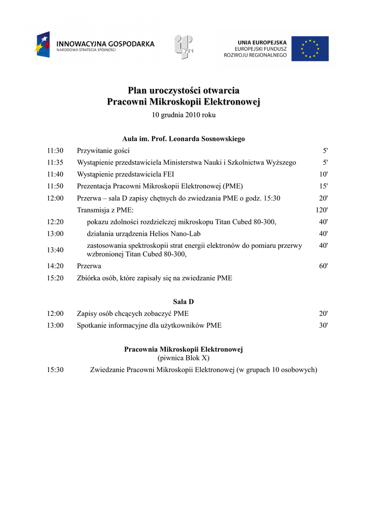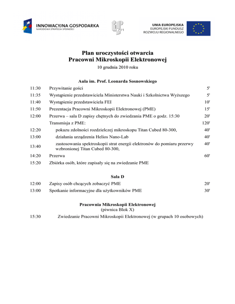 Plan uroczystości otwarcia Pracowni Mikroskopii Elektronowej 10 grudnia 2010 roku Aula im. Prof. Leonarda Sosnowskiego 11:30 Przywitanie gości 5' 11:35 Wystąpienie przedstawiciela Ministerstwa Nauki i Szkolnictwa Wyższego 5' 11:40 Wystąpienie przedstawiciela FEI 10' 11:50 Prezentacja Pracowni Mikroskopii Elektronowej (PME) 15' 12:00 Przerwa – sala D zapisy chętnych do zwiedzania PME o godz. 15:30 20' Transmisja z PME: 120' 12:20 pokazu zdolności rozdzielczej mikroskopu Titan Cubed 80-300, 40' 13:00 działania urządzenia Helios Nano-Lab 40' 13:40 zastosowania spektroskopii strat energii elektronów do pomiaru przerwy wzbronionej Titan Cubed 80-300, 40' 14:20 Przerwa 60' 15:20 Zbiórka osób, które zapisały się na zwiedzanie PME Sala D 12:00 Zapisy osób chcących zobaczyć PME 20' 13:00 Spotkanie informacyjne dla użytkowników PME 30' Pracownia Mikroskopii Elektronowej (piwnica Blok X) 15:30 Zwiedzanie Pracowni Mikroskopii Elektronowej (w grupach 10 osobowych)