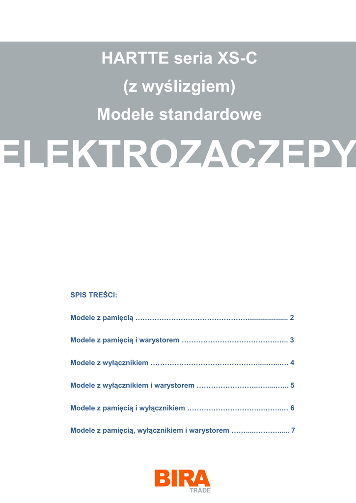HARTTE seria XS-C (z wyślizgiem) Modele standardowe ELEKTROZACZEPY SPIS TREŚCI: Modele z pamięcią …………………………………………................... 2 Modele z pamięcią i warystorem ………………………………….….. 3 Modele z wyłącznikiem ………………………………………....…...…. 4 Modele z wyłącznikiem i warystorem ……………………..….....…... 5 Modele z pamięcią i wyłącznikiem …………………………..……..… 6 Modele z pamięcią, wyłącznikiem i warystorem …….....………...... 7 modele z pamięcią Elektrozaczep Hartte serii XS-C służy do zdalnego przewodowego otwierania drzwi, szafek lub furtek, stosowany do współpracy z systemami kontroli dostępu, domofonami, czytnikami kart. Serię XS-C cechują niewielkie rozmiary, symetryczna budowa, regulowany zaczep o radialnym kształcie z wbudowanym wyślizgiem. Wbudowany wyślizg prowadzi język zamka klamkowego osłaniając ościeżnicę przed uszkodzeniem. Zalecany jest do drzwi bezprzylgowych. Funkcja pamięci (P) sprawia, że elektrozaczep po otrzymaniu impulsu otrzymuje stan jednorazowego zwolnienia języka do momentu otwarcia. Charakterystyka: typ pracy NC (normalnie zamknięty) wymiary - szerokość 19 (23,5) mm, wysokość 67 mm, głębokość 28 mm wytrzymałość mechaniczna – nacisk 3000N (300 kg) wytrzymałość mechaniczna – cykle otwierania 200.000 z funkcją pamięci radialny kształt zaczepu- podczas otwierania zaczep nie wychodzi poza obrys elektrozaczepu regulowany zaczep w zakresie 3 mm do drzwi lewych i prawych ELEKTROZACZEPY Elektrozaczep HARTTE seria XS-C (z wbudowanym wyślizgiem) Dostępne wersje: 10-14V AC/DC– indeks XS12UP-C –zasilany prądem DC lub AC 21-26V AC/DC– indeks XS24UP-C – uniwersalny, zasilany prądem DC lub AC Opcjonalnie: warystor (V) KATEGORIA 12AC/DC 24AC/DC Indeks XS12UP-C XS24UP-C Tolerancja napięcia (V) 10-14 21-26 17,6 60 Pobór prądu AC (mA) 480 280 Oporność (Ohm) Pobór prądu DC (mA) 680 400 Max. naprężenie drzwi przy AC (N) 140 150 80 80 2 2 Praca ciągła pod prądem (100%ED) nie nie BIRA TRADE Tomasz Bira Dębowa 4, 05816 Michałowice www.bira.pl tel. +48 22 723 9017 Strona 2 Max. naprężenie drzwi przy DC (N) Głośność (1=niska, 2=średnia,3=wysoka) modele z pamięcią i warystorem Elektrozaczep Hartte serii XS-C służy do zdalnego przewodowego otwierania drzwi, szafek lub furtek, stosowany do współpracy z systemami kontroli dostępu, domofonami, czytnikami kart. Serię XS-C cechują niewielkie rozmiary, symetryczna budowa, regulowany zaczep o radialnym kształcie z wbudowanym wyślizgiem. Wbudowany wyślizg prowadzi język zamka klamkowego osłaniając ościeżnicę przed uszkodzeniem. Zalecany jest do drzwi bezprzylgowych. Funkcja pamięci (P) sprawia, że elektrozaczep po otrzymaniu impulsu otrzymuje stan jednorazowego zwolnienia języka do momentu otwarcia. Warystor (V) chroni system kontroli dostępu przed szkodami wywołanymi przepięciami elektrycznymi. Charakterystyka: typ pracy NC (normalnie zamknięty) wymiary - szerokość 19 (23,5) mm, wysokość 67 mm, głębokość 28 mm wytrzymałość mechaniczna – nacisk 3000N (300 kg) wytrzymałość mechaniczna – cykle otwierania 200.000 z funkcją pamięci radialny kształt zaczepu- podczas otwierania zaczep nie wychodzi poza obrys elektrozaczepu regulowany zaczep w zakresie 3 mm do drzwi lewych i prawych ELEKTROZACZEPY Elektrozaczep HARTTE seria XS-C (z wbudowanym wyślizgiem) Dostępne wersje: 10-14V AC/DC– indeks XS12UP-C –zasilany prądem DC lub AC 21-26V – indeks XS24UP-C – uniwersalny, zasilany prądem DC lub AC KATEGORIA 12AC/DC 24AC/DC Indeks XS12UPV-C XS24UPV-C Tolerancja napięcia (V) 10-14 21-26 17,6 60 Pobór prądu AC (mA) 480 280 Pobór prądu DC (mA) 680 400 Max. naprężenie drzwi przy AC (N) 140 150 Max. naprężenie drzwi przy DC (N) 80 80 Oporność (Ohm) 2 2 Praca ciągła pod prądem (100%ED) nie nie BIRA TRADE Tomasz Bira Dębowa 4, 05816 Michałowice www.bira.pl tel. +48 22 723 9017 Strona 3 Głośność (1=niska, 2=średnia,3=wysoka) modele z wyłącznikiem Elektrozaczep Hartte serii XS-C służy do zdalnego przewodowego otwierania drzwi, szafek lub furtek, stosowany do współpracy z systemami kontroli dostępu, domofonami, czytnikami kart. Serię XS-C cechują niewielkie rozmiary, symetryczna budowa, regulowany zaczep o radialnym kształcie z wbudowanym wyślizgiem. Wbudowany wyślizg prowadzi język zamka klamkowego osłaniając ościeżnicę przed uszkodzeniem. Zalecany jest do drzwi bezprzylgowych. Wyłącznik (W), w który wyposażony jest elektrozaczep, umożliwia mechaniczne zwolnienie rygla, dzięki czemu elektrozaczep pozostaje czasowo otwarty bez zasilania prądem. Charakterystyka: typ pracy NC (normalnie zamknięty) wymiary - szerokość 19 (23,5) mm, wysokość 67 mm, głębokość 28 mm wytrzymałość mechaniczna – nacisk 3000N (300 kg) wytrzymałość mechaniczna – cykle otwierania 200.000 z funkcją pamięci radialny kształt zaczepu- podczas otwierania zaczep nie wychodzi poza obrys elektrozaczepu regulowany zaczep w zakresie 3 mm do drzwi lewych i prawych ELEKTROZACZEPY Elektrozaczep HARTTE seria XS-C (z wbudowanym wyślizgiem) Dostępne wersje: 10-14V AC/DC– indeks XS12UW-C –zasilany prądem DC lub AC 21-26V – indeks XS24UW-C – uniwersalny, zasilany prądem DC lub AC Opcjonalnie: warystor (V) KATEGORIA 12AC/DC 24AC/DC Indeks XS12UW-C XS24UW-C Tolerancja napięcia (V) 10-14 21-26 Oporność (Ohm) 17,6 60 Pobór prądu AC (mA) 480 280 Pobór prądu DC (mA) 680 400 Max. naprężenie drzwi przy AC (N) 140 150 Max. naprężenie drzwi przy DC (N) 80 80 2 2 Praca ciągła pod prądem (100%ED) nie nie BIRA TRADE Tomasz Bira Dębowa 4, 05816 Michałowice www.bira.pl tel. +48 22 723 9017 Strona 4 Głośność (1=niska, 2=średnia,3=wysoka) modele z wyłącznikiem i warystorem Elektrozaczep Hartte serii XS-C służy do zdalnego przewodowego otwierania drzwi, s