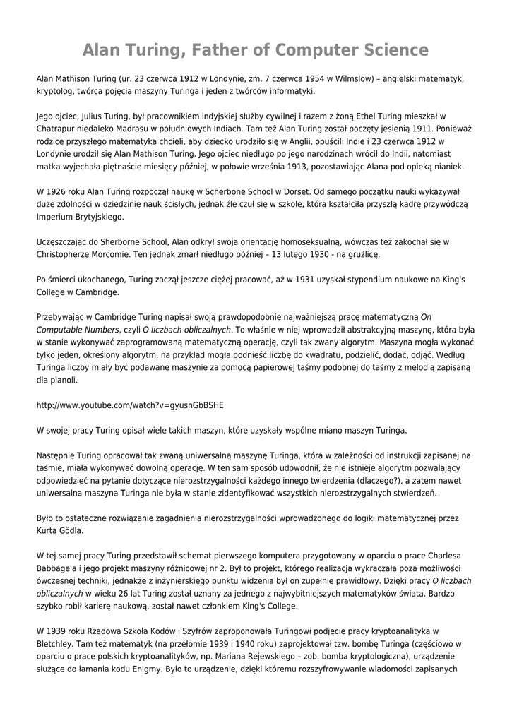Alan Turing, Father of Computer Science Alan Mathison Turing (ur. 23 czerwca 1912 w Londynie, zm. 7 czerwca 1954 w Wilmslow) – angielski matematyk, kryptolog, twórca pojęcia maszyny Turinga i jeden z twórców informatyki. Jego ojciec, Julius Turing, był pracownikiem indyjskiej służby cywilnej i razem z żoną Ethel Turing mieszkał w Chatrapur niedaleko Madrasu w południowych Indiach. Tam też Alan Turing został poczęty jesienią 1911. Ponieważ rodzice przyszłego matematyka chcieli, aby dziecko urodziło się w Anglii, opuścili Indie i 23 czerwca 1912 w Londynie urodził się Alan Mathison Turing. Jego ojciec niedługo po jego narodzinach wrócił do Indii, natomiast matka wyjechała piętnaście miesięcy później, w połowie września 1913, pozostawiając Alana pod opieką nianiek. W 1926 roku Alan Turing rozpoczął naukę w Scherbone School w Dorset. Od samego początku nauki wykazywał duże zdolności w dziedzinie nauk ścisłych, jednak źle czuł się w szkole, która kształciła przyszłą kadrę przywódczą Imperium Brytyjskiego. Uczęszczając do Sherborne School, Alan odkrył swoją orientację homoseksualną, wówczas też zakochał się w Christopherze Morcomie. Ten jednak zmarł niedługo później – 13 lutego 1930 - na gruźlicę. Po śmierci ukochanego, Turing zaczął jeszcze ciężej pracować, aż w 1931 uzyskał stypendium naukowe na King's College w Cambridge. Przebywając w Cambridge Turing napisał swoją prawdopodobnie najważniejszą pracę matematyczną On Computable Numbers, czyli O liczbach obliczalnych. To właśnie w niej wprowadził abstrakcyjną maszynę, która była w stanie wykonywać zaprogramowaną matematyczną operację, czyli tak zwany algorytm. Maszyna mogła wykonać tylko jeden, określony algorytm, na przykład mogła podnieść liczbę do kwadratu, podzielić, dodać, odjąć. Według Turinga liczby miały być podawane maszynie za pomocą papierowej taśmy podobnej do taśmy z melodią zapisaną dla pianoli. http://www.youtube.com/watch?v=gyusnGbBSHE W swojej pracy Turing opisał wiele takich maszyn, które uzyskały wspólne miano maszyn Turinga. Następnie Turing opracował tak zwaną uniwersalną maszynę Turinga, która w zależności od instrukcji zapisanej na taśmie, miała wykonywać dowolną operację. W ten sam sposób udowodnił, że nie istnieje algorytm pozwalający odpowiedzieć na pytanie dotyczące nierozstrzygalności każdego innego twierdzenia (dlaczego?), a zatem nawet uniwersalna maszyna Turinga nie była w stanie zidentyfikować wszystkich nierozstrzygalnych stwierdzeń. Było to ostateczne rozwiązanie zagadnienia nierozstrzygalności wprowadzonego do logiki matematycznej przez Kurta Gödla. W tej samej pracy Turing przedstawił schemat pierwszego komputera przygotowany w oparciu o prace Charlesa Babbage'a i jego projekt maszyny różnicowej nr 2. Był to projekt, którego realizacja wykraczała poza możliwości ówczesnej techniki, jednakże z inżynierskiego punktu widzenia był on zupełnie prawidłowy. Dzięki pracy O liczbach obliczalnych w wieku 26 lat Turing został uznany za jednego z najwybitniejszych matematyków świata. Bardzo szybko robił karierę naukową, został nawet członkiem King's College. W 1939 roku Rządowa Szkoła Kodów i Szyfrów zaproponowała Turingowi podjęcie pracy kryptoanalityka w Bletchley. Tam też matematyk (na przełomie 1939 i 1940 roku) zaprojektował tzw. bombę Turinga (częściowo w oparciu o prace polskich kryptoanalityków, np. Mariana Rejewskiego – zob. bomba kryptologiczna), urządzenie służące do łamania kodu Enigmy. Było to urządzenie, dzięki któremu rozszyfrowywanie wiadomości zapisanych przy użyciu niemieckiej maszyny szyfrującej Enigma było dużo prostsze, tańsze, a co najważniejsze – skuteczniejsze. Bletchley posiadało piętnaście takich bomb, każdą przeznaczoną do jednej wiadomości. W 1941 roku nastąpiła zmiana na stanowisku dyrektora Bletchley. Nowy szef, komandor Edward Travis zablokował kryptoanalitykom dostęp do funduszy na badania i budowę bomb. Wówczas Alan Turing i jego współpracownicy zwrócili się bezpośrednio do Winstona Churchilla po dotacje na prace związane z kryptoanalizą. Dotacje te otrzymali i w rok później Bletchley posiadało już czterdzieści dziewięć bomb. Powstała także stacja bomb w Gayhurst Manor. Wówczas (pośrednio) publicznie ogłoszono rekrutację do Bletchley, publikując w Daily Telegraph krzyżówkę. Sześciu czytelników, którzy poprawnie ją rozwiązali i przeszli specjalny test zorganizowany przez MI-6, zostało zatrudnionych razem z Turingiem w Bletchley. Po wojnie Alan Turing zaprojektował jeden z pierwszych elektronicznych, programowanych komputerów. Był również pomysłodawcą tak zwanego testu Turinga – eksperymentu będącego próbą formalnego zdefiniowania sztucznej inteligencji. Oskarżenie "o naruszenie moralności" i śmierć W 1952 roku włamano się do domu Alana Turinga, który poinformował o tym fakcie policję. W wyniku jej śledztwa Turing potwierdził, iż jest homoseksualistą. Wówczas został oskarżony o naruszenie "moralności publicznej", wytoczono przeciwko niemu proces. Sąd dał mu wybór: więzienie lub terapię hormonalną. Turing wybrał terapię – konsultacje z psychiatrą i roczną kurację hormonalną, polegającą na przyjmowaniu estrogenu (kastracja chemiczna). Skutkiem ubocznym kuracji była między innymi ginekomastia. Wskutek skazania stracił certyfikat dostępu do poufnych informacji oraz odsunięto go od badań związanych z konstrukcją komputera. 7 czerwca 1954 Alan Turing zamknął się w swojej sypialni i popełnił samobójstwo. Ponoć zjadł kawałek zatrutego cyjankiem jabłka. Ciało i nadgryzione jabłko znaleziono następnego dnia. Było to na dwa tygodnie przed 42 urodzinami matematyka. http://www.youtube.com/watch?v=5LHFzNMgWzw *** Premier Gordon Brown we wrześniu 2009 przeprosił w imieniu rządu Wielkiej