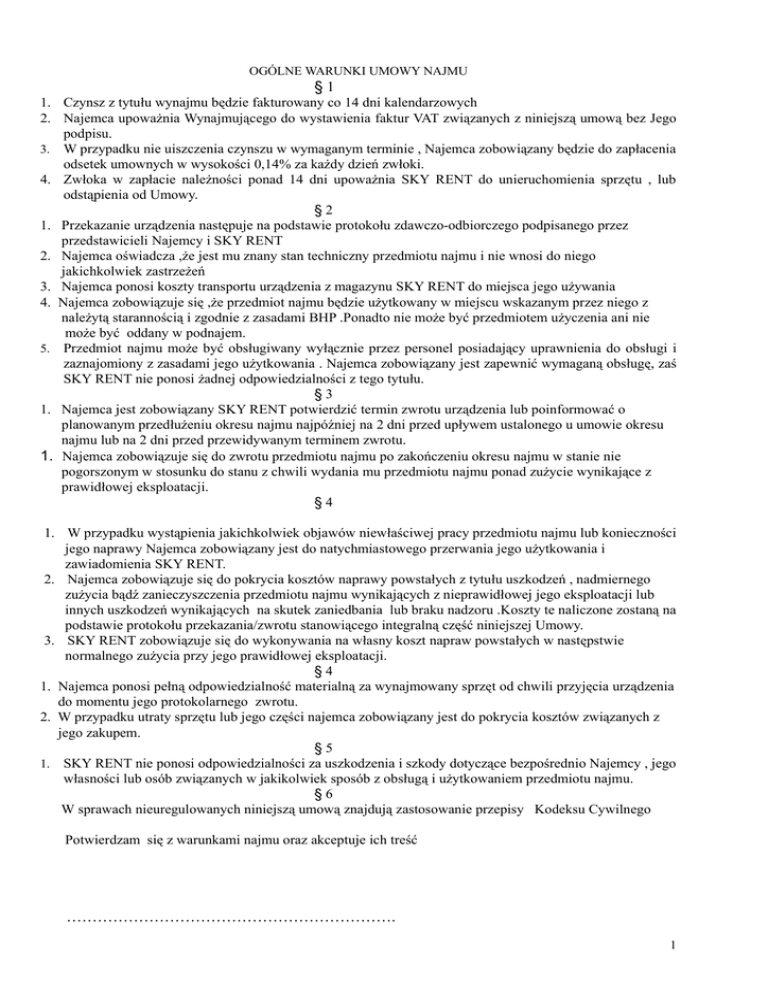 OGÓLNE WARUNKI UMOWY NAJMU §1 1. Czynsz z tytułu wynajmu będzie fakturowany co 14 dni kalendarzowych 2. Najemca upoważnia Wynajmującego do wystawienia faktur VAT związanych z niniejszą umową bez Jego podpisu. 3. W przypadku nie uiszczenia czynszu w wymaganym terminie , Najemca zobowiązany będzie do zapłacenia odsetek umownych w wysokości 0,14% za każdy dzień zwłoki. 4. Zwłoka w zapłacie należności ponad 14 dni upoważnia SKY RENT do unieruchomienia sprzętu , lub odstąpienia od Umowy. §2 1. Przekazanie urządzenia następuje na podstawie protokołu zdawczo-odbiorczego podpisanego przez przedstawicieli Najemcy i SKY RENT 2. Najemca oświadcza ,że jest mu znany stan techniczny przedmiotu najmu i nie wnosi do niego jakichkolwiek zastrzeżeń 3. Najemca ponosi koszty transportu urządzenia z magazynu SKY RENT do miejsca jego używania 4. Najemca zobowiązuje się ,że przedmiot najmu będzie użytkowany w miejscu wskazanym przez niego z należytą starannością i zgodnie z zasadami BHP .Ponadto nie może być przedmiotem użyczenia ani nie może być oddany w podnajem. 5. Przedmiot najmu może być obsługiwany wyłącznie przez personel posiadający uprawnienia do obsługi i zaznajomiony z zasadami jego użytkowania . Najemca zobowiązany jest zapewnić wymaganą obsługę, zaś SKY RENT nie ponosi żadnej odpowiedzialności z tego tytułu. §3 1. Najemca jest zobowiązany SKY RENT potwierdzić termin zwrotu urządzenia lub poinformować o planowanym przedłużeniu okresu najmu najpóźniej na 2 dni przed upływem ustalonego u umowie okresu najmu lub na 2 dni przed przewidywanym terminem zwrotu. 1. Najemca zobowiązuje się do zwrotu przedmiotu najmu po zakończeniu okresu najmu w stanie nie pogorszonym w stosunku do stanu z chwili wydania mu przedmiotu najmu ponad zużycie wynikające z prawidłowej eksploatacji. §4 1. W przypadku wystąpienia jakichkolwiek objawów niewłaściwej pracy przedmiotu najmu lub konieczności jego naprawy Najemca zobowiązany jest do natychmiastowego przerwania jego użytkowania i zawiadomienia SKY RENT. 2. Najemca zobowiązuje się do pokrycia kosztów naprawy powstałych z tytułu uszkodzeń , nadmiernego zużycia bądź zanieczyszczenia przedmiotu najmu wynikających z nieprawidłowej jego eksploatacji lub innych uszkodzeń wynikających na skutek zaniedbania lub braku nadzoru .Koszty te naliczone zostaną na podstawie protokołu przekazania/zwrotu stanowiącego integralną część niniejszej Umowy. 3. SKY RENT zobowiązuje się do wykonywania na własny koszt napraw powstałych w następstwie normalnego zużycia przy jego prawidłowej eksploatacji. §4 1. Najemca ponosi pełną odpowiedzialność materialną za wynajmowany sprzęt od chwili przyjęcia urządzenia do momentu jego protokolarnego zwrotu. 2. W przypadku utraty sprzętu lub jego części najemca zobowiązany jest do pokrycia kosztów związanych z jego zakupem. §5 1. SKY RENT nie ponosi odpowiedzialności za uszkodzenia i szkody dotyczące bezpośrednio Najemcy , jego własności lub osób związanych w jakikolwiek sposób z obsługą i użytkowaniem przedmiotu najmu. §6 W sprawach nieuregulowanych niniejszą umową znajdują zastosowanie przepisy Kodeksu Cywilnego Potwierdzam się z warunkami najmu oraz akceptuje ich treść ………………………………………………………. 1