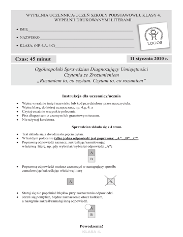 Sprawdzian klasa CZWARTA - Czytam ze zrozumieniem