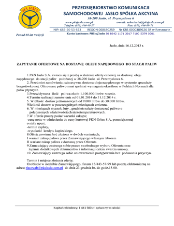 PRZEDSIĘBIORSTWO KOMUNIKACJI SAMOCHODOWEJ JASŁO SPÓŁKA AKCYJNA 38-200 Jasło, ul. Przemysłowa 6 www.pksjaslo.com.pl e-mail: [email protected] Telefon: (013) 446-40-27 Fax: (013) 446-89-76 NIP: 685-20-53-823 Ponad 60 lat tradycji REGON 000680259 Nr KRS 0000389626 SR w Rzeszowie Konto bankowe: PBS o/Jasło 80 8642 1171 2017 7100 5379 0001 Jasło, dnia 16.12.2013 r. ZAPYTANIE OFERTOWE NA DOSTAWĘ OLEJU NAPĘDOWEGO DO STACJI PALIW 1.PKS Jasło S.A. zwraca się z prośbą o złożenie oferty cenowej na dostawę oleju napędowego do stacji paliw położonej w 38-200 Jasło ul. Przemysłowa 6. 2. Przedmiot zamówienia; sukcesywna dostawa oleju napędowego w systemie sprzedaży bezgotówkowej. Oferowane paliwo musi spełniać wymagania określone w Polskich Normach dla paliw płynnych. 3.Przewidywana ilość paliwa około 1.100.000-litrów rocznie. 4.Termin realizacji zamówienia od 01.01.2014 do 31.12.2014 r. 5. Wielkość dostaw jednorazowych od 9.000 litrów do 30.000 litrów. Wielkość dostaw w poszczególnych miesiącach zmienna. 6. W miesiącach styczeń, luty , grudzień należy dostarczać paliwo o polepszonych właściwościach niskotemperaturowych. 7.W ofercie proszę podać warunki zakupu; -cenę netto w odniesieniu do ceny hurtowej PKN Orlen S.A. pomniejszonej o stały upust, -termin zapłaty, -wysokość kredytu kupieckiego. 8.Oferta powinna być złożona w dwóch wariantach; I wariant zakup paliwa przez Zamawiającego własnym taborem II wariant zakup paliwa z dostawą przez Oferenta. 9.Zamawiający zastrzega sobie prawo swobodnego wyboru Oferenta oraz żądania dodatkowych dokumentów i informacji celem zwarcia umowy. 10. Zamawiający zastrzega sobie unieważnienie postępowania bez podawania przyczyn. Termin i miejsce złożenia oferty; Osobiście w siedzibie Zamawiającego, faxem 13/443-57-99 lub pocztą elektroniczną na adres; [email protected] do dnia 23 grudnia br. do godz.15.00. Kapitał zakładowy: 1 441 500 zł opłacony w całości