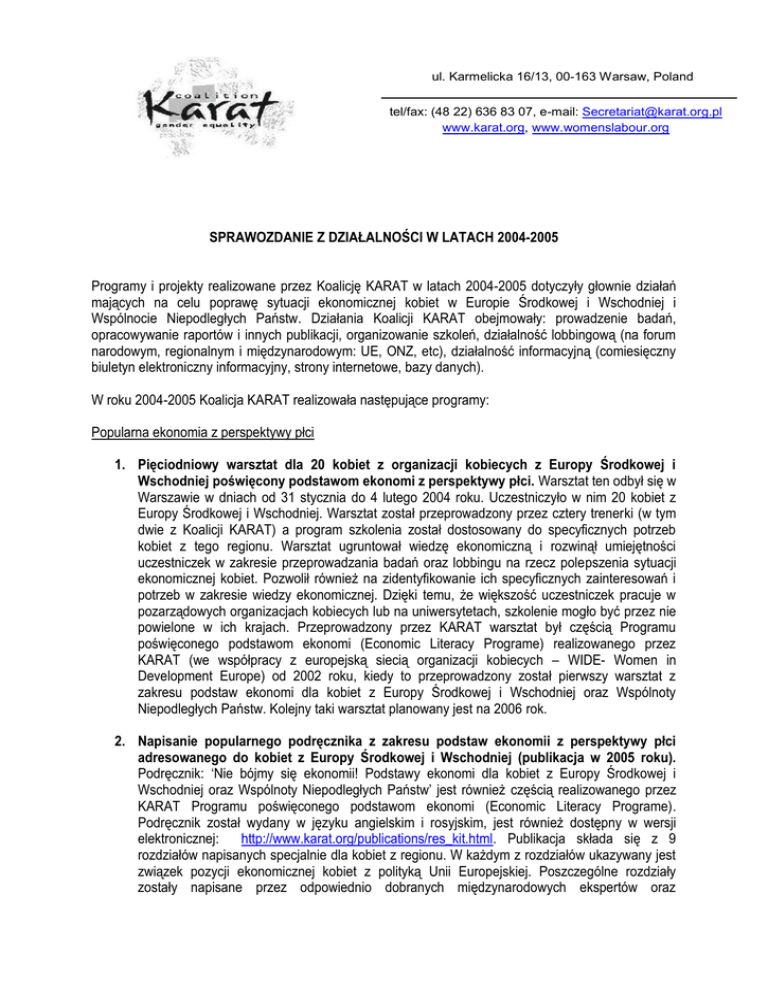 ul. Karmelicka 16/13, 00-163 Warsaw, Poland tel/fax: (48 22) 636 83 07, e-mail: [email protected] www.karat.org, www.womenslabour.org SPRAWOZDANIE Z DZIAŁALNOŚCI W LATACH 2004-2005 Programy i projekty realizowane przez Koalicję KARAT w latach 2004-2005 dotyczyły głownie działań mających na celu poprawę sytuacji ekonomicznej kobiet w Europie Środkowej i Wschodniej i Wspólnocie Niepodległych Państw. Działania Koalicji KARAT obejmowały: prowadzenie badań, opracowywanie raportów i innych publikacji, organizowanie szkoleń, działalność lobbingową (na forum narodowym, regionalnym i międzynarodowym: UE, ONZ, etc), działalność informacyjną (comiesięczny biuletyn elektroniczny informacyjny, strony internetowe, bazy danych). W roku 2004-2005 Koalicja KARAT realizowała następujące programy: Popularna ekonomia z perspektywy płci 1. Pięciodniowy warsztat dla 20 kobiet z organizacji kobiecych z Europy Środkowej i Wschodniej poświęcony podstawom ekonomi z perspektywy płci. Warsztat ten odbył się w Warszawie w dniach od 31 stycznia do 4 lutego 2004 roku. Uczestniczyło w nim 20 kobiet z Europy Środkowej i Wschodniej. Warsztat został przeprowadzony przez cztery trenerki (w tym dwie z Koalicji KARAT) a program szkolenia został dostosowany do specyficznych potrzeb kobiet z tego regionu. Warsztat ugruntował wiedzę ekonomiczną i rozwinął umiejętności uczestniczek w zakresie przeprowadzania badań oraz lobbingu na rzecz polepszenia sytuacji ekonomicznej kobiet. Pozwolił również na zidentyfikowanie ich specyficznych zainteresowań i potrzeb w zakresie wiedzy ekonomicznej. Dzięki temu, że większość uczestniczek pracuje w pozarządowych organizacjach kobiecych lub na uniwersytetach, szkolenie mogło być przez nie powielone w ich krajach. Przeprowadzony przez KARAT warsztat był częścią Programu poświęconego podstawom ekonomi (Economic Literacy Programe) realizowanego przez KARAT (we współpracy z europejską siecią organizacji kobiecych – WIDE- Women in Development Europe) od 2002 roku, kiedy to przeprowadzony został pierwszy warsztat z zakresu podstaw ekonomi dla kobiet z Europy Środkowej i Wschodniej oraz Wspólnoty Niepodległych Państw. Kolejny taki warsztat planowany jest na 2006 rok. 2. Napisanie popularnego podręcznika z zakresu podstaw ekonomii z perspektywy płci adresowanego do kobiet z Europy Środkowej i Wschodniej (publikacja w 2005 roku). Podręcznik: „Nie bójmy się ekonomii! Podstawy ekonomi dla kobiet z Europy Środkowej i Wschodniej oraz Wspólnoty Niepodległych Państw‟ jest również częścią realizowanego przez KARAT Programu poświęconego podstawom ekonomi (Economic Literacy Programe). Podręcznik został wydany w języku angielskim i rosyjskim, jest również dostępny w wersji elektronicznej: http://www.karat.org/publications/res_kit.html. Publikacja składa się z 9 rozdziałów napisanych specjalnie dla kobiet z regionu. W każdym z rozdziałów ukazywany jest związek pozycji ekonomicznej kobiet z polityką Unii Europejskiej. Poszczególne rozdziały zostały napisane przez odpowiednio dobranych międzynarodowych ekspertów oraz pracowników Koalicji KARAT. Każdy z rozdziałów składa się z części teoretycznej oraz opisów ćwiczeń, które mogą być użyte podczas szkolenia kobiet z grupy docelowej. Podręcznik zawiera ilustracje i napisany jest „przyjaznym językiem‟. 3. Krajowe warsztaty z podstaw ekonomii z perspektywy płci w roku 2005. Dzięki wsparciu finansowemu Women in Development Europe (WIDE) oraz zaangażowaniu organizacji członkowskich (szczególnie Gender Education Research and Technologies oraz Women's Alliance for Development – obie z Bulgarii, a także Women's Center For Democracy and Human Rights z Serbii), które zdołały zgromadzić dodatkowe środki, trenerki Koalicji KARAT przeprowadziły dwa krajowe warsztaty z podstaw ekonomii z perspektywy płci, z uwzględnieniem specyfiki regionu Europy Środkowej i Wschodniej oraz Wspólnoty Niepodległych Państw. W pierwszym warsztacie, przeprowadzonym w Sofii (Bułgaria) 4-6 Listopada 2005, uczestniczyło 10 kobiet, przedstawicielek kobiecych i ekologicznych organizacji pozarządowych, jak również instytucji rządowych. Drugi warsztat został przeprowadzony w Suboticy (Serbia i Czarnogóra) w dniach 24-26 Listopada 2005. Uczestniczyło w nim 20 osób, reprezentujących pozarządowe organizacje kobiece, władze samorządowe oraz związki zawodowe. W 2006 roku Koalicja KaARAT przeprowadzi podobne warsztaty w Warszawie, Tbilisi (Gruzja) i Pradze (Czechy). Działalność informacyjna, komunikacyjna i wzmacniająca organizacje członkowskie 4. Czynności zwiększające efektywność organizacji: gromadzenie i rozpowszechnianie informacji. Działalność ta obejmuje prowadzenie strony internetowej Koalicji KARAT ( www.karat.org ), elektronicznego biuletynu informacyjnego „KARAT News” (w języku angielskim i rosyjskim) oraz prowadzenie grup dyskusyjnych Koalicji KARAT. Wszystkie te czynności mają na celu dostarczanie informacji, prowadzenie dyskusji wśród organizacji członkowskich Koalicji KARAT, informowanie wszystkich zainteresowanych o sytuacji kobiet w Europie Środkowej i Wschodniej i Wspólnocie Niepodległych Państw jak również o działalności Koalicji KARAT. www.karat.org dostarcza informacji na temat organizacji członkowskich KARATu (zamieszczone są tu linki do ich własnych stron internetowych), opisy aktualnych projektów prowadzonych przez KARAT, opis wcześniejszej działalności organizacji, inne informacje mające związek z sytuacją kobiet w regionie wraz z przydatnymi linkami. KARAT News – są wydawane raz w miesiącu w języku angielskim i rosyjskim. Biuletyn ten jest przeznaczony głównie dla pozarządowych organizacji kobiecych z Europy Środkowej i Wschodniej i Wspólnoty Niepodległych Państw. Zawiera informacje na temat działalności na rzecz praw kobiet w różnych krajach, nie tylko region