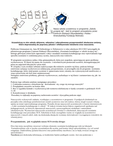 Nasza szkoła uczestniczy w programie „Szkoły uczącej się". Jest to program prowadzony przez Centrum Edukacji Obywatelskiej i Polsko Amerykańską Fundację Wolności. Uczestniczą w nim szkoły aktywne, odważne i zdecydowane przeprowadzić skuteczne zmiany, które doprowadzą do poprawy jakości i efektywności działania oraz nauczania. Publiczne Gimnazjum im. Jana III Sobieskiego w Żelistrzewie w roku szkolnym 2012/2013 przystąpiło do pilotażowego programu Centrum Edukacji Obywatelskiej „Ocenianie kształtujące w szkole uczącej się”, którego głównym celem było zapoznanie z ideą i zasadami oceniania kształtującego oraz wprowadzanie tego sposobu oceniania w codziennej pracy ucznia, nauczyciela oraz rodziców. W programie uczestniczy jedna z klas gimnazjalnych, która jest zespołem, sprawiającym spore problemy wychowawcze. W klasie tej mamy do czynienia z niewłaściwymi postawami uczniów, dezorganizującymi pracę na zajęciach lekcyjnych i poza nimi, W związku z tym zwołano zebranie nadzwyczajne dla rodziców uczniów tej klasy. podczas którego omówiono sytuację wychowawczo-edukacyjną, przypomniano, że przystąpiła ona do programu oceniania kształtującego, który miał pomóc uczniom w opanowaniu treści, niestety nie wykorzystywali możliwości, a wręcz przeciwnie nie byli nimi zainteresowani. Następnie omówiono problemy, głównie wychowawcze, zachodzące w tej klasie i zastanawiano się, jak im zaradzić. Podczas tego zebrania ustalono następujące procedury: 1. Codzienna rozmowa z dzieckiem np. dowiedzenie się, czego się nowego nauczyło? 2. Przeglądanie zeszytów na koniec dnia. 3. Raz w tygodniu kontakt z wychowawcą lub rozmowa telefoniczna w każdy czwartek w godzinach 10.4511.30 4. Konsekwencja w działaniu. Procedury te wpłynęły na poprawę zachowania uczniów i dyscyplinę podczas zajęć. Nauczyciele wykonywali zadania, wynikające z uczestnictwa w programie. O podjętych działaniach na początku roku szkolnego poinformowani zostali uczniowie oraz ich rodzice, którzy mogli wyrazić własną opinię na temat wprowadzanego programu. Ponadto dwoje nauczycieli uczestniczyło w kursie internetowym „ Lider oceniania kształtującego w szkole”. W trakcie trwania kursu liderzy organizowali spotkania rad pedagogicznych, na których zapoznawali nauczycieli z poszczególnymi modułami i materiałami szkoleniowymi. Wyznaczeni nauczyciele uczestniczyli również w szkoleniach, dotyczących oceniania kształtującego oraz procedury SUS. Szkolenia te były szczególnie ważne ze względu na uczestnictwo nauczycieli z innych szkól, stały się doskonałą okazją do wymiany doświadczeń i wyciągnięcia wniosków do własnej pracy. Przypomnienie, jak wyglądała nasza SUS-owska droga: Dwa lata temu zaczęliśmy stosować wybrane elementy oceniania kształtującego (ok) na lekcjach. Formułowaliśmy cele w języku zrozumiałym dla ucznia, pod koniec lekcji sprawdzaliśmy, czy cel został osiągnięty. Zadawaliśmy pytania kluczowe oraz podawaliśmy nacobezu ( na co będę zwracać uwagę na sprawdzianie.) Nacobezu jest doskonałą informacją, co konkretnie będzie podlegało ocenie. Jest ono podawane z odpowiednim wyprzedzeniem przed sprawdzianami i pracami klasowymi, uczy jak wybierać najważniejsze informacje z określonej partii materiału. Nauczyciele próbowali się też zmierzyć z najistotniejszym elementem oceniania kształtującego - oceną kształtującą, która służy do tego, aby uczeń uświadomił sobie, co zrobił dobrze, a co źle i jak może poprawić swoją pracę. Ocena kształtująca różni się zasadniczo od oceny sumującej ( stopnia; oceny, która obecnie funkcjonuje w szkole) tym, że zamiast cyfry, uczeń, otrzymuje szczegółową słowną lub pisemną informację. Informacja zwrotna (IZ) jest dialogiem nauczyciela z uczniem mającym pomóc uczniowi w uczeniu się. Najczęściej przyjmuje ona formę komentarza pisemnego lub ustnego do pracy ucznia. Powinniśmy pamiętać o niezbędnych czterech elementach informacji zwrotnej : - wyszczególnienie i docenienie pozytywnych stron pracy ucznia - odnotowanie tego, co wymaga poprawienia - wskazówki, w jaki sposób uczeń powinien poprawić swoją pracę - wskazówki , w jakim kierunku uczeń powinien pracować dalej Ocena koleżeńska i samoocena. Ocenianie kształtujące jest nauczaniem wspomagającym uczniów w ich procesie uczenia się. Między innymi oznacza to, że duża część odpowiedzialności za uczenie się spoczywa na uczniu. W ocenianiu kształtującym szukamy sposobów na to, aby uczniowie tę odpowiedzialność chcieli przejąć. Pomocne może być ograniczenie roli nauczyciela w ocenianiu prac uczniów i zachęcenie uczniów do oceny koleżeńskiej i samooceny. W szkole zwykle ściśle są określone role jakie pełni nauczyciel i uczeń. Nauczyciel ma obowiązek ucznia nauczyć, a uczeń jest odbiorcą wiedzy przekazywanej. Tak oto rozpoczęliśmy realizację projektu, odbyło się wiele szkoleń rady pedagogicznej oraz spotkań z liderami. Analizowaliśmy mocne i słabe strony naszej pracy, wdrażaliśmy ocenianie kształtujące, mając też na celu zaangażowanie jak największej liczby nauczycieli. Samodzielnie wybraliśmy cele : 1. Nauczyciele stosują wybrane elementy oceniania kształtującego. 2. Rodzice w większym stopniu współpracują ze szkołą. Określiliśmy wskaźniki, których pomiar miał za zadanie kontrolować realizację zadań i podjęliśmy odpowiednie działania, aby osiągnąć sukces. Nadszedł czas, żeby zaprezentować pracę naszej szkoły i podsumować naszą pracę. Jest wśród nas wielu, którzy świadomie myślą o procesie nauczania, stawiają na pierwszym miejscu ucznia i jego osiągnięcia i ta grupa wdraża skuteczne metody nauczania, do których należy ocenianie kształtujące. Widzimy efekty naszej pracy, dostrzegają je też rodzice, którzy zwracają uwagę na przydatność oceniania kształtującego.