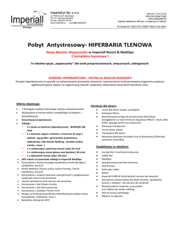 Pobyt Antystresowy- HIPERBARIA TLENOWA Nowy Wymiar Wypoczynku w Imperiall Resort & MediSpa 2 kompleksy basenowe ! To idealna opcja „wypoczynku” dla osób przepracowanych, zmęczonych, zabieganych. KOMORA HIPERBARYCZNA - JEDYNA W NASZYM REGIONIE!! Terapia hiperbaryczna to sposób na zahamowanie procesów starzenia i usprawnienie funkcjonowania organizmu poprzez ogólnoustrojowy wpływ na regenerację tkanek i poprawę odżywienia wszystkich komórek ciała. Oferta obejmuje: 7 Noclegów według wybranego rodzaju zakwaterowania Wyżywienie w formie bufetu szwedzkiego (śniadanie + obiadokolacja) Konsultacja terapeutyczna Zabiegi : 5 x Seans w Komorze Hiperbarycznej - NOWOŚĆ (60 min) 1 x dziennie zajęcia ruchowe z trenerem (5 zajęć / tydzień wg grafiku :gimnastyka krążeniowa, oddechowa, kijki Nordic Walking , aerobik wodny zumba, rower ) 1 x relaksacyjny częściowy masaż ciała( 25 min) 1 x relaksacyjny masaż głowy oraz barków ( 20 min) 1 x tybetański masaż stóp ( 20 min) 10% rabatu na pozostałe zabiegi w Imperiall MediSpa Korzystanie z basenu krytego (wydzielona strefa dla dzieci, zjeżdżalnia, Jacuzzi) Strefa Wellness (Sauna sucha, Łaźnia Parowa, Tężnia solankowa, Jacuzzi) Korzystanie z zespołu basenów zewnętrznych z podgrzewaną wodą (od czerwca do września) Jacuzzi zewnętrzne (od czerwca do września) Korzystanie z Sali Fitness Cardio Korzystanie z Sali Gimnastycznej Korzystanie z Outdoor Fitness Park Wstęp na Profesjonalne Boisko Wielofunkcyjne (piłka nożna, koszykówka, siatkówka, tenis ) Bezpłatny dostęp do WiFi Atrakcje dla dzieci: Lunch dla dzieci (zupka, przekąski) Dziecięce Menu Nielimitowany wstęp do przestronnej Sali Zabaw Joonglaland a w niej terrarium (legwany TRALA i LALA, żółw PIXEL, papuga ALEX) oraz akwarium Animacje tematyczne Liczne place zabaw Trampolina dla dzieci Akcesoria dziecięce do pokoi oraz w Restauracji (łóżeczka, wanienki, krzesełka) Dodatkowo w obiekcie: Lounge Bar z kuchnią tematyczną Lobby Bar MediSpa Sala gimnastyczna/sala taneczna Sala Kinowa Salon gier video Bilard Imperiall Caffe & Drink Bar(od czerwca do sierpnia) Zewnętrzny Świat Zabaw dla dzieci (tunele, zjeżdżalnie, baseny z kulkami –od czerwca do sierpnia) Wypożyczalnia rowerów, przyczepek oraz kijków do nordic walking Stół do tenisa stołowego Miejsce na ognisko SEZON NISKI 01.04.2016-21.05.2016 01.10.2016-23.12.2016 Cena za osobę SEZON ŚREDNI 29.05.2016-25.06.2016 03.09.2016-01.10.2016 Cena za osobę Pokój Standard (1 os) 1995 zł 2140 zł Pokój Standard (2, 3 os) 1475 zł 1545 zł Pokój Standard Plus (2, 3 os) 1545 zł 1615 zł Rodzinny (4 os) 1440 zł 1510 zł Apartament Lux (4 os) 1580 zł 1650 zł Domek Comfort (4 os) 1370 zł 1440 zł Bungalow (4 os) 1300 zł 1370 zł Rodzaj zakwaterowania Cena zawiera podatek VAT. Pobyty w Domku Komfort, Bungalow w terminach od 30.04.16-18.09.16. Pobyty w Apartamencie lux, Domek Komfort, Bungalow dla min.2 os dorosłych pełnopłatnych. Ceny nie dotyczą terminów okolicznościowych uwzględnionych w cenniku standardowym. Pobyty od soboty do soboty. Cennik opłat dodatkowych: Opłata miejscowa wg. stawki UG UM 2 zł/1 os. dor. ; 1 zł/1 dziecko, emeryt, rencista Parking Monitorowany - 15 zł/doba Pies - 100 zł/pierwsza doba, 20 zł/każda kolejna doba (Apartament Lux, Domek Comfort, Bungalow) Wcześniejszy check-in (w miarę dostępności 7:00 – 14:00) - 50 zł Cennik usług dodatkowych: Rower - 6 zł/godz., 50 zł/doba Przyczepka do roweru - 6 zł/godz. ; 50 zł/doba Kort tenisowy/Siatkówka boisko wielofunkcyjne - 60 zł/godz. Łóżeczko dziecięce – 30zł Wypożyczenie dodatkowego kompletu ręczników - 20zł Zmiana kompletu pościeli na życzenie – 30 zł Kwiaty - 100 zł Wino - 40 zł/butelka Kosz owoców - 30 zł Transfer do Kołobrzegu - 60 zł (do 6 osób) Transfer do Koszalina - 120 zł (do 6 osób) Transfer na lotnisko do Goleniowa - 260 zł (do 6 osób) Informacje dodatkowe: Doba hotelowa rozpoczyna się o godzinie 16:00 i kończy o godzinie 10:00 (rozpoczęcie obiadokolacją w dniu przyjazdu, zakończenie śniadaniem w dniu wyjazdu). Maksymalnie dwójka dzieci do 2 roku życia pobyt bezpłatny (na podstawie dnia wymeldowania). Przy zameldowaniu Goście zobowiązani są do okazania dokumentu poświadczającego wiek dziecka. UWAGA! Aby korzystać z bezpłatnych atrakcji na terenie ośrodka wszyscy nasi Goście są zobowiązani do noszenia opasek identyfikacyjnych na ręku. Jednocześnie informujemy, że utrata, zgubienie lub zniszczenie, a także udostępnienie paska identyfikacyjnego innym osobom, uniemożliwi Państwu korzystanie z naszych usług w pełnym zakresie. Opłata za powtórne otrzymanie opaski identyfikacyjnej wynosi 20 zł. Opłata za zgubienie karty do pokoju hotelowego lub klucza do Pokoju/Apartamentu/Domku/Bungalowu wynosi 30 zł. Imperiall Resort & MediSpa zastrzega sobie prawo do możliwości zmiany cennika w razie wzrostu kosztów eksploatacyjnych. W przypadku zaistnienia konieczności podwyższenia cen, ceny potwierdzonych rezerwacji nie ulegają zmianie. Imperiall Resort & MediSpa zastrzega sobie prawo do zmiany numeru apartamentu/domku/bungalowu/pokoju przydzielonego we wstępnej karcie rezerwacji. W celu dokonania pełnej rezerwacji należy wpłacić minimum 30% zadatku w terminie 3 dni. Dokonanie rezerwacji jest jednoznaczne z akceptacją Regulaminu Obiektu. Pozostała należność płatna w dniu przyjazdu. W przypadku rezygnacji do 30 dni przed rozpoczęciem pobytu zwrotowi podlega 50 % zadatku. W przypadku rezygnacji do 14 dni przed rozpoczęciem pobytu zwrotowi podlega 30 % zadatku. W przypadku rezygnacji późniejszej niż 14 dni przed rozpoczęciem pobytu zadatek nie podlega zwrotowi.