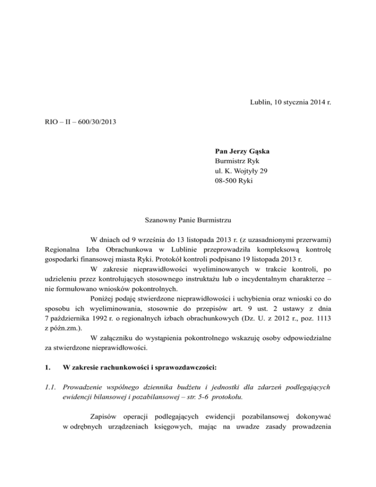 Lublin, 10 stycznia 2014 r. RIO – II – 600/30/2013 Pan Jerzy Gąska Burmistrz Ryk ul. K. Wojtyły 29 08-500 Ryki Szanowny Panie Burmistrzu W dniach od 9 września do 13 listopada 2013 r. (z uzasadnionymi przerwami) Regionalna Izba Obrachunkowa w Lublinie przeprowadziła kompleksową kontrolę gospodarki finansowej miasta Ryki. Protokół kontroli podpisano 19 listopada 2013 r. W zakresie nieprawidłowości wyeliminowanych w trakcie kontroli, po udzieleniu przez kontrolujących stosownego instruktażu lub o incydentalnym charakterze – nie formułowano wniosków pokontrolnych. Poniżej podaję stwierdzone nieprawidłowości i uchybienia oraz wnioski co do sposobu ich wyeliminowania, stosownie do przepisów art. 9 ust. 2 ustawy z dnia 7 października 1992 r. o regionalnych izbach obrachunkowych (Dz. U. z 2012 r., poz. 1113 z późn.zm.). W załączniku do wystąpienia pokontrolnego wskazuję osoby odpowiedzialne za stwierdzone nieprawidłowości. 1. W zakresie rachunkowości i sprawozdawczości: 1.1. Prowadzenie wspólnego dziennika budżetu i jednostki dla zdarzeń podlegających ewidencji bilansowej i pozabilansowej – str. 5-6 protokołu. Zapisów operacji podlegających ewidencji pozabilansowej dokonywać w odrębnych urządzeniach księgowych, mając na uwadze zasady prowadzenia 2 dziennika, określone w przepisach art. 14 ust. 1 i 2 ustawy z dnia 29 września 1994 r. o rachunkowości (Dz. U. z 2013 r. poz. 330 z późn. zm.), w tym obowiązek kolejnego numerowania zapisów. 1.2. Ewidencjonowanie operacji na kontach nieujętych w zakładowym planie kont – str. 6 protokołu. Zapisów o zdarzeniach dokonywać na kontach przewidzianych do stosowania w zakładowym planie kont, w związku z przepisami art. 10 ust. 1 pkt 3 lit. a ustawy o rachunkowości. Jeżeli ujęta w zakładowym planie kont liczba kont syntetycznych jest niewystarczająca w stosunku do potrzeb prowadzenia prawidłowej ewidencji – można uzupełnić je o konta dodatkowe, zgodne co do treści ekonomicznej, w tym również przy wykorzystaniu symboli kont, które nie mają zastosowania w jednostce lub o konta wskazane w planach kont ujętych w załącznikach do rozporządzenia, które mogą być dzielone na dwa lub więcej kont syntetycznych, zgodnie z przepisami § 15 ust. 1 pkt 1 i pkt 3 rozporządzenia Ministra Finansów z dnia 5 lipca 2010 r. w sprawie szczególnych zasad rachunkowości oraz planów kont dla budżetu państwa, budżetów jednostek samorządu terytorialnego, jednostek budżetowych, samorządowych zakładów budżetowych, państwowych funduszy celowych oraz państwowych jednostek budżetowych mających siedzibę poza granicami Rzeczypospolitej Polskiej (Dz. U. z 2013 r., poz. 289), powoływanego w dalszej części tego wystąpienia jako „rozporządzenie Ministra Finansów z dnia 5 lipca 2010 r.”. 1.3. Przypadki niezachowania systematyki zapisów, w tym nieprawidłowa ewidencja: - odsetek od należności budżetowych należnych na koniec kwartału i odpisów aktualizujących należności wątpliwe, - operacji na kontach dochodów i wydatków Urzędu Miasta dotycząca m.in. zwrotów nadpłat i zwrotów wydatków oraz nieewidencjonowanie rozrachunków z własnymi jednostkami organizacyjnymi z tytułu rozliczeń kosztów rozmów telefonicznych, - operacji związanych z realizacją dochodów z tytułu opłat za korzystanie z zezwoleń na sprzedaż napojów alkoholowych, - udziałów w podatku dochodowym od osób fizycznych i dochodów pobieranych przez urzędy skarbowe w księgach rachunkowych Urzędu Miasta oraz dochodów z tytułu podatków lokalnych (w wyniku ujmowania na koncie 130 „Rachunek bieżący jednostki” dochodów należnych za dany okres sprawozdawczy, a które wpłynęły w następnym okresie sprawozdawczym, wskutek czego w sprawozdaniu jednostkowym rocznym Rb-27S Urzędu Miejskiego w Rykach za 2012r. wykazano nieprawidłowe kwoty dochodów otrzymanych) – str. 7-9, 19, 26, 29-31 protokołu. Zapisów operacji gospodarczych w księgach rachunkowych dokonywać w porządku systematycznym, w związku z przepisami art. 15 ust. 1 ustawy 3 o rachunkowości i zasadami funkcjonowania kont określonymi w załącznikach Nr 2 i 3 do rozporządzenia Ministra Finansów z dnia 5 lipca 2010 r., w szczególności: a) odsetki od należności budżetowych, należnych na koniec kwartału, ujmować na koncie 221 „Należności z tytułu dochodów budżetowych” w korespondencji z kontem 720 „Przychody z tytułu dochodów budżetowych” (odsetki od należności podatkowych) lub z kontem 750 „Przychody finansowe” (odsetki od należności cywilnoprawnych); b) operacje związane z dokonywaniem odpisów aktualizujących wartość należności ujmować: Wn 761 „Pozostałe koszty operacyjne” (odpisy aktualizujące z tytułu dochodów budżetu), Wn 751 „Koszty finansowe” (odpisy aktualizujące należności finansowe), Ma 290 „Odpisy aktualizujące należności”; c) zrealizowane wydatki budżetowe, np. za rozmowy telefoniczne, ujmować zapisami: - wpływ faktury: Wn 402 „Usługi obce”, Ma 201 „Rozrachunki z odbiorcami i dostawcami”, - zapłata za fakturę: Wn 201 „Rozrachunki z odbiorcami i dostawcami”, Ma 130 „Rachunek bieżący jednostki”, - naliczenie kosztów rozmów telefonicznych podlegających refundacji przez jednostki organizacyjne miasta: Wn 240 „Pozostałe rozrachunki”, Ma 402 „Usługi obce”, - wpływ kwot stanowiących zwrot wydatków poniesionych przez Urząd Miasta: Wn 130 „Rachunek bieżący jednostki”, Ma 240 „Pozostałe rozrachunki” i dodatkowo - w celu zachowania zasady czystości obrotów na koncie 130 – wprowadzić techniczny zapis ujemny po obu stronach tego konta; d) realizację dochodów z tytułu opłat za korzystanie z zezwoleń na sprzedaż napojów alkoholowych oraz podatków lokalnych ewidencjonować: - przypis należności: Wn 221 „Należności z tytułu dochodów budżetowych”, Ma 720 „Przychody z tytułu dochodów bu