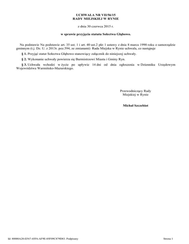 UCHWAŁA NR VII/56/15 RADY MIEJSKIEJ W RYNIE z dnia 30 czerwca 2015 r. w sprawie przyjęcia statutu Sołectwa Głąbowo. Na podstawie Na podstawie art. 35 ust. 1 i art. 40 ust.2 pkt 1 ustawy z dnia 8 marca 1990 roku o samorządzie gminnym (t.j. Dz. U. z 2013r. poz.594, ze zmianami) Rada Miejska w Rynie uchwala, co następuje § 1. Przyjąć statut Sołectwa Głąbowo stanowiący załącznik do niniejszej uchwały. § 2. Wykonanie uchwały powierza się Burmistrzowi Miasta i Gminy Ryn. § 3. Uchwała wchodzi w życie po upływie 14 dni od dnia ogłoszenia w Dzienniku Urzędowym Województwa Warmińsko-Mazurskiego. Przewodniczący Rady Miejskiej w Rynie Michał Szczebiot Id: 80000A20-EF67-45F6-AF9E-05F09C879D83. Podpisany Strona 1 Załącznik do Uchwały Nr VII/56/15 Rady Miejskiej w Rynie z dnia 30 czerwca 2015 r. STATUT SOŁECTWA Rozdział 1. Nazwa i teren działania § 1. 1 Ogół mieszkańców sołectwa Głąbowo stanowi Samorząd Mieszkańców Wsi. 2. Nazwa Samorządu Mieszkańców Wsi brzmi: Sołectwo Głąbowo. § 2. 1. Sołectwo jest jednostką pomocniczą Gminy, której mieszkańcy wspólnie z innymi sołectwami tworzą wspólnotę samorządową Gminy Ryn. 2. Sołectwo działa na podstawie przepisów prawa, a w szczególności: - ustawy z dnia 8 marca 1990r. o samorządzie gminnym (tekst jednolity Dz. U z 2013r. , poz. 594 ze zmianami) - uchwały Nr XXVII/221/13 Rady Miejskiej w Rynie z dnia 30 stycznia 2013 r. w sprawie Statutu Gminy Ryn - niniejszego Statutu. 3. Sołectwo nie posiada osobowości prawnej. § 3. Teren działania sołectwa obejmuje miejscowości: Głąbowo. Rozdział 2. Organizacja i zakres działania § 4. 1. Organami sołectwa są: 1) zebranie wiejskie, 2) sołtys. 2. Kadencja sołtysa i rady sołeckiej trwa 4 lata i kończy się w momencie wyboru nowych organów. 3. Działalność w organach sołectwa ma charakter społeczny. 4. Organy samorządu mieszkańców wsi obowiązane są dbać o przestrzeganie zasad demokracji, kolegialności, jawności. samorządności, § 5. 1. Zebranie wiejskie jest organem uchwałodawczym w sołectwie. 2. Sołtys jest organem wykonawczym sołectwa. 3. Rada sołecka wspomaga działalność sołtysa. § 6. 1. Do zadań sołectwa należy: 1) wszystkie sprawy publiczne sołectwa, niezastrzeżone ustawami i statutem gminy na rzecz organów samorządu terytorialnego, organów administracji rządowej i innych podmiotów, 2) występowanie do Rady Miejskiej o rozpatrzenie spraw publicznych sołectwa, których załatwienie wykracza poza możliwości sołectwa, 3) współpraca z właściwymi organami w zakresie ochrony zdrowia, pomocy społecznej, oświaty, kultury, kultury fizycznej, porządku publicznego, ochrony przeciwpożarowej, lokalizacji inwestycji. 2. Sołectwo może poprzez swoje organy wykonywać również inne zadania zlecone przez organy gminy lub inne podmioty. § 7. 1. Zebranie wiejskie jest organem Id: 80000A20-EF67-45F6-AF9E-05F09C879D83. Podpisany uchwałodawczym samorządu mieszkańców wsi. Strona 1 2. Prawo do udziału w zebraniu wiejskim mają wszyscy mieszkańcy sołectwa wyborcze do rad posiadający czynne prawo gmin. 3. Zebranie wiejskie zwołuje sołtys z własnej inicjatywy lub na wniosek: 1) co najmniej 1/5 mieszkańców uprawnionych do udziału w głosowaniu, 2) rady sołeckiej, 3) Burmistrza Miasta i Gminy Ryn, 4) Rady Miejskiej w Rynie. 4. Zebranie wiejskie zwoływane na wniosek osób i organów, o których mowa w ust.3 jest zwołać w terminie 7 dni od daty zgłoszenia wniosku. sołtys zobowiązany 5. Zebranie wiejskie odbywa się w miarę potrzeb, jednak nie rzadziej niż raz w roku. 6. Zebranie jest ważne, gdy zostali powiadomieni o nim wszyscy mieszkańcy w sposób zwyczajowo przyjęty i uczestniczy w nim przynajmniej 1/5 uprawnionych mieszkańców sołectwa. Przepisu tego nie stosuje się w przypadku, gdy zebranie odbywa się w drugim terminie – w odstępie 15 minut od terminu zwołania pierwszego zebrania. 7. Zebranie wiejskie podejmuje decyzje w formie uchwał, opinii i wniosków, które zapadają zwykłą większością głosów w głosowaniu jawnym (liczba głosów „za” jest większa od liczby głosów „przeciw”). 8. Zebranie może postanowić o przeprowadzeniu głosowania tajnego. § 8. Do wyłącznej kompetencji zebrania wiejskiego należy: 1) podejmowanie uchwał, wyrażanie opinii i kierowanie wniosków oraz realizację zadań w sprawach określonych w § 6, 2) wybór i odwołanie sołtysa, rady sołeckiej, 3) dokonywanie oceny działalności sołtysa i rady sołeckiej, 4) upoważnienie sołtysa do wykonywania określonych czynności, 5) zatwierdzenie planu finansowo – rzeczowego sołectwa, w tym zadań do realizacji ze środków Funduszu Sołeckiego. § 9. Zebranie wiejskie otwiera i przewodniczy obradom sołtys, a w przypadku jego nieobecności wyznaczona przez zebranie. osoba § 10. 1. Zebranie wiejskie jest protokołowane przez protokolanta wybranego przez zebranie. 2. Protokół podpisuje protokolant i przewodniczący obrad. 3. Uchwały, opinie i inne postanowienia podpisuje przewodniczący obrad. 4. Uchwały podejmowane przez samorząd mieszkańców nie mogą naruszać uprawnień innych podmiotów do podejmowania decyzji w sprawach określonych w § 5 ust. 1. 5. Uchwały i wnioski organ wykonawczy samorządu mieszkańców przekazuje Burmistrzowi, który zapewnia ich realizację i informuje samorząd o sposobie ich załatwienia w terminie 30 dni od dnia otrzymania. 6. W przypadku odmowy lub braku odpowiedzi w terminie określonym w ust. 5 – samorząd mieszkańców wsi może wnieść zastrzeżenia do Rady Miejskiej, gdy uzna, że istniejący stan lub podjęte rozstrzygnięcia naruszają istotne interesy mieszkańców. § 11. 1. Sołtys jest organem wykonawczym samorządu mieszkańców wsi. 2. Sołtys wykonuje funkcję reprezentanta sołectwa wobec władz, instytucji, organizacji, osób fizycznych i prawnych. 3. Sołtys korzysta z ochrony prawnej przysługującej funkcjonariuszom pu