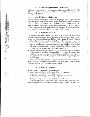.-------------------- ___ 2.1.1.1. Warstwa podstawna (rozrodcza) Warstwa podstawna jest utworzona przez jedną warstwę komórek. Około 50% z nich jest w trakcie mitozy, w której powstają komórki warstwy kolczystej, leżącej wyżej. 29 ___ 2.1.1.2. Warstwa kolczysta Stratum spinosum (lub żywa warstwa Malpighiego) składa się z komórek wielobocznych, silnie powiązanych za pomocą desmosomów, zbudowanych z białek. Cytoplazma tych komórek zawiera tonofilamenty, tzn. włókna również zbudowane z białek, które grupują się w pakiety - tonofibryle. Przemieszczając się ku powierzchni, różnicują się one biochemicznie i stają się coraz bardziej aktywne w procesach syntezy. ___ 2.1.1.3. Warstwa ziarnista Na poziomie warstwy ziarnistej następuje przetwarzanie podstawowych cząsteczek, odpowiedzialnych za charakter fizykochemiczny warstw wyższych, z tworzeniem ziaren keratohialiny i pojawieniem się ciałek Odlanda. • Ziarna keratohialiny składają się bądź z białka bogatego w cysteinę, która przyczynia się do budowania spoiwa międzywłókienkowego, bądź z fosfoproteiny bogatej w histydynę, profilagryny. Profilagryna jest prekursorem filagryny (filament aggregating proteine), białka, które spaja między sobą komórki w warstwie rogowej. • Ciałka Odlanda lub keratynosomy, lub membrane coating granules (MCG), są to organella produkujące lipidy i tworzące się na zewnątrz komórki z błony komórkowej. Uwalniają one lipidy, tworząc spoiwo międzykomórkowe warstwy rogowej podczas końcowej fazy procesu rogowacenia. W warstwie ziarnistej znajdują się jeszcze komórki żywe wraz z jądrem. W trakcie keratynizacji spłaszczają się, tracą jądro i przekształcają się w korneocyty, które tworzą warstwę rogową. 28 JS ____ 2.1.1.4. Warstwa rogowa Warstwa rogowa składa się z trzech warstw: • jasnej (obecnej tylko w zagłębieniu dłoni i na piętach); • zbitej, która jest właściwą warstwą rogową; • rozłącznej (najbardziej zewnętrznej, ulegającej złuszczaniu). ynowy Te trzy warstwy mają w sumie grubość około 10 urn. Warstwa rogowa ma właściwości i skład biochemiczny całkowicie różny od niżej położonych warstw naskórka. Komórki, które ją tworzą (kor- 39 , I