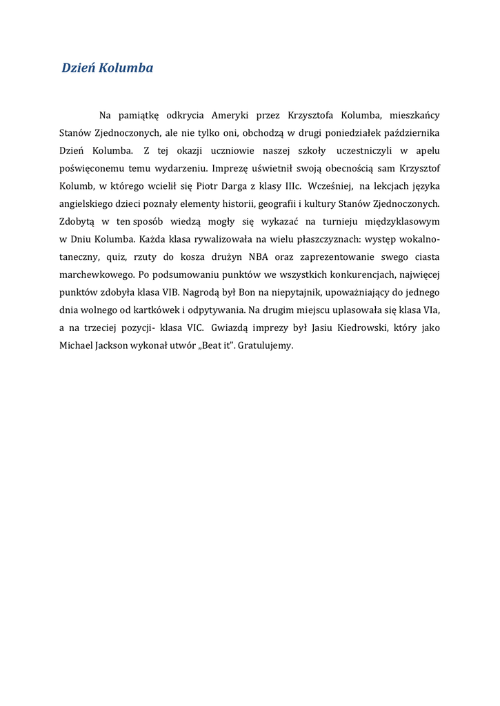 Dzień Kolumba Na pamiątkę odkrycia Ameryki przez Krzysztofa Kolumba, mieszkańcy Stanów Zjednoczonych, ale nie tylko oni, obchodzą w drugi poniedziałek października Dzień Kolumba. Z tej okazji uczniowie naszej szkoły uczestniczyli w apelu poświęconemu temu wydarzeniu. Imprezę uświetnił swoją obecnością sam Krzysztof Kolumb, w którego wcielił się Piotr Darga z klasy IIIc. Wcześniej, na lekcjach języka angielskiego dzieci poznały elementy historii, geografii i kultury Stanów Zjednoczonych. Zdobytą w ten sposób wiedzą mogły się wykazać na turnieju międzyklasowym w Dniu Kolumba. Każda klasa rywalizowała na wielu płaszczyznach: występ wokalnotaneczny, quiz, rzuty do kosza drużyn NBA oraz zaprezentowanie swego ciasta marchewkowego. Po podsumowaniu punktów we wszystkich konkurencjach, najwięcej punktów zdobyła klasa VIB. Nagrodą był Bon na niepytajnik, upoważniający do jednego dnia wolnego od kartkówek i odpytywania. Na drugim miejscu uplasowała się klasa VIa, a na trzeciej pozycji- klasa VIC. Gwiazdą imprezy był Jasiu Kiedrowski, który jako Michael Jackson wykonał utwór „Beat it”. Gratulujemy.