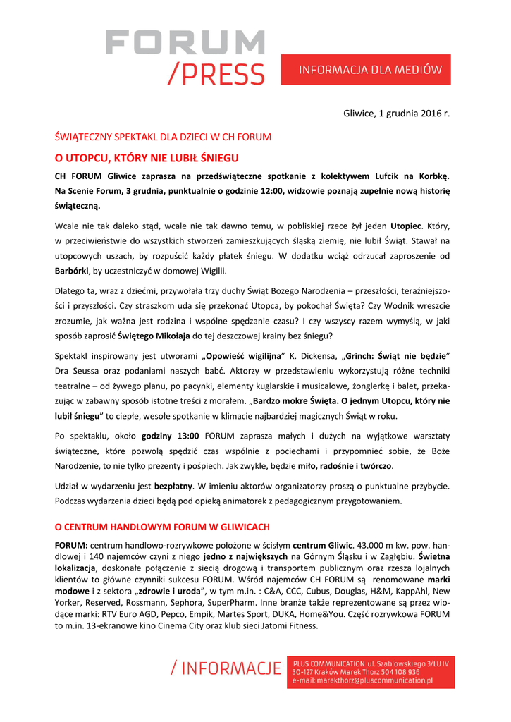 Gliwice, 1 grudnia 2016 r. ŚWIĄTECZNY SPEKTAKL DLA DZIECI W CH FORUM O UTOPCU, KTÓRY NIE LUBIŁ ŚNIEGU CH FORUM Gliwice zaprasza na przedświąteczne spotkanie z kolektywem Lufcik na Korbkę. Na Scenie Forum, 3 grudnia, punktualnie o godzinie 12:00, widzowie poznają zupełnie nową historię świąteczną. Wcale nie tak daleko stąd, wcale nie tak dawno temu, w pobliskiej rzece żył jeden Utopiec. Który, w przeciwieństwie do wszystkich stworzeń zamieszkujących śląską ziemię, nie lubił Świąt. Stawał na utopcowych uszach, by rozpuścić każdy płatek śniegu. W dodatku wciąż odrzucał zaproszenie od Barbórki, by uczestniczyć w domowej Wigilii. Dlatego ta, wraz z dziećmi, przywołała trzy duchy Świąt Bożego Narodzenia – przeszłości, teraźniejszości i przyszłości. Czy straszkom uda się przekonać Utopca, by pokochał Święta? Czy Wodnik wreszcie zrozumie, jak ważna jest rodzina i wspólne spędzanie czasu? I czy wszyscy razem wymyślą, w jaki sposób zaprosić Świętego Mikołaja do tej deszczowej krainy bez śniegu? Spektakl inspirowany jest utworami „Opowieść wigilijna” K. Dickensa, „Grinch: Świąt nie będzie” Dra Seussa oraz podaniami naszych babć. Aktorzy w przedstawieniu wykorzystują różne techniki teatralne – od żywego planu, po pacynki, elementy kuglarskie i musicalowe, żonglerkę i balet, przekazując w zabawny sposób istotne treści z morałem. „Bardzo mokre Święta. O jednym Utopcu, który nie lubił śniegu” to ciepłe, wesołe spotkanie w klimacie najbardziej magicznych Świąt w roku. Po spektaklu, około godziny 13:00 FORUM zaprasza małych i dużych na wyjątkowe warsztaty świąteczne, które pozwolą spędzić czas wspólnie z pociechami i przypomnieć sobie, że Boże Narodzenie, to nie tylko prezenty i pośpiech. Jak zwykle, będzie miło, radośnie i twórczo. Udział w wydarzeniu jest bezpłatny. W imieniu aktorów organizatorzy proszą o punktualne przybycie. Podczas wydarzenia dzieci będą pod opieką animatorek z pedagogicznym przygotowaniem. O CENTRUM HANDLOWYM FORUM W GLIWICACH FORUM: centrum handlowo-rozrywkowe położone w ścisłym centrum Gliwic. 43.000 m kw. pow. handlowej i 140 najemców czyni z niego jedno z największych na Górnym Śląsku i w Zagłębiu. Świetna lokalizacja, doskonałe połączenie z siecią drogową i transportem publicznym oraz rzesza lojalnych klientów to główne czynniki sukcesu FORUM. Wśród najemców CH FORUM są renomowane marki modowe i z sektora „zdrowie i uroda”, w tym m.in. : C&A, CCC, Cubus, Douglas, H&M, KappAhl, New Yorker, Reserved, Rossmann, Sephora, SuperPharm. Inne branże także reprezentowane są przez wiodące marki: RTV Euro AGD, Pepco, Empik, Martes Sport, DUKA, Home&You. Część rozrywkowa FORUM to m.in. 13-ekranowe kino Cinema City oraz klub sieci Jatomi Fitness. Strefa restauracyjna „Pod chmurami” o oryginalnej architekturze i stylistyce to przyjemne miejsce spotkań mieszkańców Gliwic, dodatkowo stanowiące o atrakcyjności rynkowej centrum handlowego. W centrum pod nazwą Biblioforum działa także jedyna w swoim rodzaju filia biblioteki publicznej. Właścicielem FORUM w Gliwicach jest DEKA Immobilien GmbH. Zarządcą Centrum Handlowego FORUM Gliwice jest międzynarodowa firma doradcza JLL. FORUM Gliwice jest laureatem prestiżowych nagród branżowych. Najważniejsze z nich to: Silver Solal Marketing Awards by ICSC w 2014, 2013, 2012, 2010, 2009; 2011 International Property Awards – Highly Commended; Wyróżnienia w programie PRCH Retail Awards w 2011 i 2015 r.; Nagrody Główna w konkursie PRCH Retail Awards w latach 2012 i 2016.