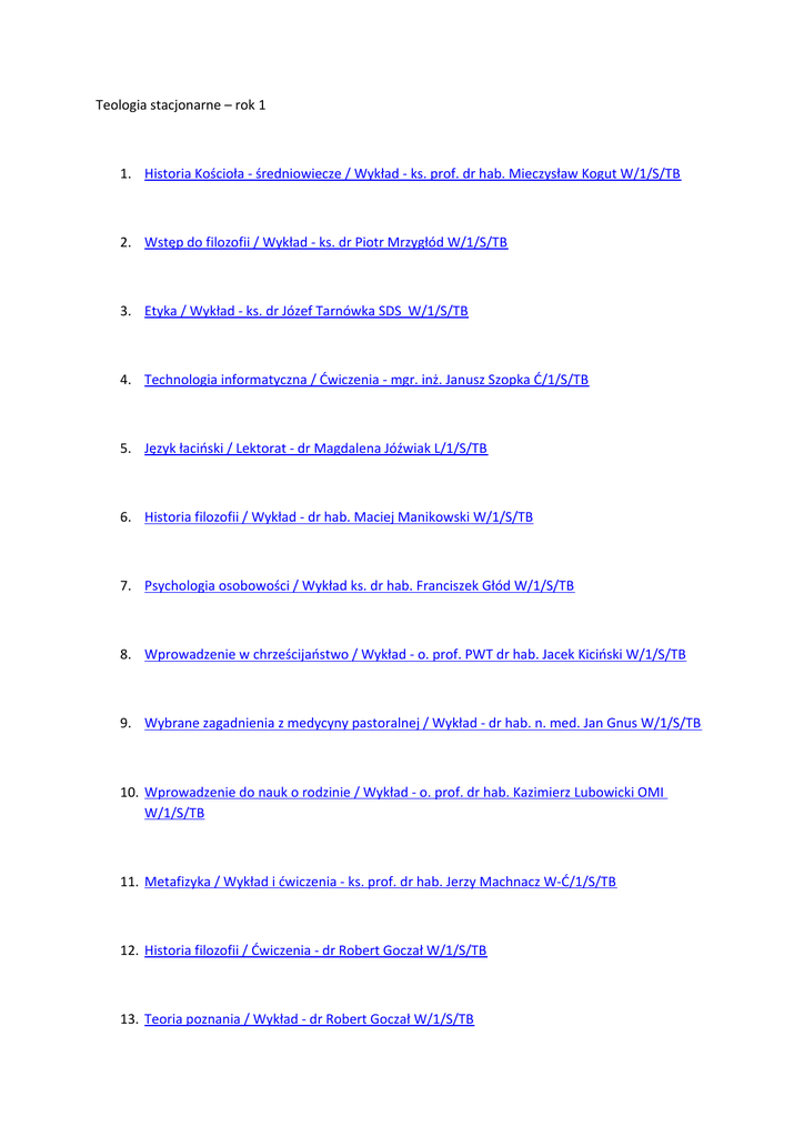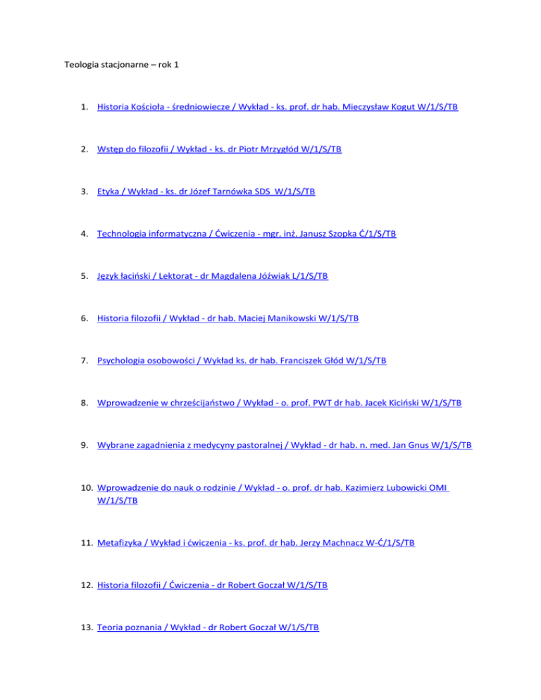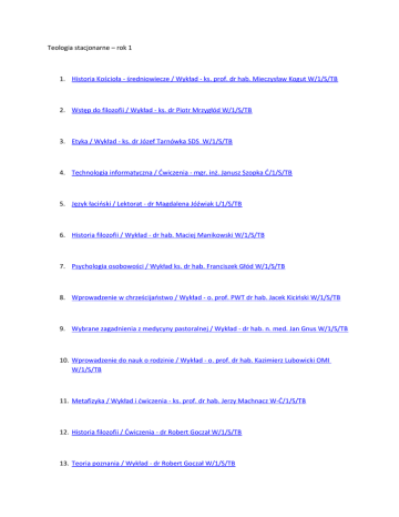 Teologia stacjonarne – rok 1 1. Historia Kościoła - średniowiecze / Wykład - ks. prof. dr hab. Mieczysław Kogut W/1/S/TB 2. Wstęp do filozofii / Wykład - ks. dr Piotr Mrzygłód W/1/S/TB 3. Etyka / Wykład - ks. dr Józef Tarnówka SDS W/1/S/TB 4. Technologia informatyczna / Ćwiczenia - mgr. inż. Janusz Szopka Ć/1/S/TB 5. Język łaciński / Lektorat - dr Magdalena Jóźwiak L/1/S/TB 6. Historia filozofii / Wykład - dr hab. Maciej Manikowski W/1/S/TB 7. Psychologia osobowości / Wykład ks. dr hab. Franciszek Głód W/1/S/TB 8. Wprowadzenie w chrześcijaństwo / Wykład - o. prof. PWT dr hab. Jacek Kiciński W/1/S/TB 9. Wybrane zagadnienia z medycyny pastoralnej / Wykład - dr hab. n. med. Jan Gnus W/1/S/TB 10. Wprowadzenie do nauk o rodzinie / Wykład - o. prof. dr hab. Kazimierz Lubowicki OMI W/1/S/TB 11. Metafizyka / Wykład i ćwiczenia - ks. prof. dr hab. Jerzy Machnacz W-Ć/1/S/TB 12. Historia filozofii / Ćwiczenia - dr Robert Goczał W/1/S/TB 13. Teoria poznania / Wykład - dr Robert Goczał W/1/S/TB 14. Historia i geografia biblijna / Wykład - ks. prof. dr hab. Mariusz Rosik W/1/S/TB 15. Język angielski / Lektorat - Kwiatkowska L/1/S/TB 16. Język angielski / Lektorat - Naglik L/1/S/TB 17. Język niemiecki / Lektorat - mgr Artur Krupa L/1/S/TB 18. Język niemiecki / Lektorat - mgr Agata Lesiewicz L/1/S/TB 19. Język włoski / Lektorat - dr Barbara Szubert L/1/S/TB 20. Język włoski / Lektorat - dr Anna Rambiert L/1/S/TB 21. Język francuski / Lektorat - mgr Anna Goździewicz L/1/S/TB