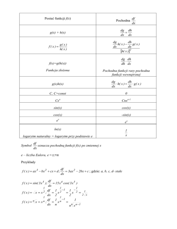 Postać funkcji f(x) Pochodna g(x) + h(x) dg dh + dx dx g( x ) f(x)= h( x ) dg dh h( x ) − g( x ) dx dx [h( x )]2 f(x)=g(h(x)) Funkcja złożona dg dh ⋅ dh dx Pochodna funkcji razy pochodna funkcji wewnętrznej g(x)h(x) dg dh ⋅ h( x ) + ⋅ g( x ) dx dx C, C=const 0 Cxn Cnxn-1 sin(x) cos(x) cos(x) -sin(x) ex ex ln(x) 1 x logarytm naturalny = logarytm przy podstawie e Symbol df oznacza pochodną funkcji f(x) po zmiennej x dx e – liczba Eulera, e ≈ 2,718 Przykłady f ( x ) = ax 3 − bx 2 + cx + d ; df = 3ax 2 − 2bx + c ; gdzie: a, b, c, d- stałe dx df = 15 x 4 cos( 3 x 5 ) dx 1 1 1 −1 1 − df 1 f ( x)= x = x2 ; = x2 = x 2 = 1 2 x dx 2 2 1 1 df 1 − 1 1 f ( x)= n x = xn ; = xn = n dx n n x n −1 f ( x ) = sin( 3 x 5 ); df dx