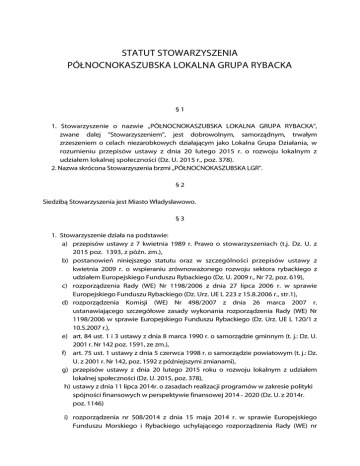 STATUT STOWARZYSZENIA PÓŁNOCNOKASZUBSKA LOKALNA GRUPA RYBACKA §1 1. Stowarzyszenie o nazwie „PÓŁNOCNOKASZUBSKA LOKALNA GRUPA RYBACKA", zwane dalej "Stowarzyszeniem", jest dobrowolnym, samorządnym, trwałym zrzeszeniem o celach niezarobkowych działającym jako Lokalna Grupa Działania, w rozumieniu przepisów ustawy z dnia 20 lutego 2015 r. o rozwoju lokalnym z udziałem lokalnej społeczności (Dz. U. 2015 r., poz. 378). 2. Nazwa skrócona Stowarzyszenia brzmi „PÓŁNOCNOKASZUBSKA LGR". §2 Siedzibą Stowarzyszenia jest Miasto Władysławowo. §3 1. Stowarzyszenie działa na podstawie: a) przepisów ustawy z 7 kwietnia 1989 r. Prawo o stowarzyszeniach (t.j. Dz. U. z 2015 poz. 1393, z późn. zm.), b) postanowień niniejszego statutu oraz w szczególności przepisów ustawy z kwietnia 2009 r. o wspieraniu zrównoważonego rozwoju sektora rybackiego z udziałem Europejskiego Funduszu Rybackiego (Dz. U. 2009 r., Nr 72, poz. 619), c) rozporządzenia Rady (WE) Nr 1198/2006 z dnia 27 lipca 2006 r. w sprawie Europejskiego Funduszu Rybackiego (Dz. Urz. UE L 223 z 15.8.2006 r., str.1), d) rozporządzenia Komisji (WE) Nr 498/2007 z dnia 26 marca 2007 r. ustanawiającego szczegółowe zasady wykonania rozporządzenia Rady (WE) Nr 1198/2006 w sprawie Europejskiego Funduszu Rybackiego (Dz. Urz. UE L 120/1 z 10.5.2007 r.), e) art. 84 ust. 1 i 3 ustawy z dnia 8 marca 1990 r. o samorządzie gminnym (t. j.: Dz. U. 2001 r. Nr 142 poz. 1591, ze zm.), f) art. 75 ust. 1 ustawy z dnia 5 czerwca 1998 r. o samorządzie powiatowym (t. j.: Dz. U. z 2001 r. Nr 142, poz. 1592 z późniejszymi zmianami), g) przepisów ustawy z dnia 20 lutego 2015 roku o rozwoju lokalnym z udziałem lokalnej społeczności (Dz. U. 2015, poz. 378), h) ustawy z dnia 11 lipca 2014r. o zasadach realizacji programów w zakresie polityki spójności finansowych w perspektywie finansowej 2014 - 2020 (Dz. U. z 2014r. poz. 1146) i) rozporządzenia nr 508/2014 z dnia 15 maja 2014 r. w sprawie Europejskiego Funduszu Morskiego i Rybackiego uchylającego rozporządzenia Rady (WE) nr j) k) l) m) n) o) 2328/2003, (WE) nr 861/2006, (WE) nr 1198/2006 i (WE) nr 791/2007 oraz rozporządzenie Parlamentu Europejskiego i Rady (UE) nr 1255/2011 (Dz. Urz. UE L 149 z 20.05.2014, str. 1). przepisów ustawy z dnia 20 lutego 2015 roku o wspieraniu rozwoju obszarów wiejskich z udziałem środków Europejskiego Funduszu Rolnego na rzecz Rozwoju Obszarów Wiejskich w ramach Programu Rozwoju Obszarów Wiejskich na lata 2014-2020. (Dz. U 2015 r., poz. 349), rozporządzenia Parlamentu Europejskiego i Rady (UE) Nr 1305/2013 z dnia 17 grudnia 2013 r. w sprawie wsparcia rozwoju obszarów wiejskich przez Europejski Fundusz Rolny na rzecz Rozwoju Obszarów Wiejskich (EFRROW) i uchylające rozporządzenie Rady (WE) nr 1698/2005, rozporządzenie Delegowanego Komisji (UE) Nr 807/2014 z dnia 11 marca 2014 r. uzupełniającego rozporządzenie Parlamentu Europejskiego i Rady (UE) nr 1305/2013 w sprawie wsparcia rozwoju obszarów wiejskich przez Europejski Fundusz Rolny na rzecz Rozwoju Obszarów Wiejskich (EFRROW) i wprowadzającego przepisy przejściowe, Rozporządzenia Wykonawczego Komisji (UE) Nr 808/2014 z dnia 17 lipca 2014 r. ustanawiającego zasady stosowania rozporządzenia Parlamentu Europejskiego i Rady (UE) nr 1305/2013 w sprawie wsparcia rozwoju obszarów wiejskich przez Europejski Fundusz Rolny na rzecz Rozwoju Obszarów Wiejskich (EFRROW), Rozporządzenia Parlamentu Europejskiego i Rady (UE) nr 508/2014 z dnia 15 maja 2014 r. w sprawie Europejskiego Funduszu Morskiego i Rybackiego, Rozporządzenia Parlamentu Europejskiego i Rady (UE) nr 1303/2013 z dnia 17 grudnia 2013 r. ustanawiającego wspólne przepisy dotyczące Europejskiego Funduszu Rozwoju Regionalnego, Europejskiego Funduszu Społecznego, Funduszu Spójności, Europejskiego Funduszu Rolnego na rzecz Rozwoju Obszarów Wiejskich oraz Europejskiego Funduszu Morskiego i Rybackiego oraz ustanawiającego przepisy ogólne dotyczące Europejskiego Funduszu Rozwoju Regionalnego, Europejskiego Funduszu Społecznego, Funduszu Spójności i Europejskiego Funduszu Morskiego i Rybackiego oraz uchylające rozporządzenie Rady (WE) nr 1083/2006. 2. Nadzór nad Stowarzyszeniem sprawuje Marszałek Województwa Pomorskiego (art. 16 ust. 1 pkt 2 ustawy z dnia 3 kwietnia 2009 r. o wspieraniu zrównoważonego rozwoju sektora rybackiego z udziałem Europejskiego Funduszu Rybackiego (Dz.U. Nr. 72 poz. 619) oraz art. 4 ust 3 pkt 2 ustawy z dnia 20 lutego 2015 roku o rozwoju lokalnym z udziałem lokalnej społeczności (Dz.U 2015 r. poz. 378). §4 1. Stowarzyszenie może być członkiem krajowych i międzynarodowych organizacji o podobnym celu działania. 2. Stowarzyszenie powołane jest na czas nieoznaczony. §5 1. Stowarzyszenie swoim działaniem obejmuje obszar Rzeczpospolitej Polskiej. 2. Stowarzyszenie może działać poza granicami Rzeczpospolitej Polskiej. §6 1. Głównym celem Stowarzyszenia jest działanie na rzecz rozwoju lokalnego i regionalnego, w tym poprawy sytuacji społecznej i gospodarczej obszaru Północnokaszubskiej LGR. poprzez realizację Lokalnej Strategii Rozwoju, zwanej dalej „LSR". 2. Do celów stowarzyszenia należą ponadto: 1) działanie na rzecz zrównoważonego rozwoju sektora rybactwa i obszarów zależnych od rybactwa i obszarów wiejskich, 2) aktywizacja społeczna, zawodowa i gospodarcza mieszkańców obszaru Północnokaszubskiej LGR, 3) łagodzenie skutków zmian strukturalnych w sektorze rybackim, w tym minimalizacja zaniku sektora rybackiego, 4) rekonwersja obszarów dotkniętych zmianami w sektorze rybackim, 5) poprawa jakości życia , szczególnie w społecznościach rybackich, 6) wspieranie rozwoju edukacji mieszkańców na obszarach zależnych od rybactwa i obszarach wiejskich oraz edukacja i rozpowszechnianie informacji o Unii Europejskiej, 7) restrukturyzacja i reorientacja działalności gospodarczej oraz wspieranie różnicowania działalności gospodarczej na obszarze