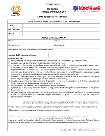 Fabryka Sztuk KONKURS „POZDROWIENIA Z…” Karta zgłoszenia do Konkursu DANE AUTORA PRAC ZGŁOSZONYCH DO KONKURSU IMIĘ NAZWISKO WIEK ADRES ZAMIESZKANIA: Ulica: Numer: Kod pocztowy: Miejscowość: Dane kontaktowe (tel. komórkowy lub stacjonarny, e-mail): Łączna ilość zgłoszonych prac: Oświadczam, że: a) zapoznałem/am się z Regulaminem Konkursu „Pozdrowienia z…” i akceptuję jego postanowienia, b) posiadam pełnię praw autorskich do zgłoszonych w Konkursie prac, c) przenoszę na Organizatora majątkowe prawa autorskie do treści przesłanych przez siebie wakacyjnych pozdrowień, zarówno tekstu, jak i rysunków oraz ilustracji, upoważniając go do ich: - rozpowszechniania w całości jak i w części poprzez publiczne wystawianie, umieszczenie na stronie internetowej Organizatora, publiczne wyświetlanie, umieszczanie w publikacjach wydawanych przez Organizatora, a także ich publiczne udostępnianie w każdej innej dostępnej formie, - utrwalania i zwielokrotniania w całości jak i w części dowolną techniką, w tym w szczególności w formie zapisu magnetycznego lub cyfrowego, a także w technice drukarskiej, d) powyższe uprawnienia zostają przyznane Organizatorowi na czas nieoznaczony, a dodatkowo upoważniają Organizatora do ich dalszego przenoszenia na osoby trzecie, e) teksty/rysunki nie były bądź nie są zgłaszane do innych konkursów, f) wyrażam zgodę na zasady Konkursu zawarte w Regulaminie Konkursu i potwierdzam określone w nim prawa Organizatora, g) wyrażam zgodę na wykorzystanie i przetwarzanie moich danych osobowych zgodnie z przepisami ustawy z dnia 29 sierpnia 1997 r. o ochronie danych osobowych (t. j. Dz. U. z 2002 r. Nr 101, poz. 926, z późniejszymi zmianami). ……………………………………………………………………………………………………………………………..………..………………………………………….……… czytelny podpis uczestnika, w przypadku osób niepełnoletnich dodatkowo rodzica lub opiekuna prawnego Poniższe oświadczenie wypełniają rodzice bądź opiekunowie prawni uczestnika będącego osobą niepełnoletnią: Oświadczam, że jestem rodzicem/opiekunem prawnym niepełnoletniego/ej ………………………………………………………………………………………………………………………………………………………………………………... imię i nazwisko niepełnoletniego uczestnika Konkursu i wyrażam zgodę na Jego/Jej udział w Konkursie „Pozdrowienia z…” organizowanym przez Fabrykę Sztuk. Oświadczam jednocześnie, że zapoznałem/am się z Regulaminem Konkursu i akceptuję jego zasady. ……………………………………………………………………………………………… czytelny podpis rodzica bądź opiekuna prawnego