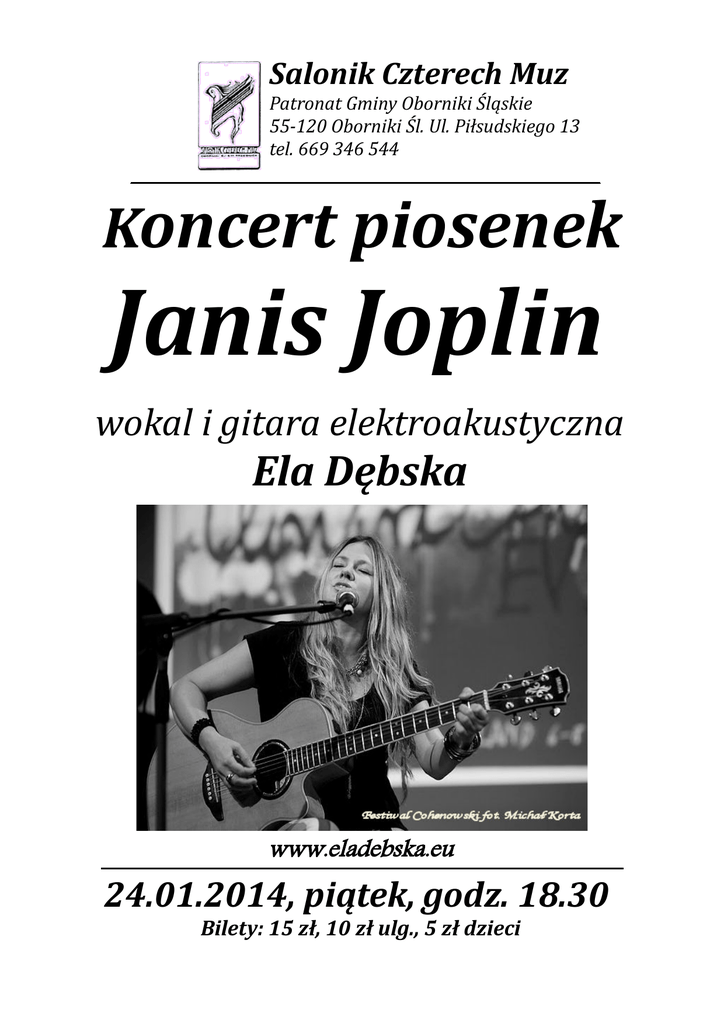 Salonik Czterech Muz Patronat Gminy Oborniki Śląskie 55-120 Oborniki Śl. Ul. Piłsudskiego 13 tel. 669 346 544 Koncert piosenek Janis Joplin wokal i gitara elektroakustyczna Ela Dębska www.eladebska.eu 24.01.2014, piątek, godz. 18.30 Bilety: 15 zł, 10 zł ulg., 5 zł dzieci