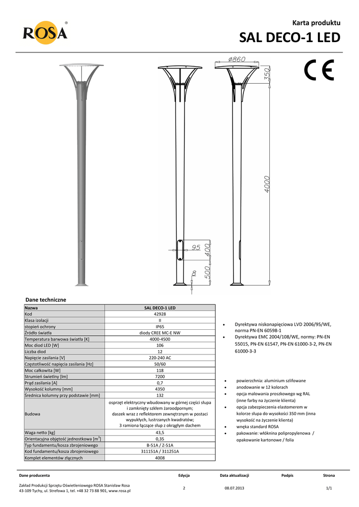 Karta produktu SAL DECO-1 LED Dane techniczne Nazwa Kod Klasa izolacji stopień ochrony Źródło światła Temperatura barwowa światła [K] Moc diod LED [W] Liczba diod Napięcie zasilania [V] Częstotliwość napięcia zasilania [Hz] Moc całkowita [W] Strumień świetlny [lm] Prąd zasilania [A] Wysokość kolumny [mm] Średnica kolumny przy podstawie [mm] Budowa SAL DECO-1 LED 42928 II IP65 diody CREE MC-E NW 4000-4500 106 12 220-240 AC 50/60 118 7200 0,7 4350 132 osprzęt elektryczny wbudowany w górnej części słupa i zamknięty szkłem żaroodpornym; daszek wraz z reflektorem zewnętrznym w postaci wypukłych, lustrzanych kwadratów; 3 ramiona łączące słup z okrągłym dachem Waga netto [kg] Orientacyjna objętość jednostkowa [m3] Typ fundamentu/kosza zbrojeniowego Kod fundamentu/kosza zbrojeniowego Komplet elementów złącznych Dane producenta Zakład Produkcji Sprzętu Oświetleniowego ROSA Stanisław Rosa 43-109 Tychy, ul. Strefowa 1, tel. +48 32 73 88 901, www.rosa.pl 43,5 0,35 B-51A / Z-51A 311151A / 311251A 4008 Dyrektywa niskonapięciowa LVD 2006/95/WE, norma PN-EN 60598-1 Dyrektywa EMC 2004/108/WE, normy: PN-EN 55015, PN-EN 61547, PN-EN 61000-3-2, PN-EN 61000-3-3 powierzchnia: aluminium szlifowane anodowanie w 12 kolorach opcja malowania proszkowego wg RAL (inne farby na życzenie klienta) opcja zabezpieczenia elastomerem w kolorze słupa do wysokości 350 mm (inna wysokość na życzenie klienta) wnęka standard ROSA pakowanie: włóknina polipropylenowa / opakowanie kartonowe / folia Edycja Data aktualizacji 2 08.07.2013 Podpis Strona 1/1