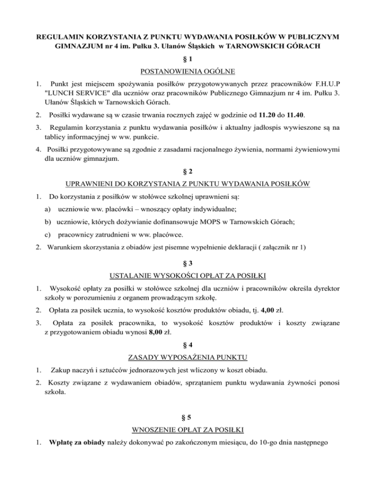 REGULAMIN KORZYSTANIA Z PUNKTU WYDAWANIA POSIŁKÓW W PUBLICZNYM GIMNAZJUM nr 4 im. Pułku 3. Ułanów Śląskich w TARNOWSKICH GÓRACH §1 POSTANOWIENIA OGÓLNE 1. 2. 3. Punkt jest miejscem spożywania posiłków przygotowywanych przez pracowników F.H.U.P "LUNCH SERVICE" dla uczniów oraz pracowników Publicznego Gimnazjum nr 4 im. Pułku 3. Ułanów Śląskich w Tarnowskich Górach. Posiłki wydawane są w czasie trwania rocznych zajęć w godzinie od 11.20 do 11.40. Regulamin korzystania z punktu wydawania posiłków i aktualny jadłospis wywieszone są na tablicy informacyjnej w ww. punkcie. 4. Posiłki przygotowywane są zgodnie z zasadami racjonalnego żywienia, normami żywieniowymi dla uczniów gimnazjum. §2 UPRAWNIENI DO KORZYSTANIA Z PUNKTU WYDAWANIA POSIŁKÓW 1. Do korzystania z posiłków w stołówce szkolnej uprawnieni są: a) uczniowie ww. placówki – wnoszący opłaty indywidualne; b) uczniowie, których dożywianie dofinansowuje MOPS w Tarnowskich Górach; c) pracownicy zatrudnieni w ww. placówce. 2. Warunkiem skorzystania z obiadów jest pisemne wypełnienie deklaracji ( załącznik nr 1) §3 USTALANIE WYSOKOŚCI OPŁAT ZA POSIŁKI 1. 2. 3. Wysokość opłaty za posiłki w stołówce szkolnej dla uczniów i pracowników określa dyrektor szkoły w porozumieniu z organem prowadzącym szkołę. Opłata za posiłek ucznia, to wysokość kosztów produktów obiadu, tj. 4,00 zł. Opłata za posiłek pracownika, to wysokość kosztów produktów i koszty związane z przygotowaniem obiadu wynosi 8,00 zł. §4 ZASADY WYPOSAŻENIA PUNKTU 1. Zakup naczyń i sztućców jednorazowych jest wliczony w koszt obiadu. 2. Koszty związane z wydawaniem obiadów, sprzątaniem punktu wydawania żywności ponosi szkoła. §5 WNOSZENIE OPŁAT ZA POSIŁKI 1. Wpłatę za obiady należy dokonywać po zakończonym miesiącu, do 10-go dnia następnego miesiąca na podstawie wyliczenia podanego przez pracownika szkoły, bezpośrednio na konto Publicznego Gimnazjum nr 4 im. Pułku 3. Ułanów Śląskich w Tarnowskich Górach: ING Bank Śląski S.A. : 25 1050 1230 1000 0090 3046 8194 Przy wpłacie na konto prosi się o podanie w tytule przelewu: - imienia i nazwiska ucznia, klasy, - za jaki miesiąc wnoszona jest opłata i za ile posiłków. 2. Brak wpłaty w ustalonym terminie uniemożliwi korzystanie z obiadów. §6 ZWROTY ZA NIEWYKORZYSTANE OBIADY 1. Nieobecność ucznia lub pracownika korzystającego posiłków należy zgłosić osobiście lub telefonicznie w sekretariacie szkoły w pierwszym dniu nieobecności do godziny 8.30 – w tym przypadku opłata za posiłek nie będzie naliczana. 2. W przypadku niezgłoszenia nieobecności ucznia koszty obiadów będą naliczane. 3. Rezygnacja z obiadów musi być zgłoszona pisemnie w sekretariacie szkoły, co najmniej 3 dni przed terminem dokonywanej zmiany. §7 ZASADY ZACHOWANIA W PUNKCIE WYDAWANIA POSIŁKÓW 1. 2. Podczas spożywania posiłków obowiązują zasady kulturalnego zachowania. Uczeń korzystający z obiadów i dożywiania zobowiązany jest do przestrzegania poleceń nauczycieli dyżurujących w punkcie wydawania posiłków i personelu wydającego posiłek. 3. Naczynia po spożyciu posiłku należy odstawić w wyznaczonym miejscu a pozostałości z obiadu umieścić w specjalnie do tego przeznaczonych pojemnikach. 4. Za szkody umyślnie spowodowane w stołówce odpowiada uczeń, a finansowo jego rodzice. 5. Zabronione jest wnoszenie do punktu wydawania posiłków okryć wierzchnich i plecaków. Miejscem ich przechowywania jest szkolna szatnia . 6. Za nie stosowanie się do regulaminu punktu wydawania posiłków uczeń może zostać skreślony z listy korzystających z obiadów. 7. Podczas wydawania obiadów (w godzinach 11.20 – 11.40) zabrania się pobytu w pomieszczeniu osobom, które nie spożywają posiłków. §8 POSTANOWIENIA KOŃCOWE 1. O wszystkich sprawach związanych z organizacją pracy punktu wydawania posiłków decyduje Dyrektor Publicznego Gimnazjum nr 4 im. Pułku 3. Ułanów Śląskich w Tarnowskich Górach . 2. Wszelkie zmiany w niniejszym regulaminie dokonuje dyrektor w postaci pisemnego aneksu.